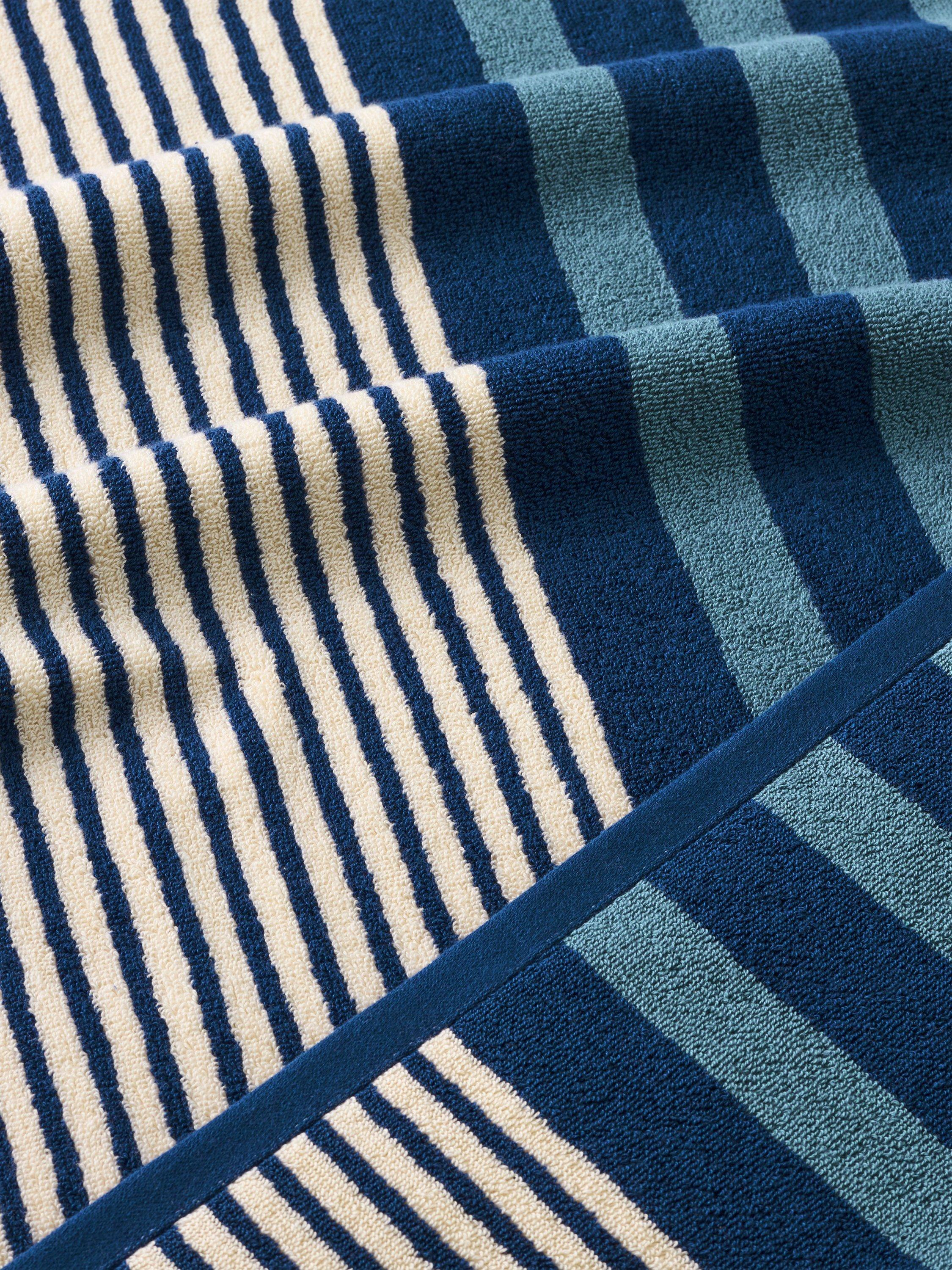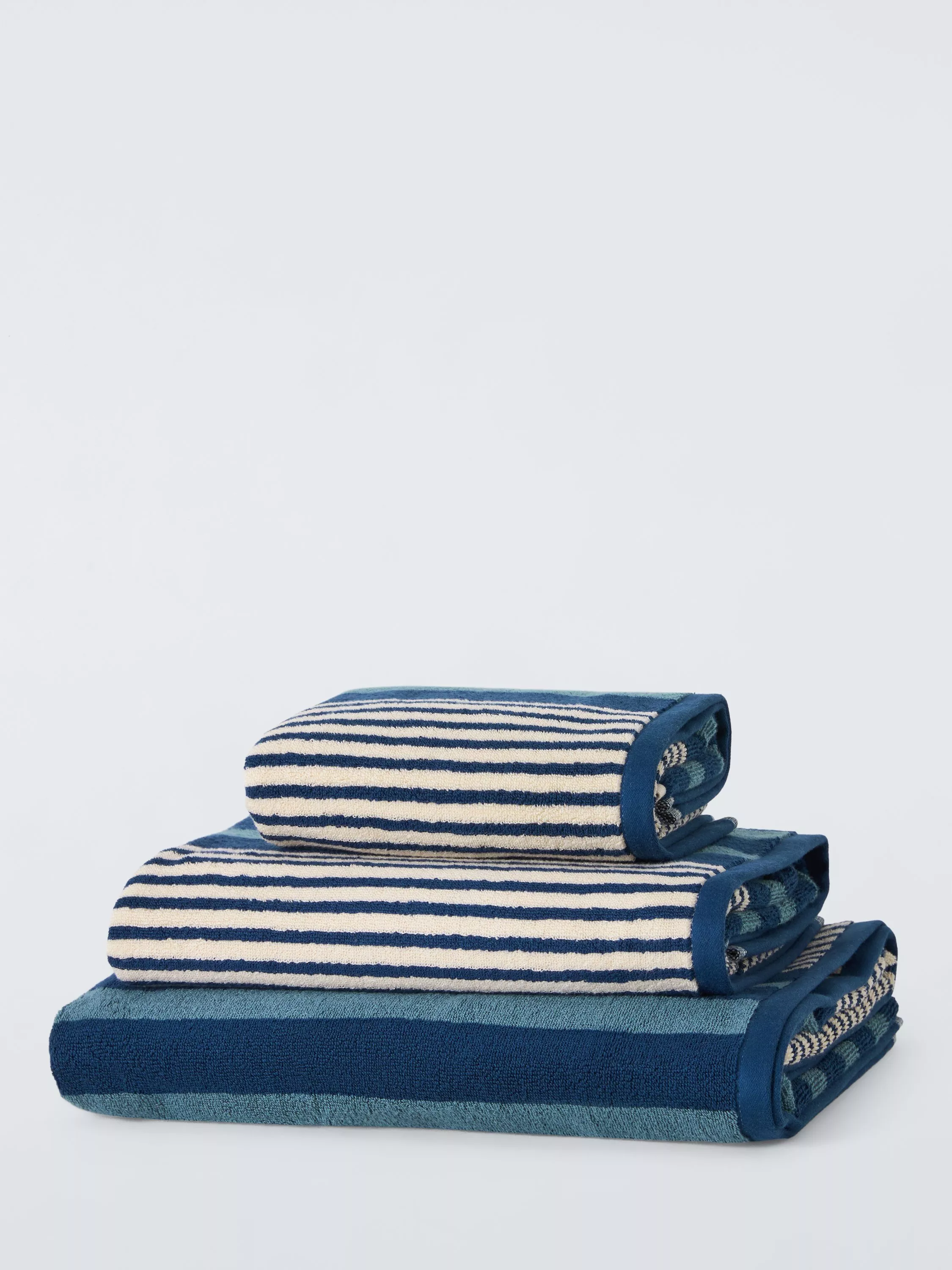 Graduated stripe looped pile towels in shades of blue and cream.