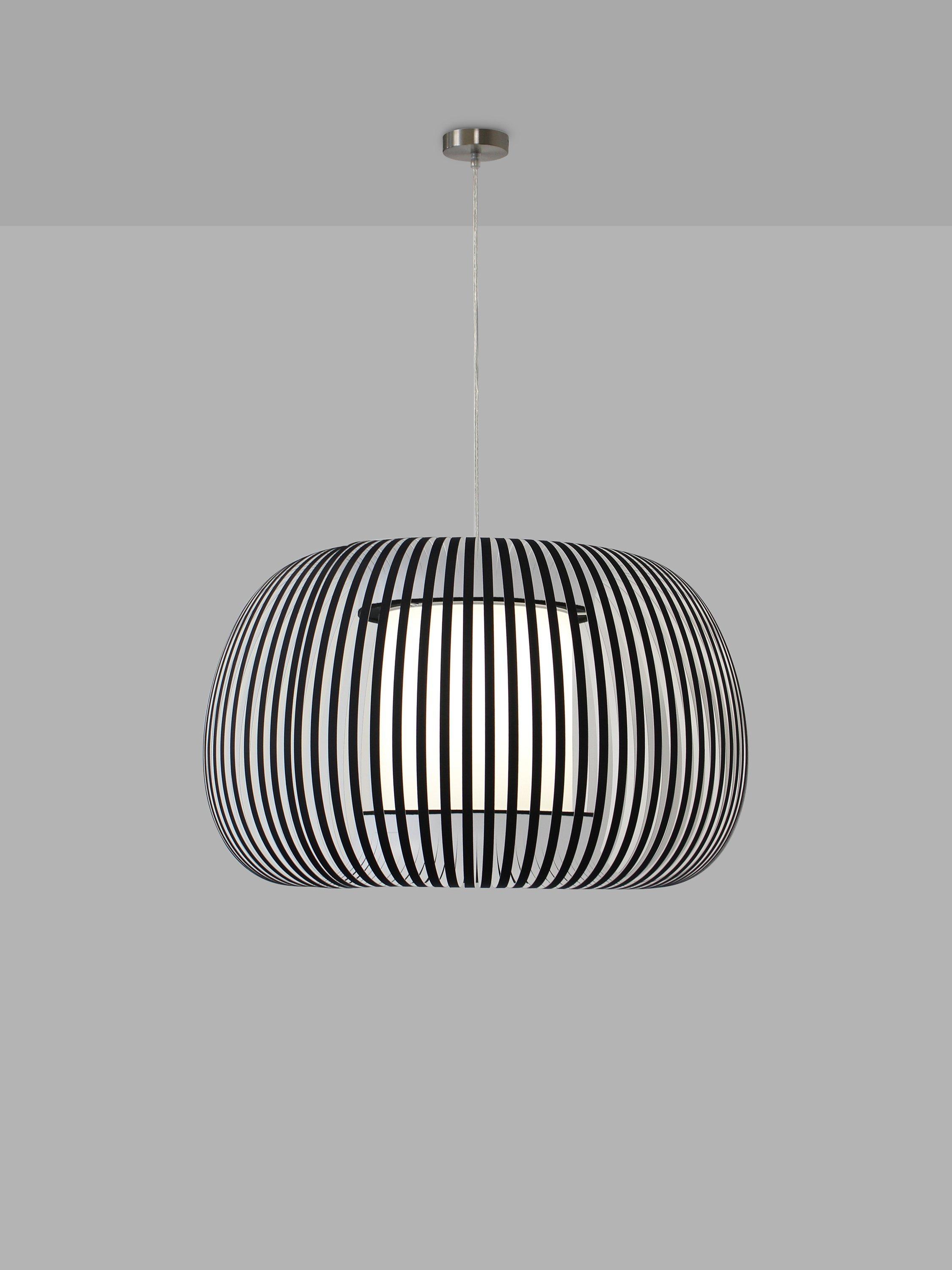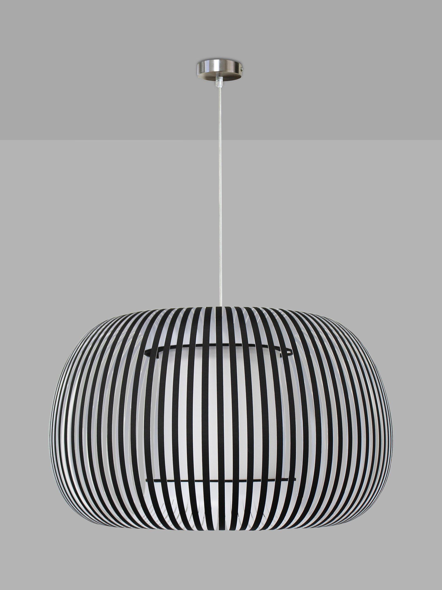 Our Harmony ceiling light has a ribboned lampshade with open segments. The light pours out of it, creating a central glowing orb. A visually striking light feature, the plastic is covered in a linen chintz which gives it a lavish finish. This pendant can be used as a shade only if required.