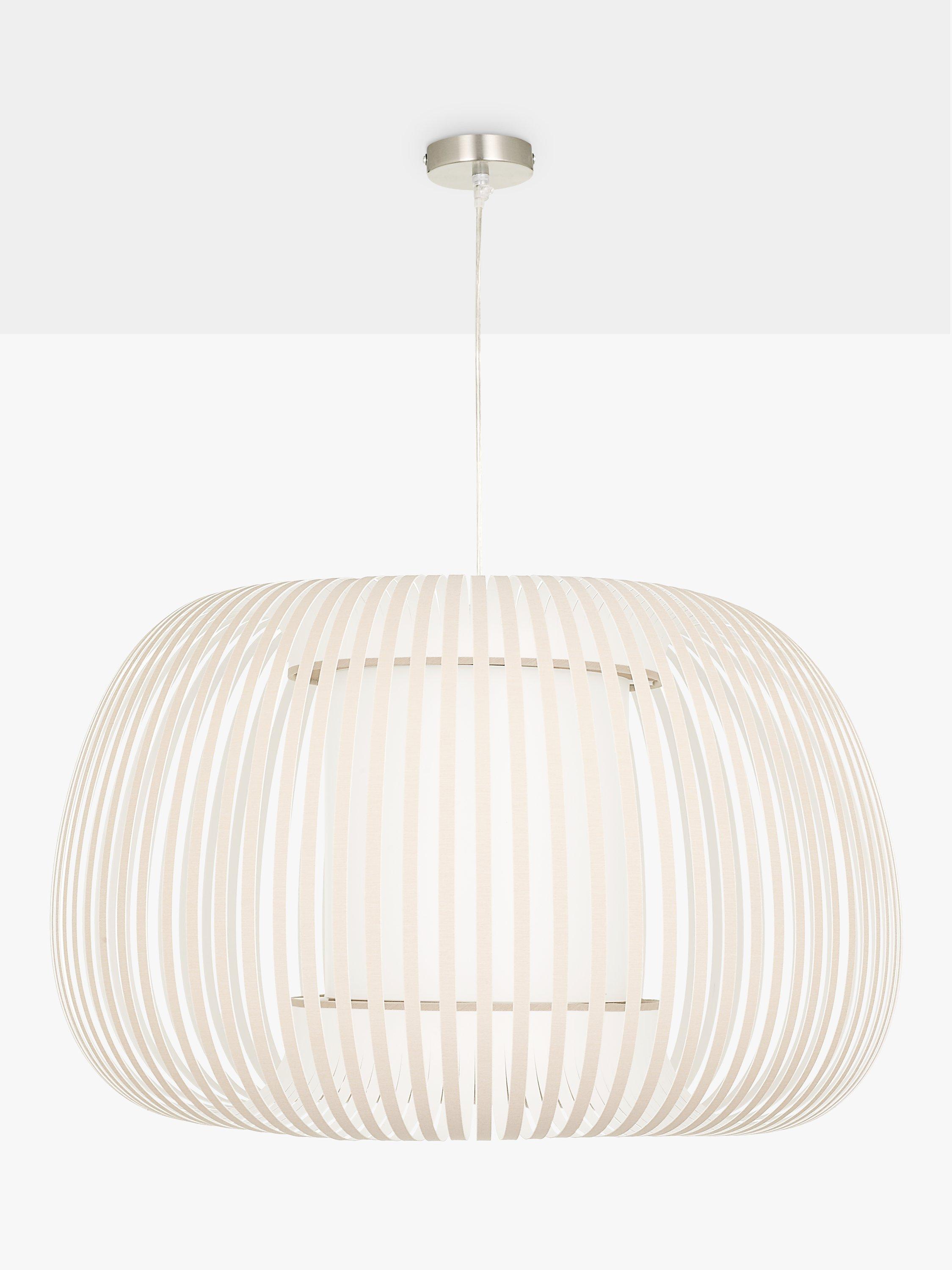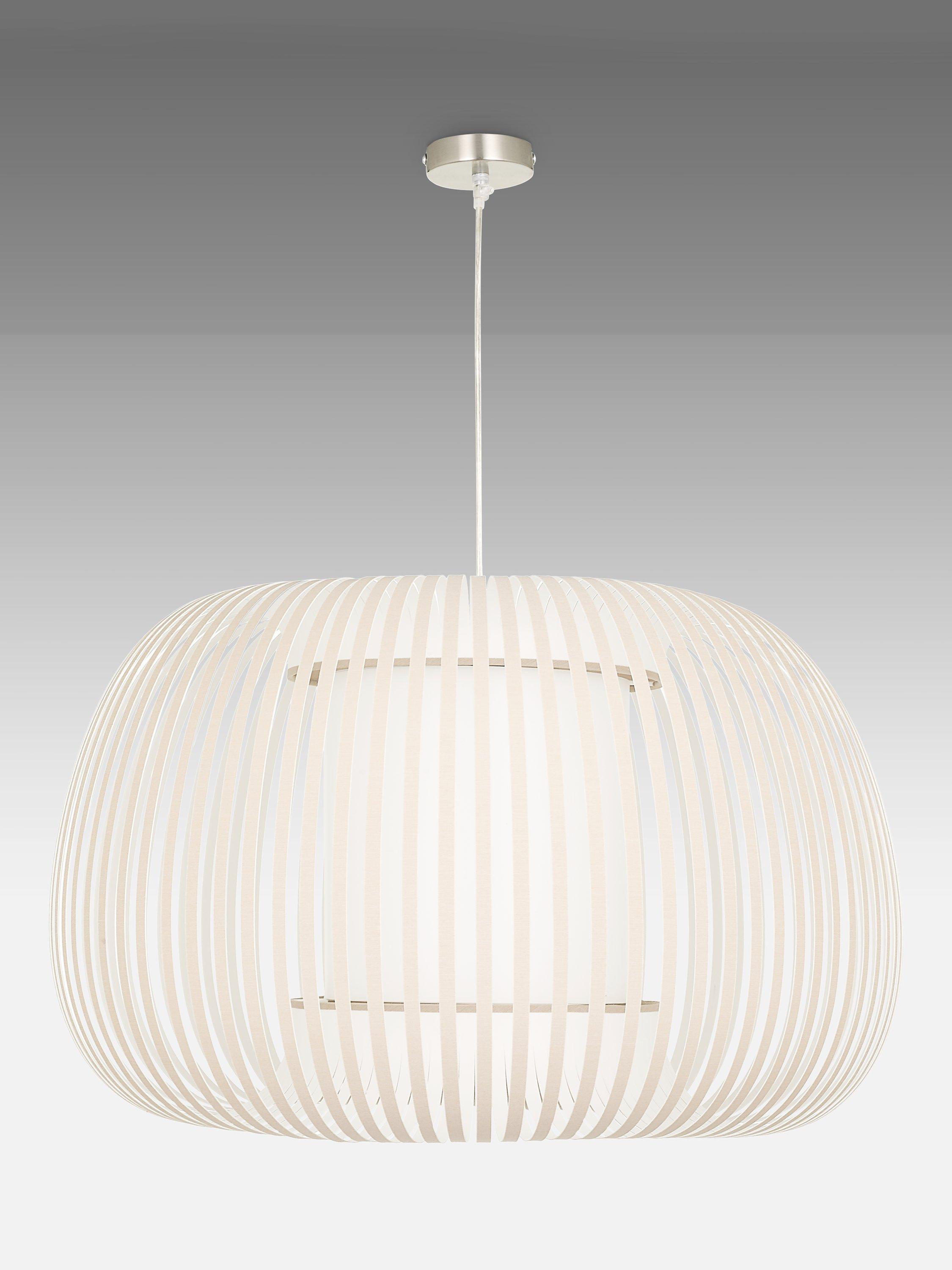 Our Harmony ceiling light has a ribboned lampshade with open segments. The light pours out of it, creating a central glowing orb. A visually striking light feature, the plastic is covered in a linen chintz which gives it a lavish finish. This pendant can be used as a shade only if required.