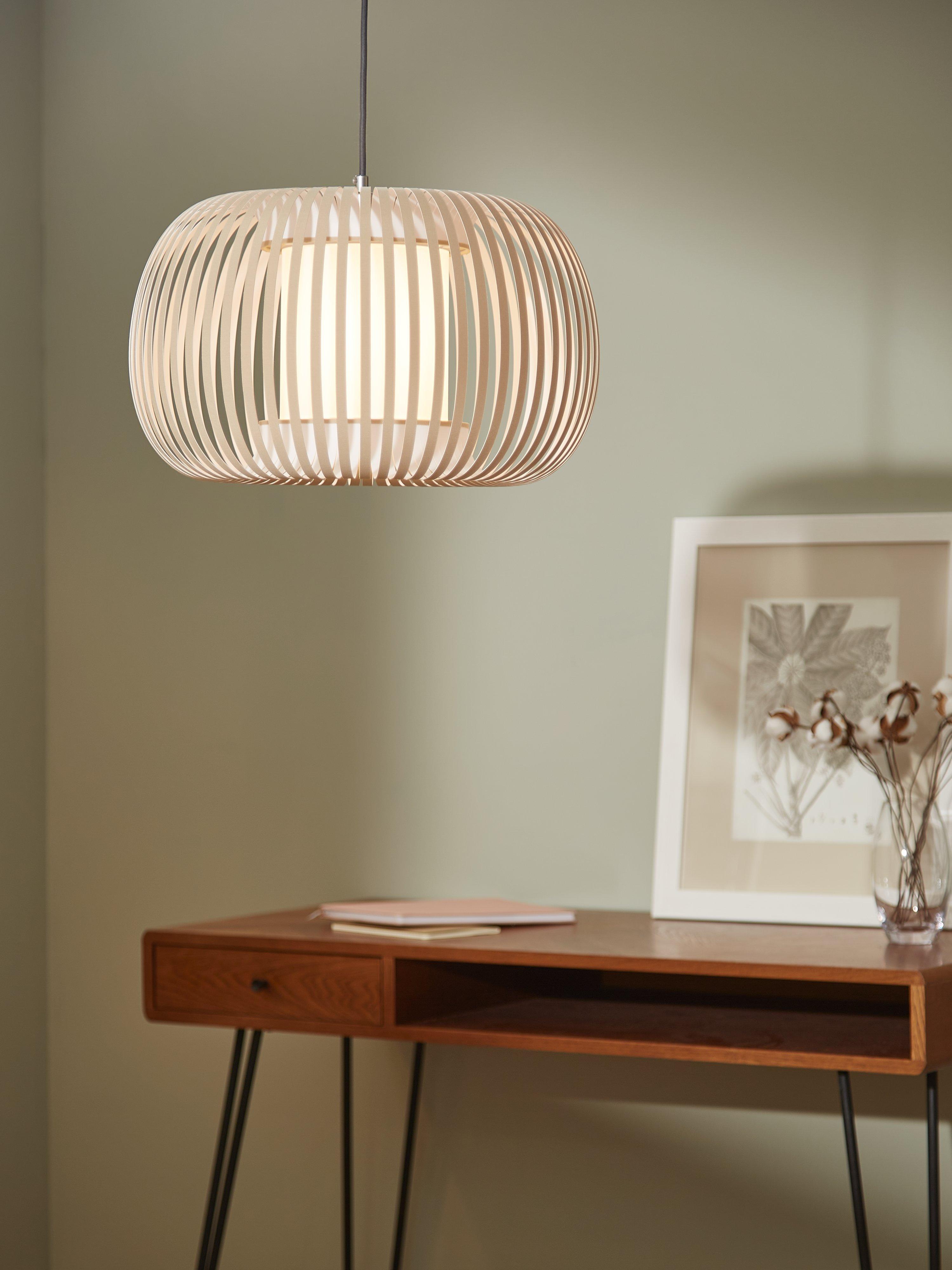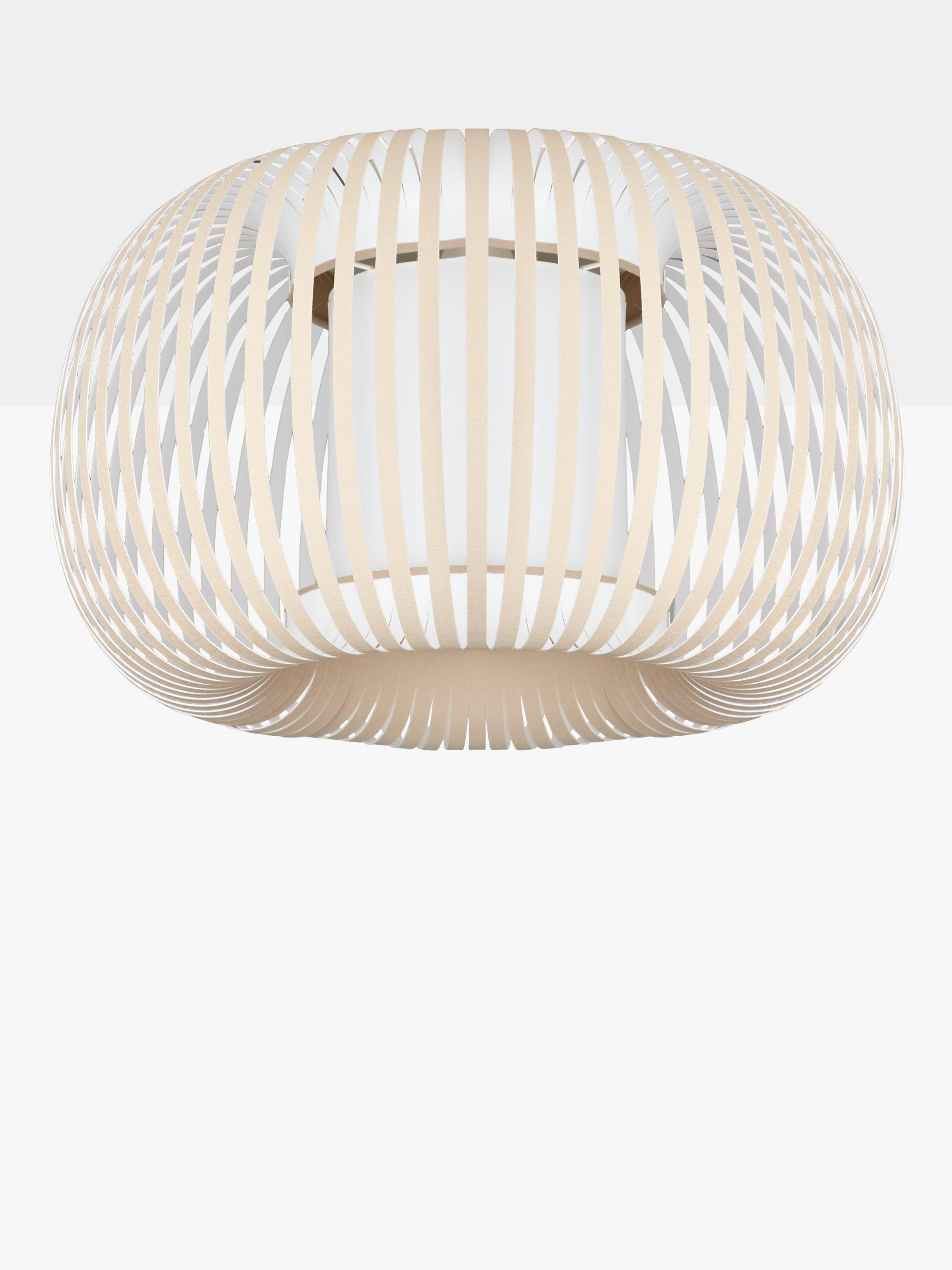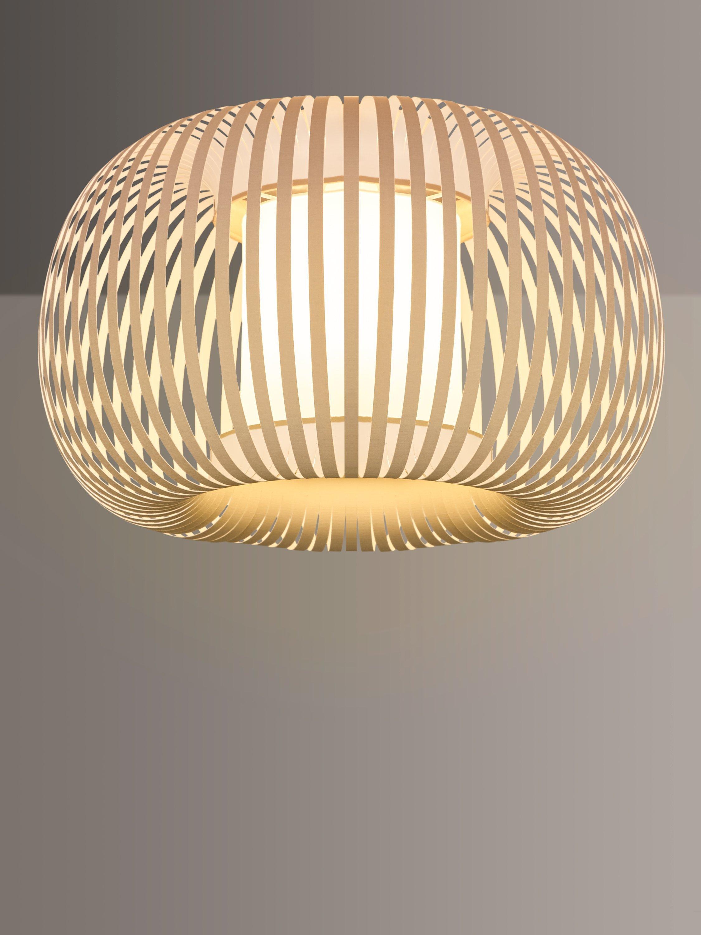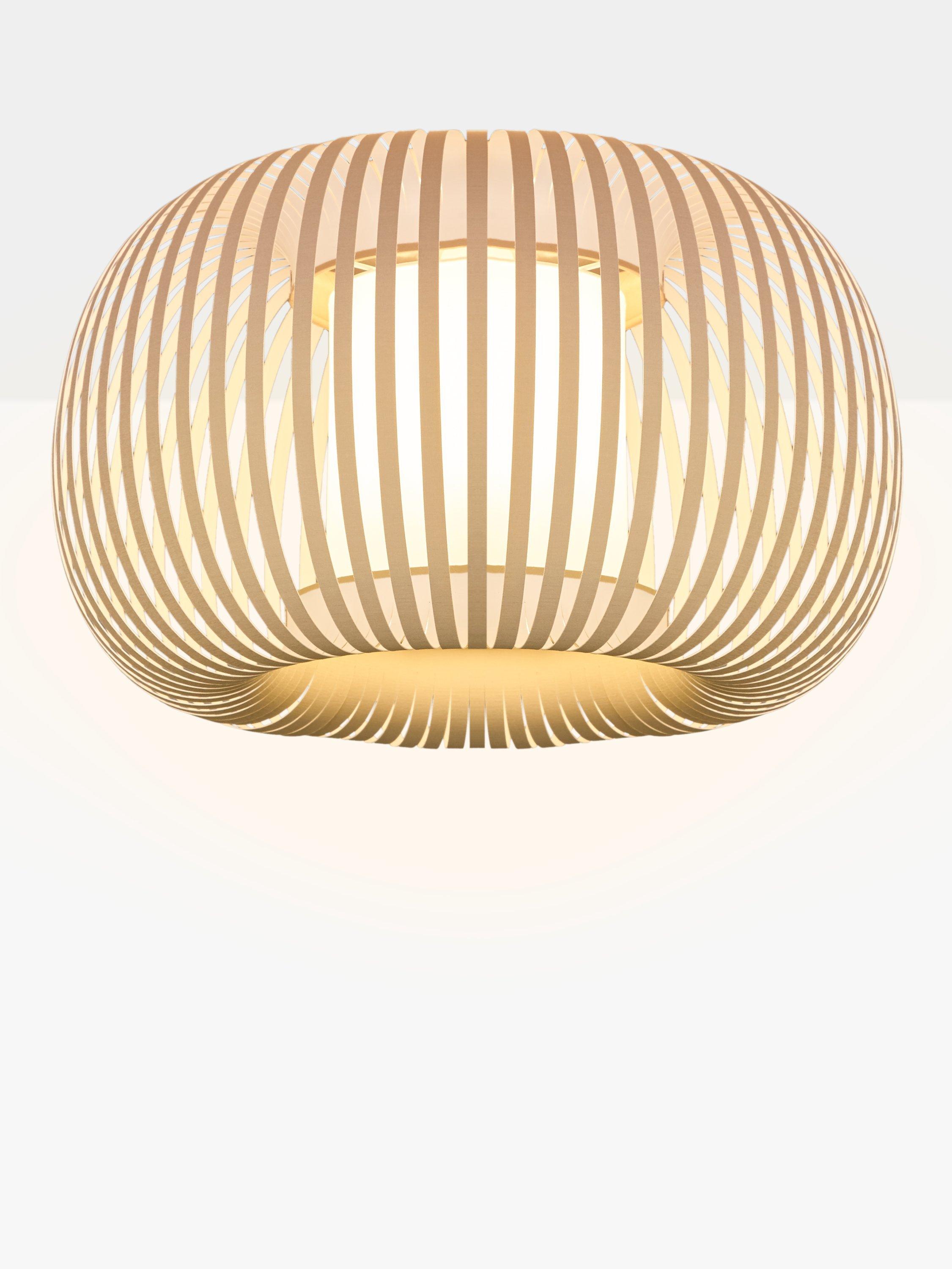 Its softly shaped and lightweight profile boasts a ribbon-style segmented shade that allows a warm light to glow from the centre. This light is suitable to match with other Harmony elements, as table lamps or pendants.