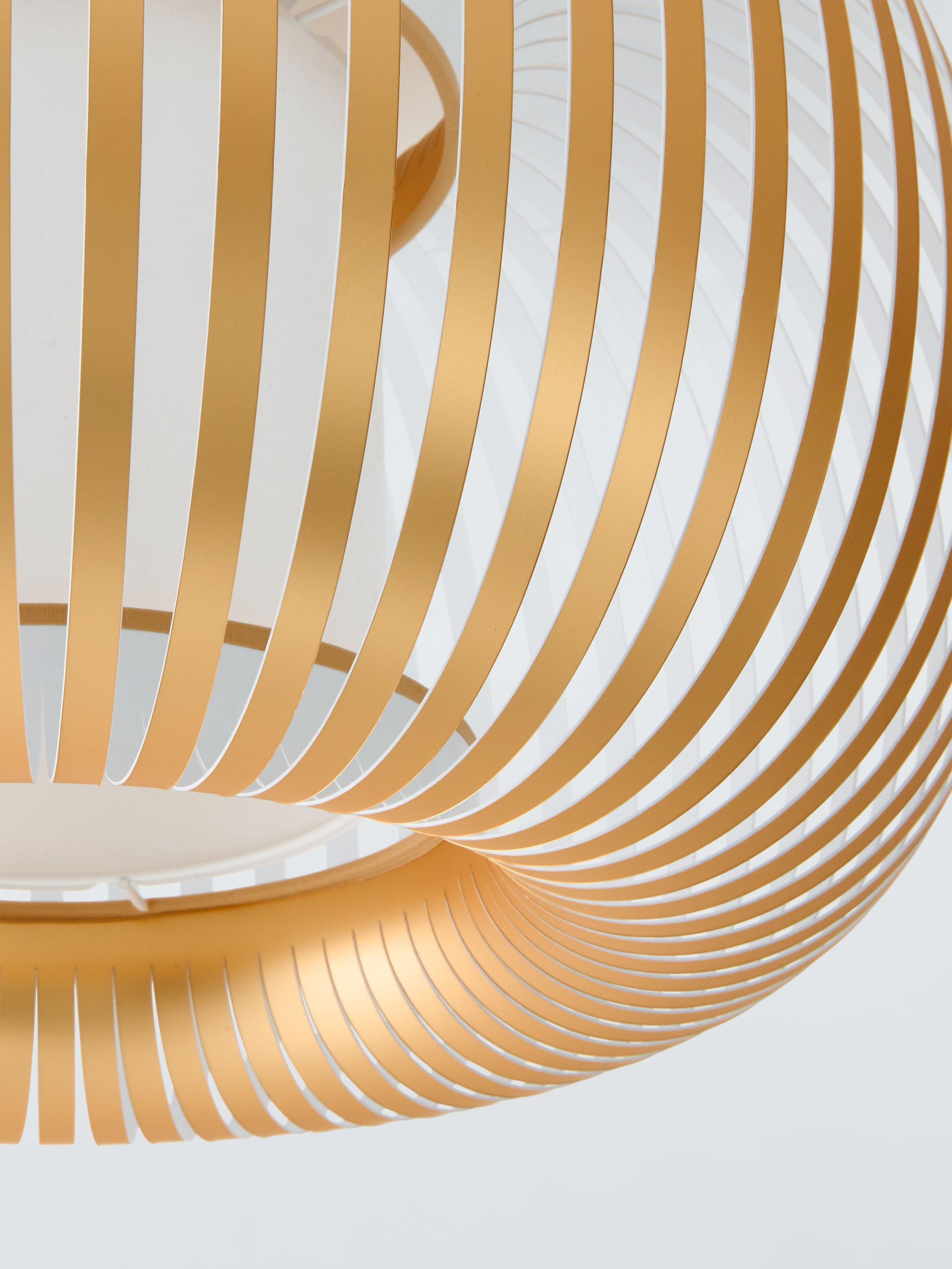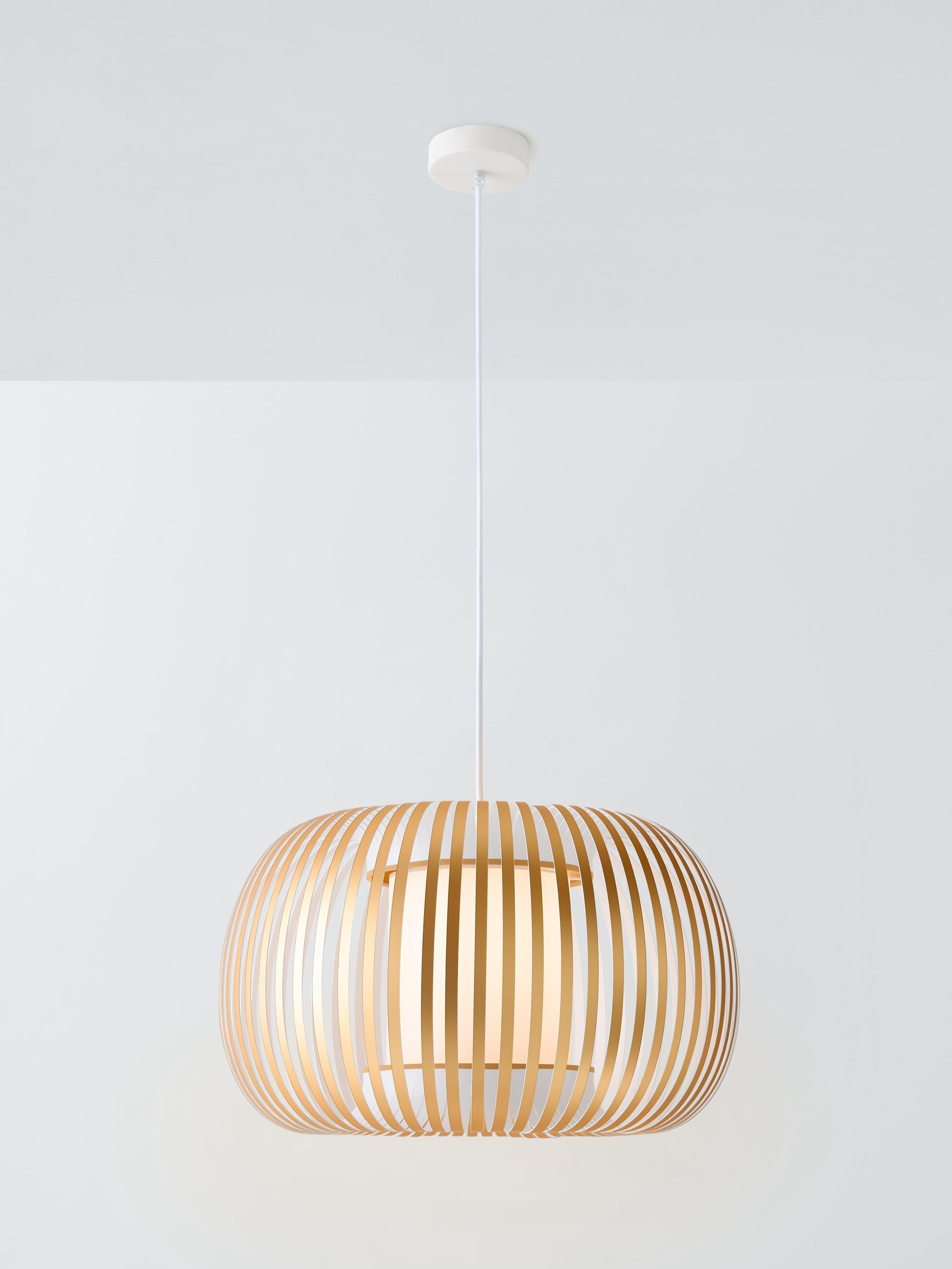 Our Harmony ceiling light has a ribboned lampshade with open segments. The light pours out of it, creating a central glowing orb. A visually striking light feature, the plastic is covered in a linen chintz, which gives it a lavish finish. This pendant can be used as a shade only if required.