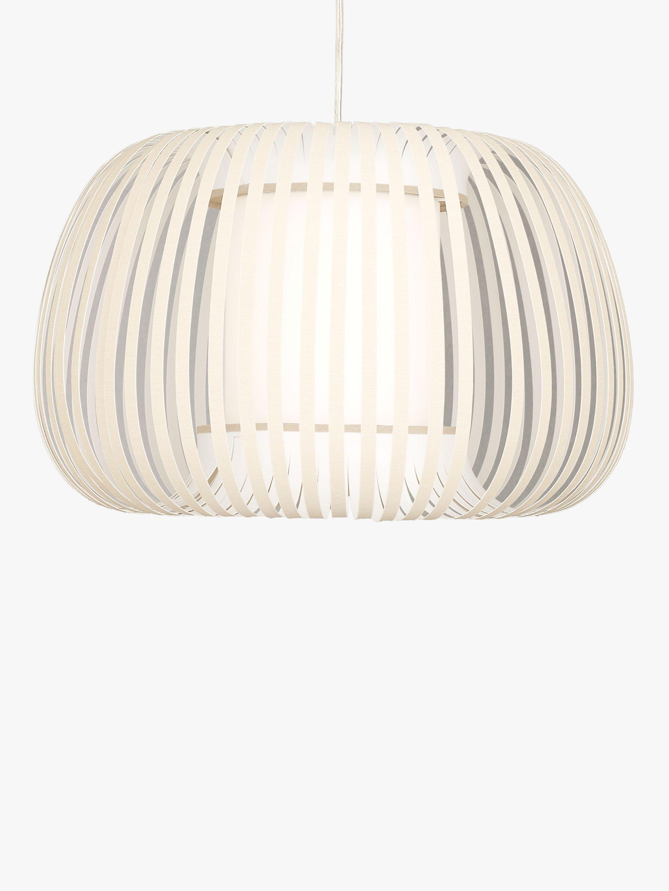 Our Harmony ceiling light has a ribboned lampshade with open segments. The light pours out of it, creating a central glowing orb. A visually striking light feature, the plastic is covered in a linen chintz, which gives it a lavish finish. This pendant can be used as a shade only if required.