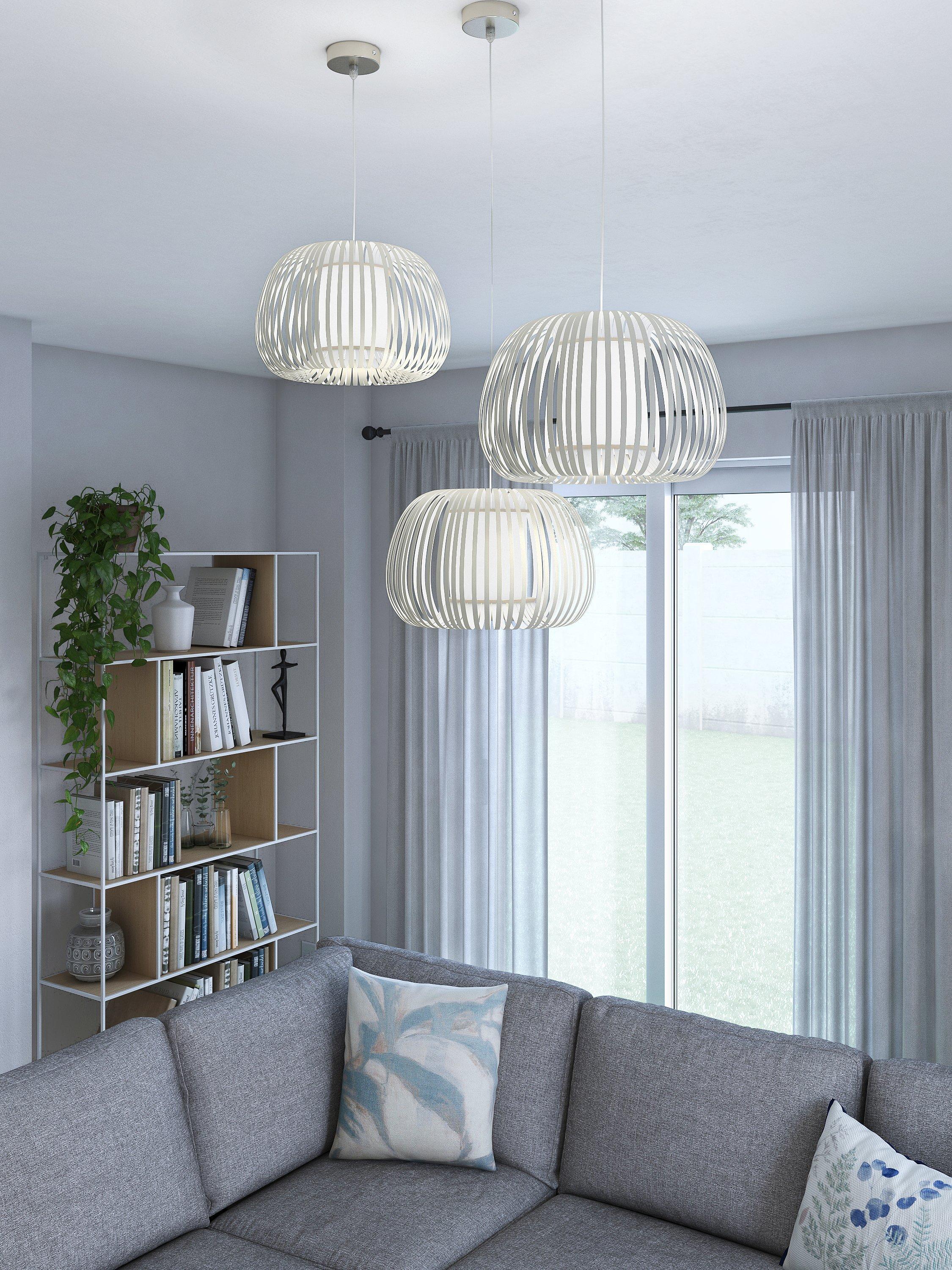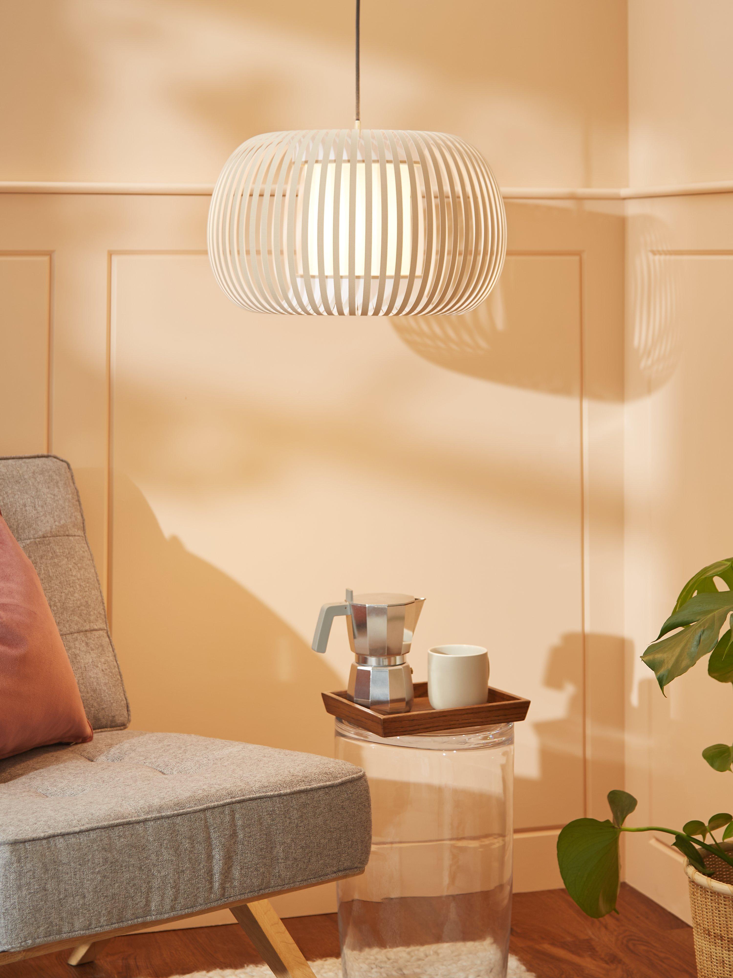 Our Harmony ceiling light has a ribboned lampshade with open segments. The light pours out of it, creating a central glowing orb. A visually striking light feature, the plastic is covered in a linen chintz, which gives it a lavish finish. This pendant can be used as a shade only if required.
