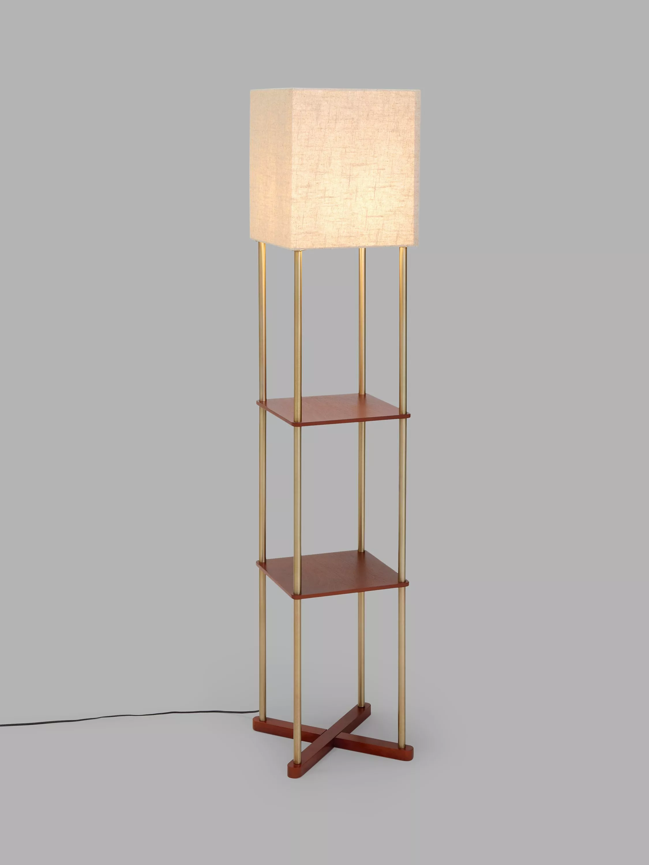 Taking the classic shelf light to the next level, our Harrison Shelf Floor Lamp mixes high-quality materials to create an elevated design with elevated function. Antique brass poles hold two walnut-finished shelves and a square, textured natural linen shade.