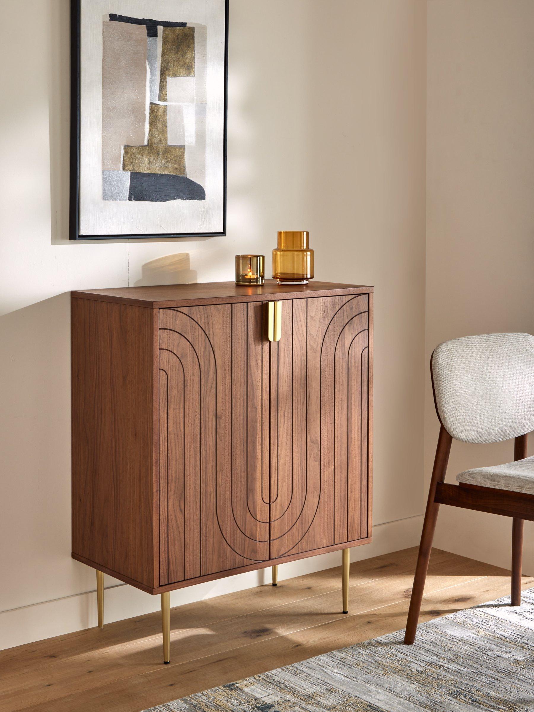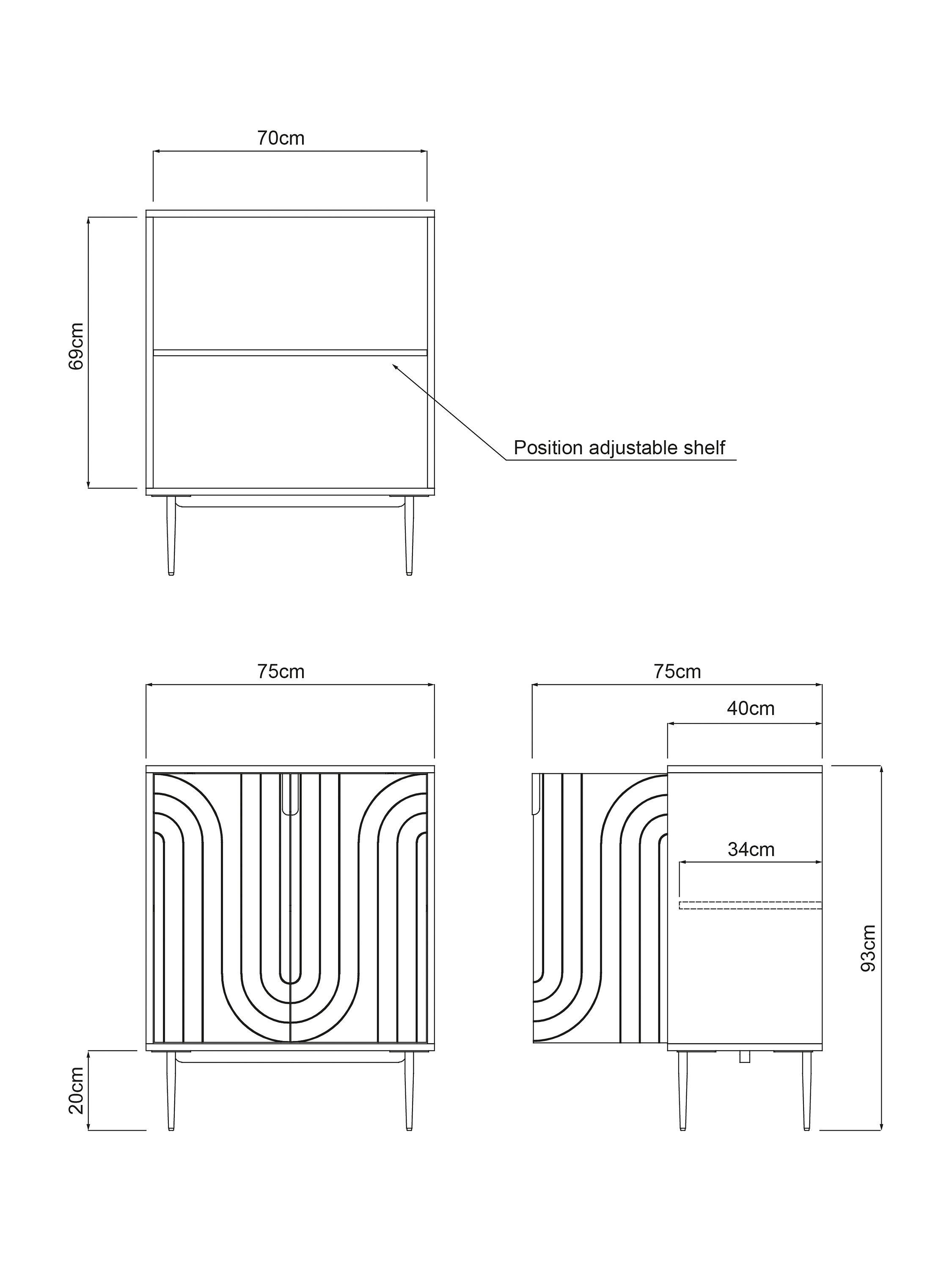 Our Harvard range of furniture combines Art-Deco style with modern shapes to inject character into your space. This spacious sideboard is made from sturdy MDF and walnut veneers in a painted finish and features an adjustable internal shelf. We love the fluid pattern inset on the door fronts, as well as the brass finish handles and tapered legs, all of which add to its sleek look. Perfect as a drinks cabinet, or as a sideboard for your tableware in smaller dining rooms.