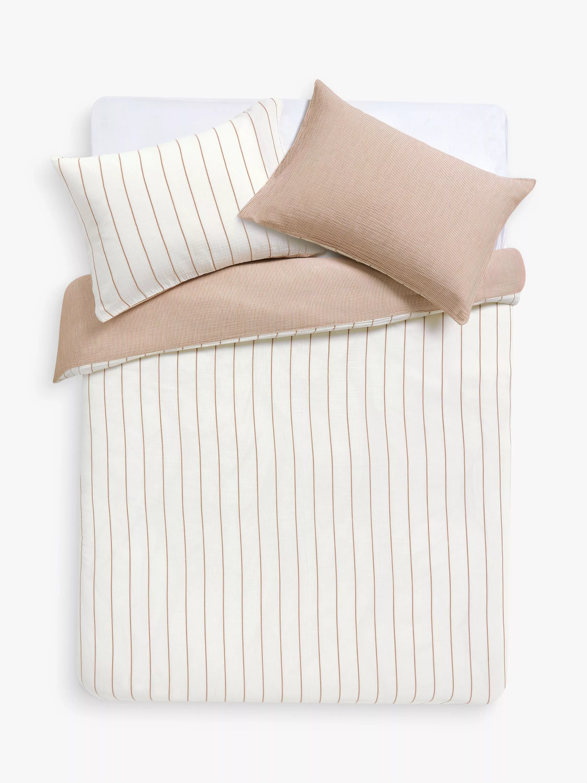 Lightweight and breathable cotton gauze reversible bedding with a relaxed stripe design that makes a great choice for spring and summer.