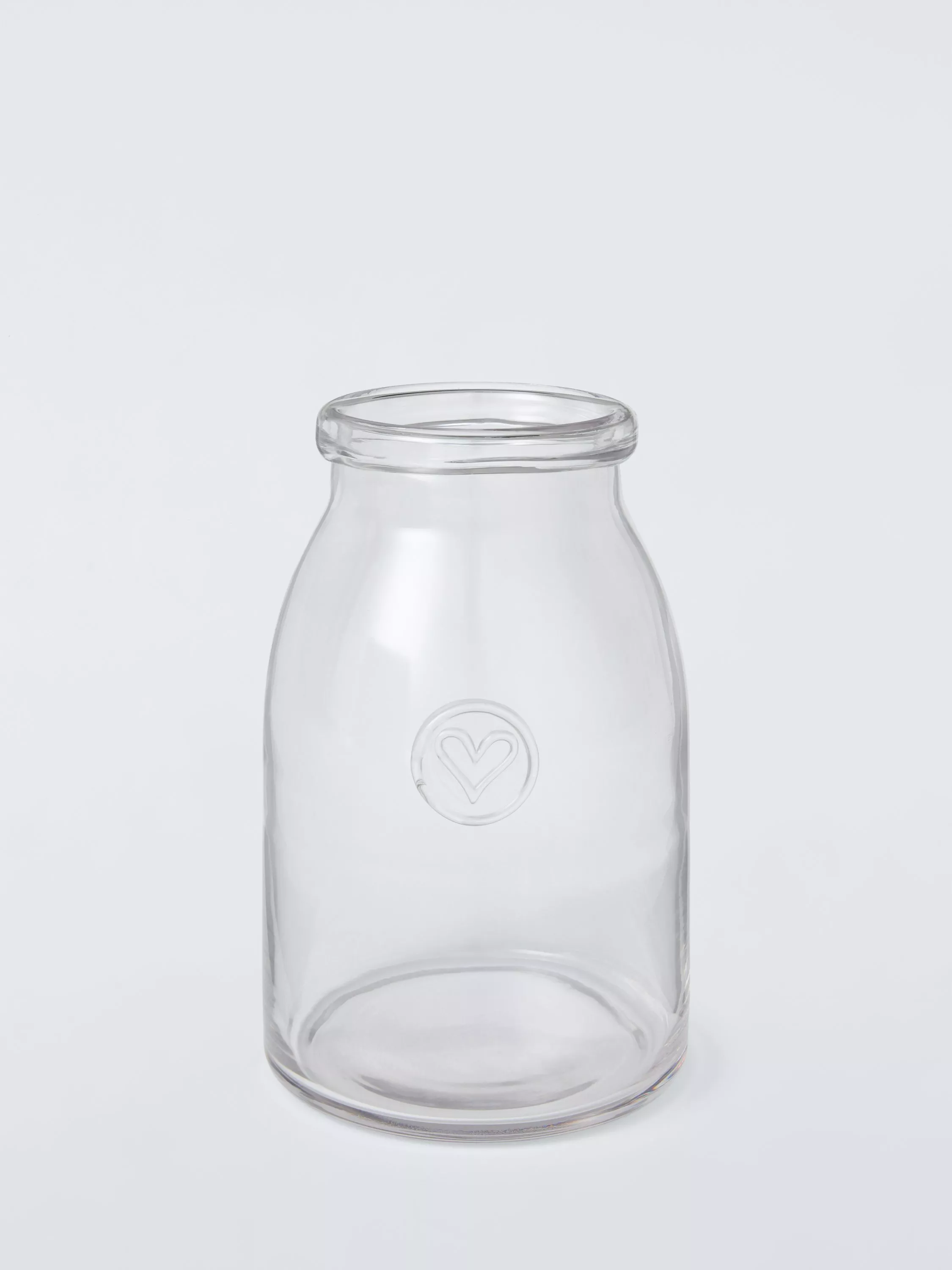 A clear jam-style vase with farmhouse-inspired heart detailing.