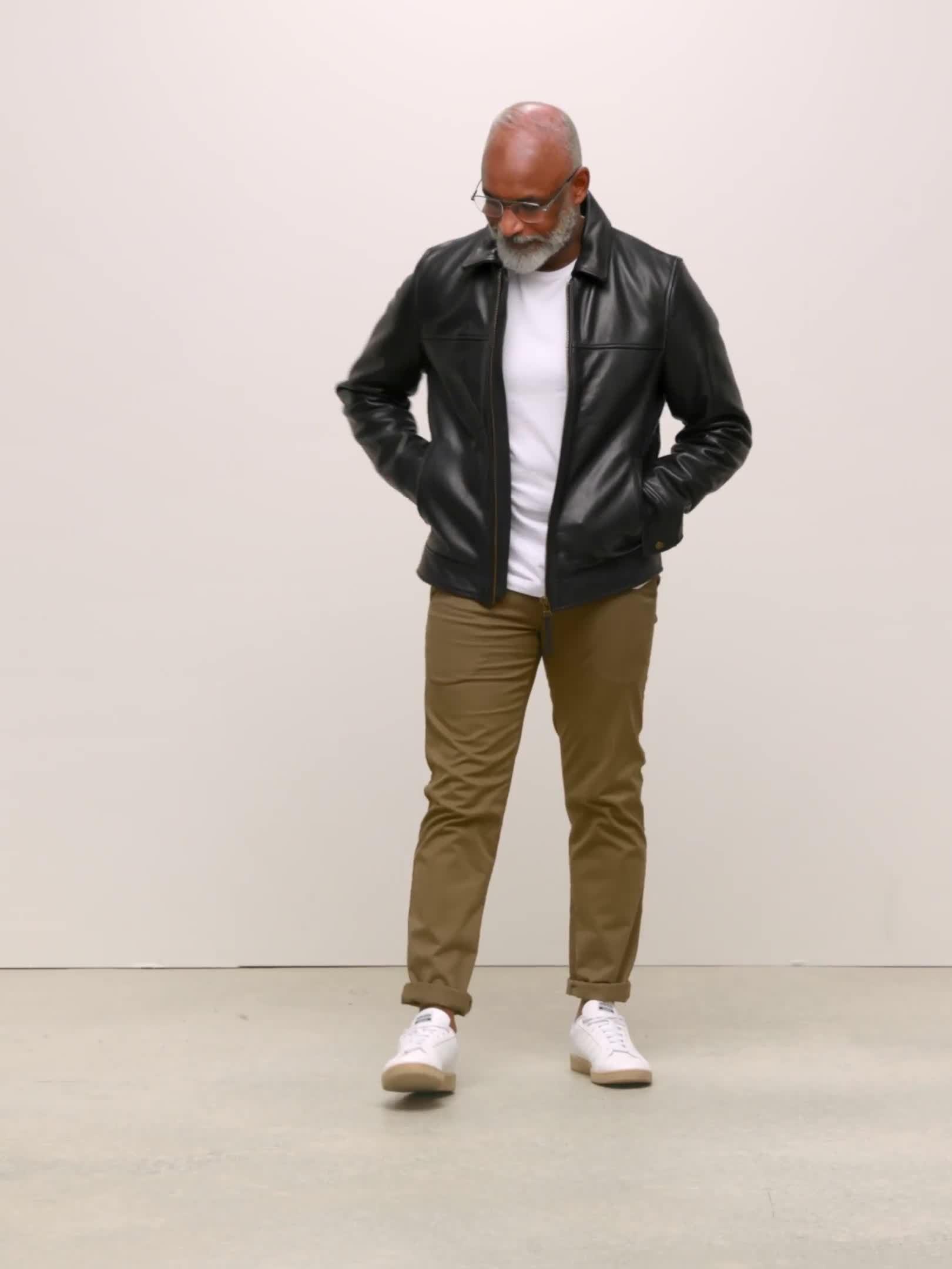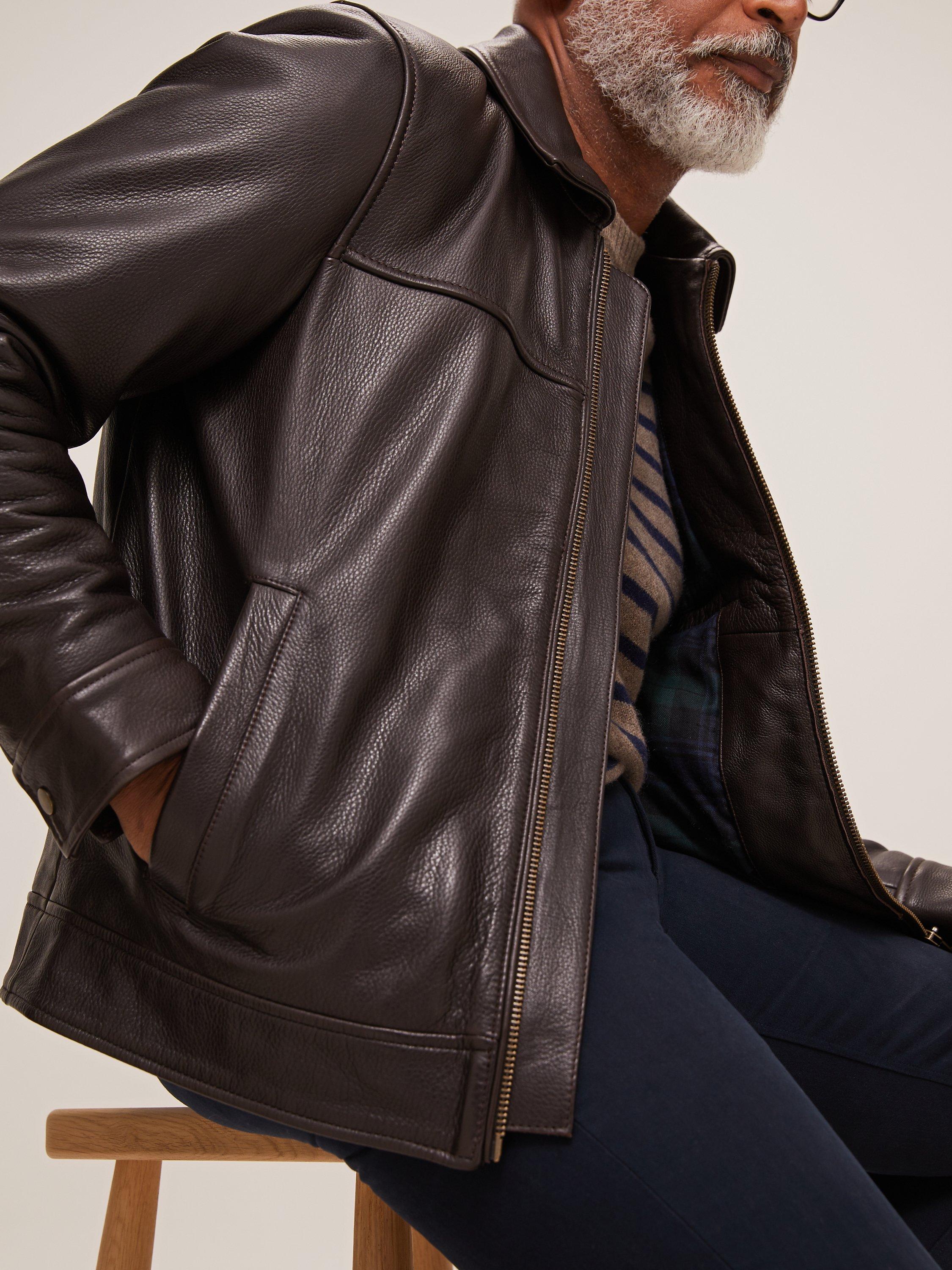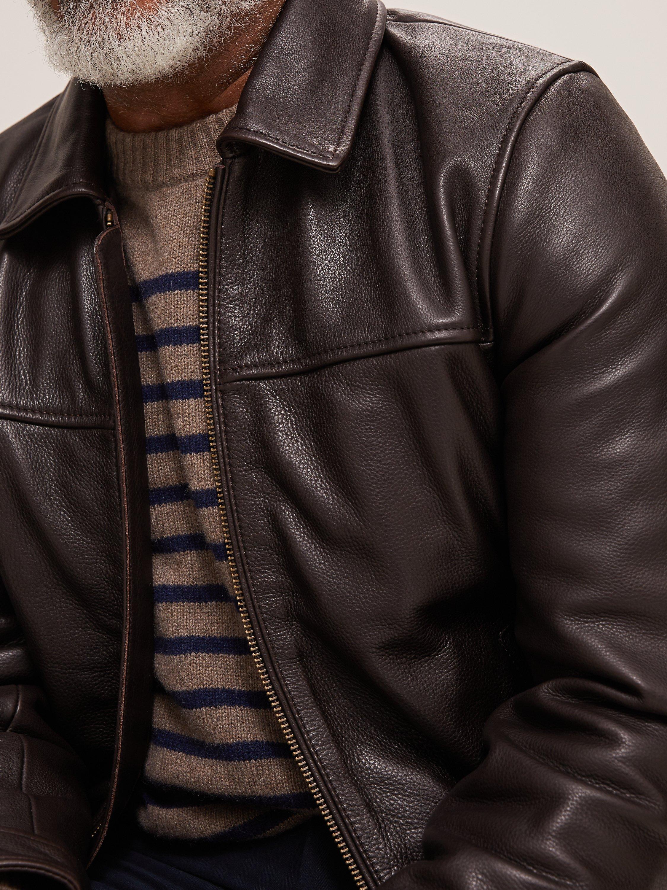 Made from heavy leather, the zip front, soft collar, and comfortable ribbed hem detail complete an authentic vintage style.