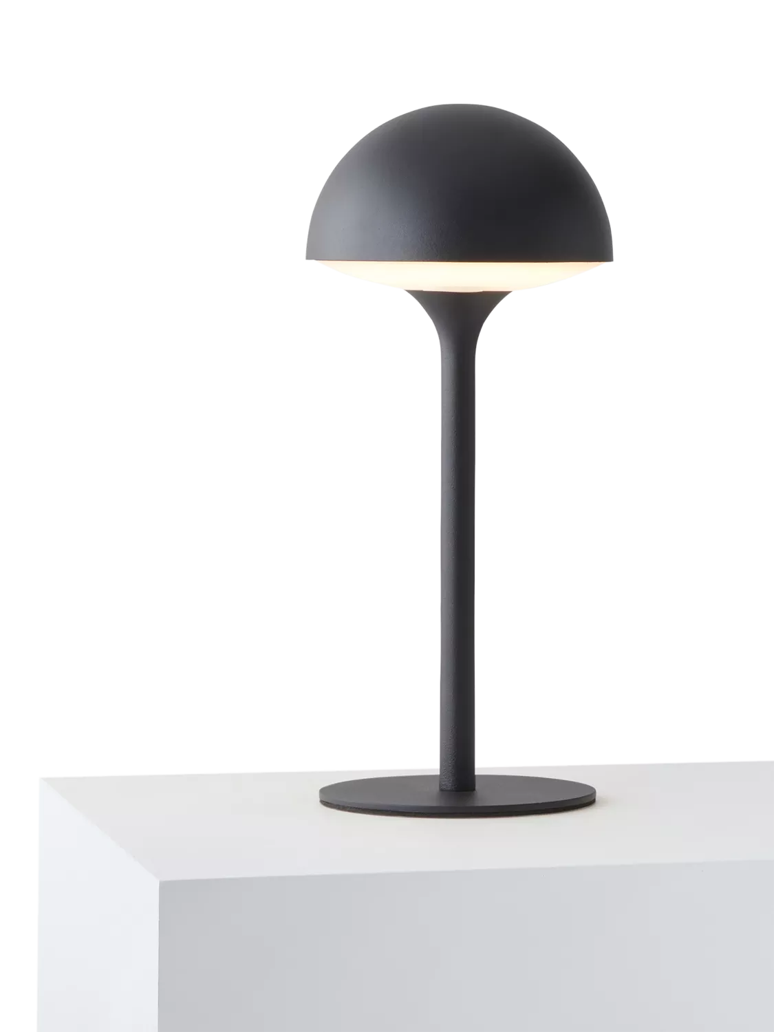 The Heftig table lamp is a stylish and functional lighting solution for indoor and outdoor settings. Featuring minimalist and modern Scandinavian-inspired forms and tactile textured paint, it emits a warm white light with three adjustable brightness settings, easily controlled by a touch button.