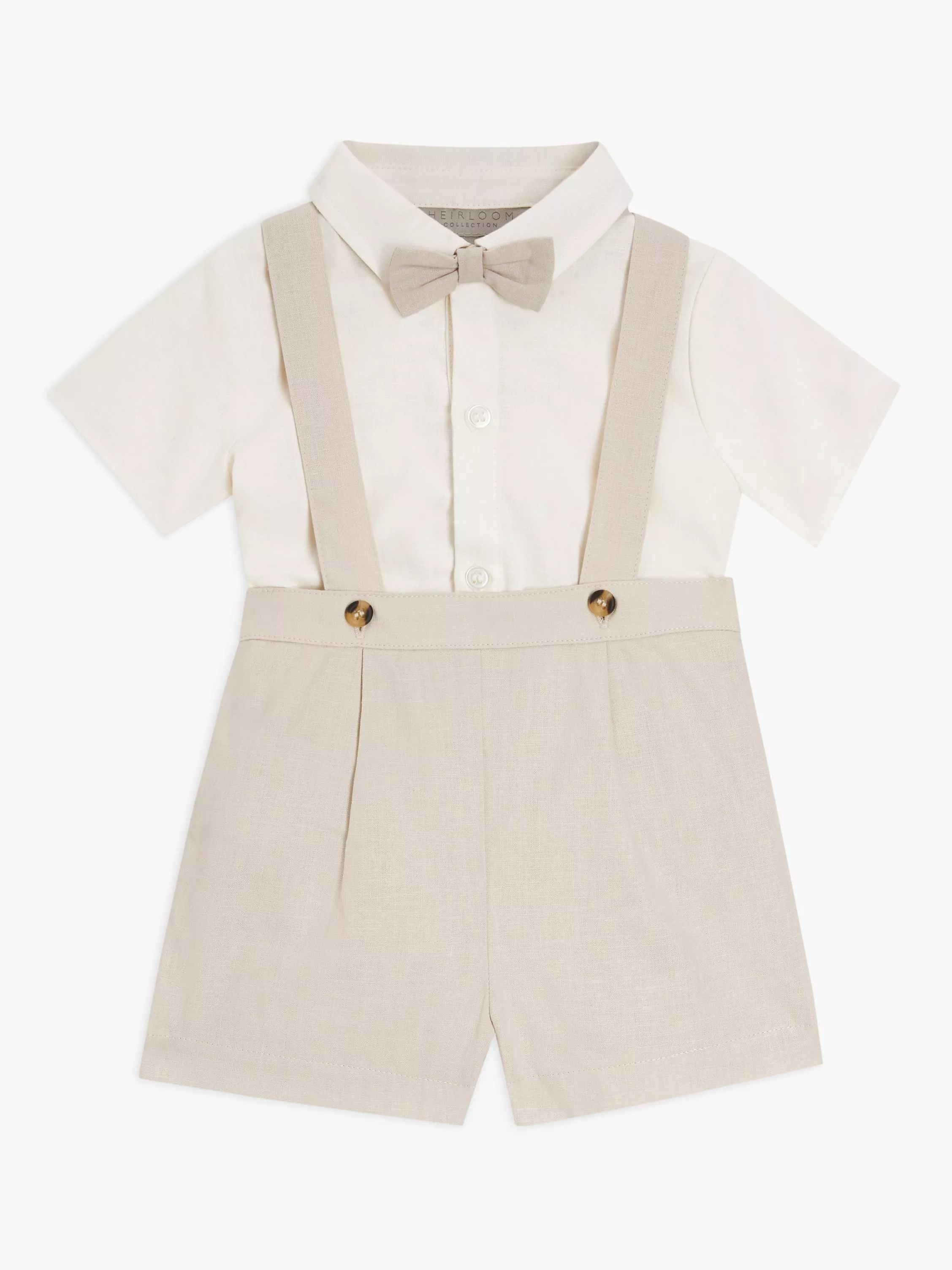 Made from a cotton and linen blend, this luxurious set features a smart shirt style bodysuit with bowtie and smart pleated shorts and braces with a cross over back- the stretchy waistband allows for wriggle room as well. Pair it with cute loafers and socks.
