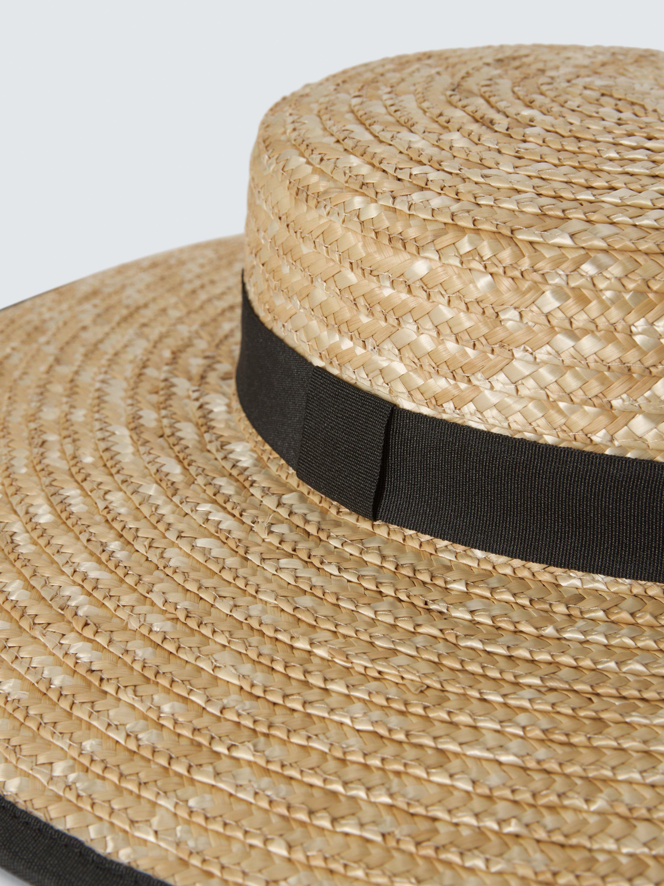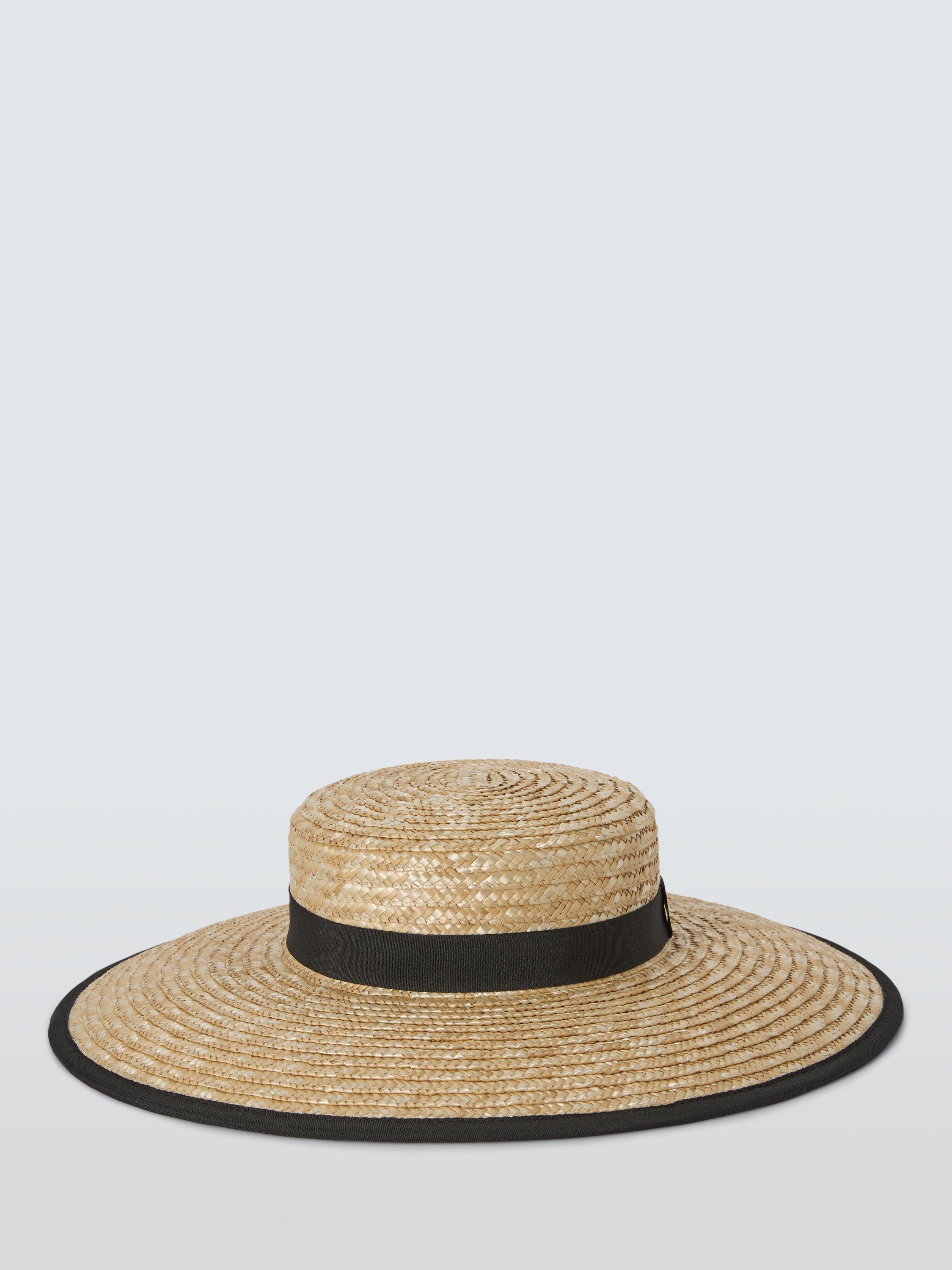 Woven from straw hat for a natural look, with a wide brim giving more shade from the sun. Finished with a contrasting fabric band and trim.
