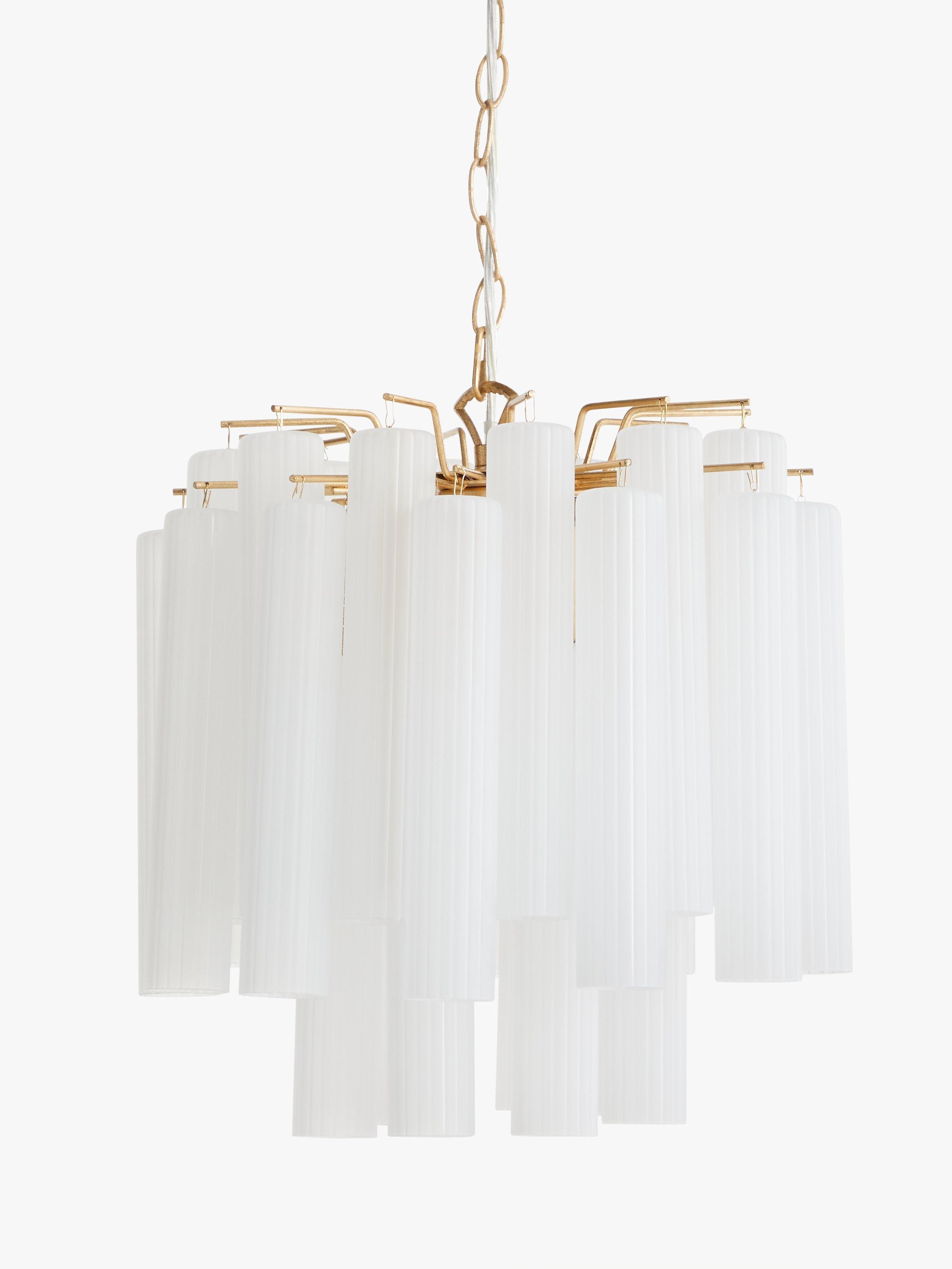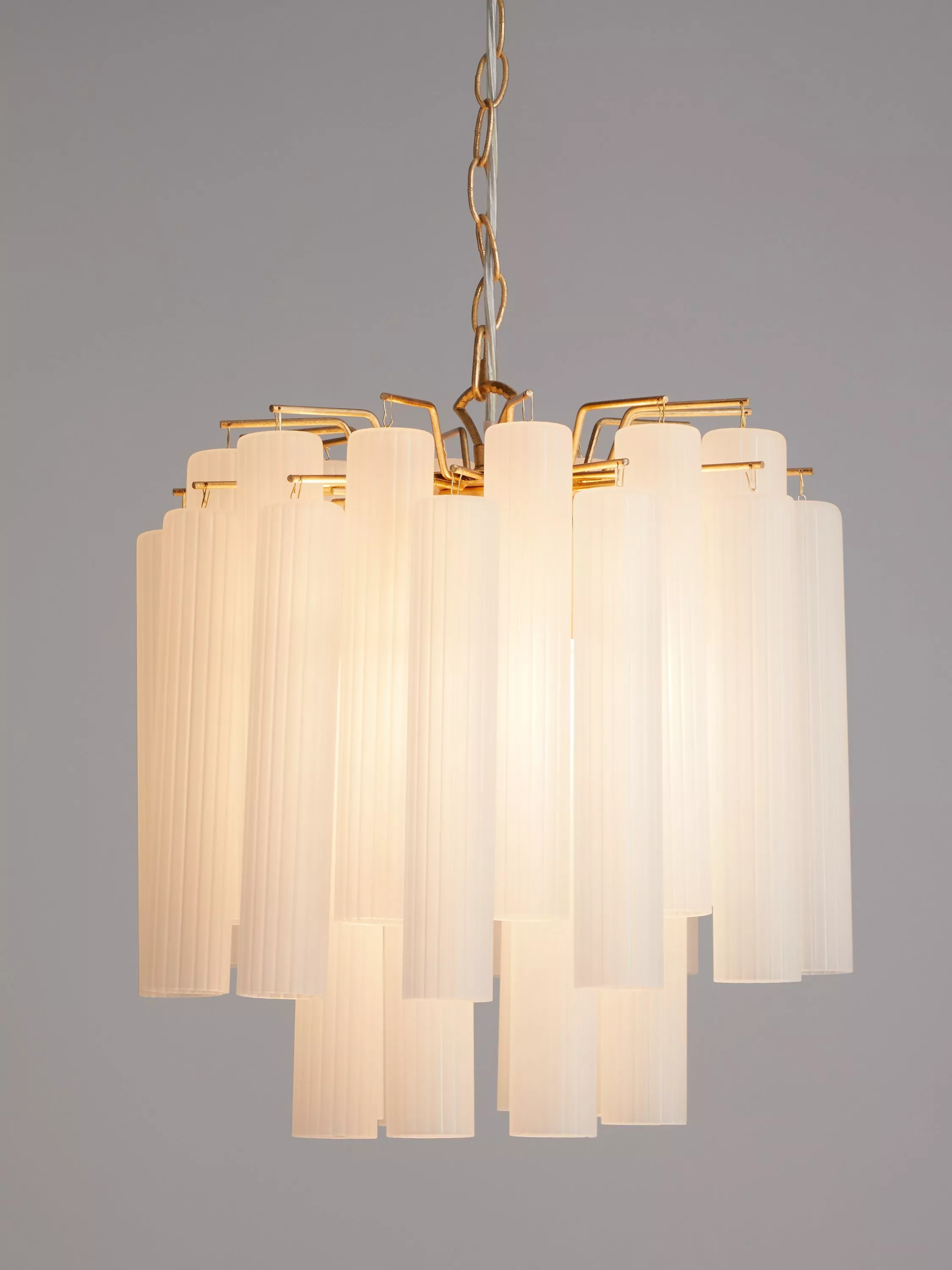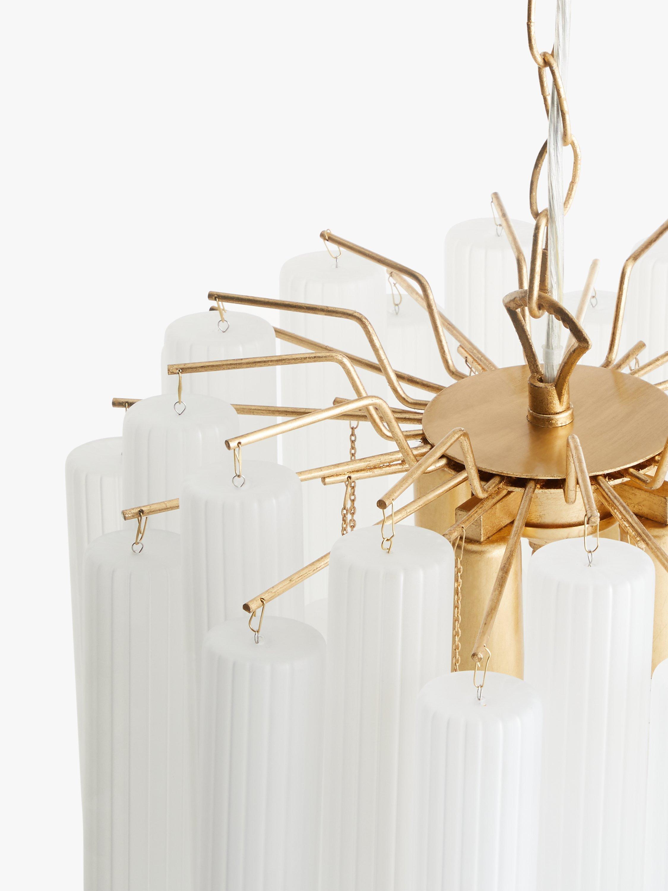 Enhance your space with our Helix ceiling light. Suspended from an adjustable chain-style flex, this modern chandelier is designed with frosted glass flutes that are elegantly formed to conceal the central light source, in order to create a warm glow of light. Accents of gold-finished metal lend a restorative-inspired design accent.