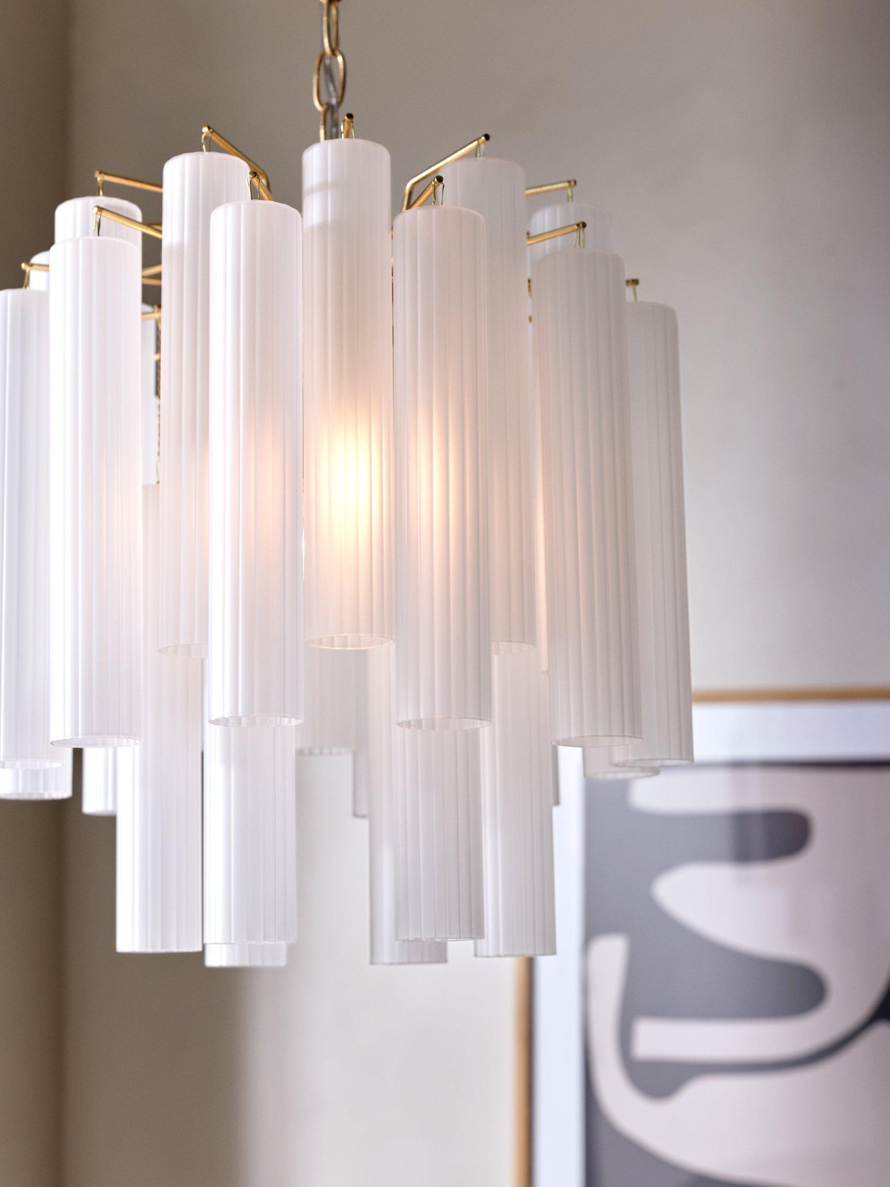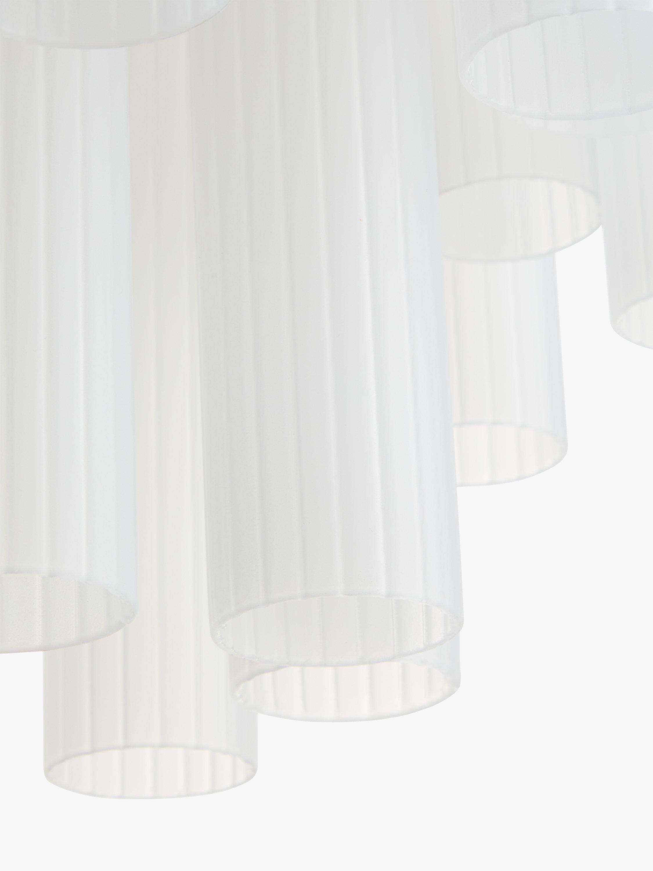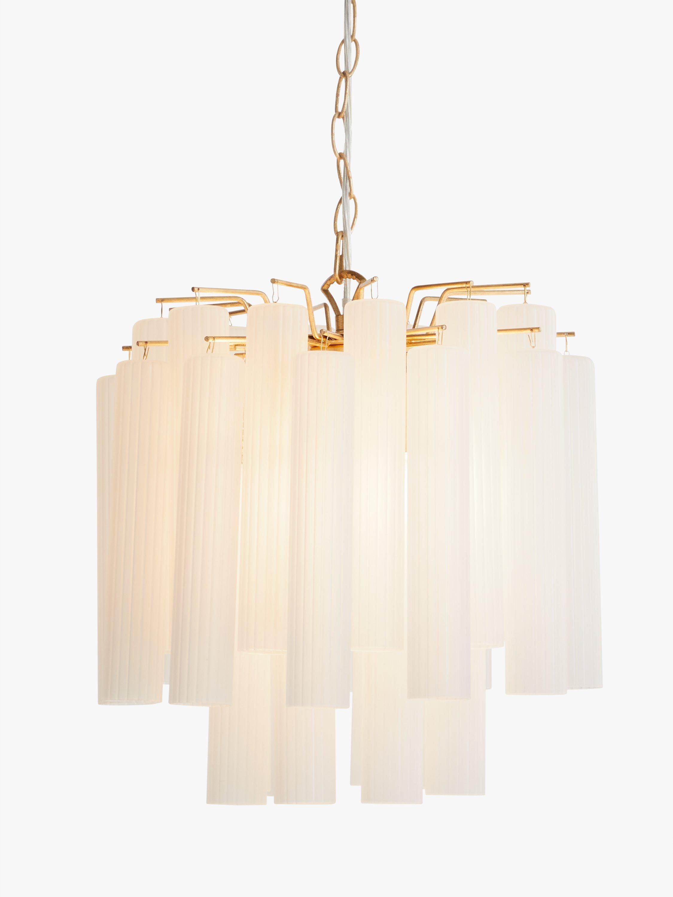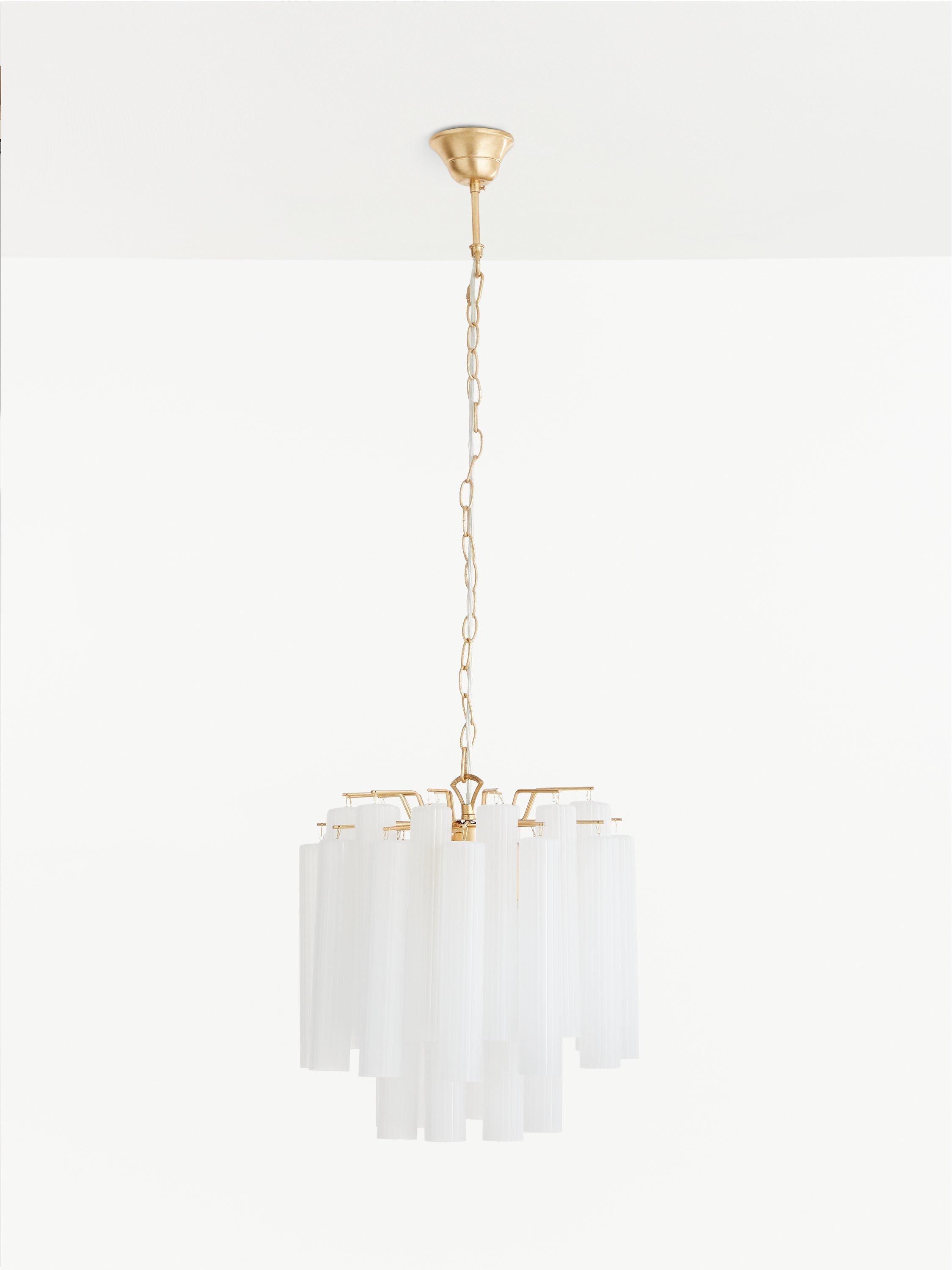 Enhance your space with our Helix ceiling light. Suspended from an adjustable chain-style flex, this modern chandelier is designed with frosted glass flutes that are elegantly formed to conceal the central light source, in order to create a warm glow of light. Accents of gold-finished metal lend a restorative-inspired design accent.