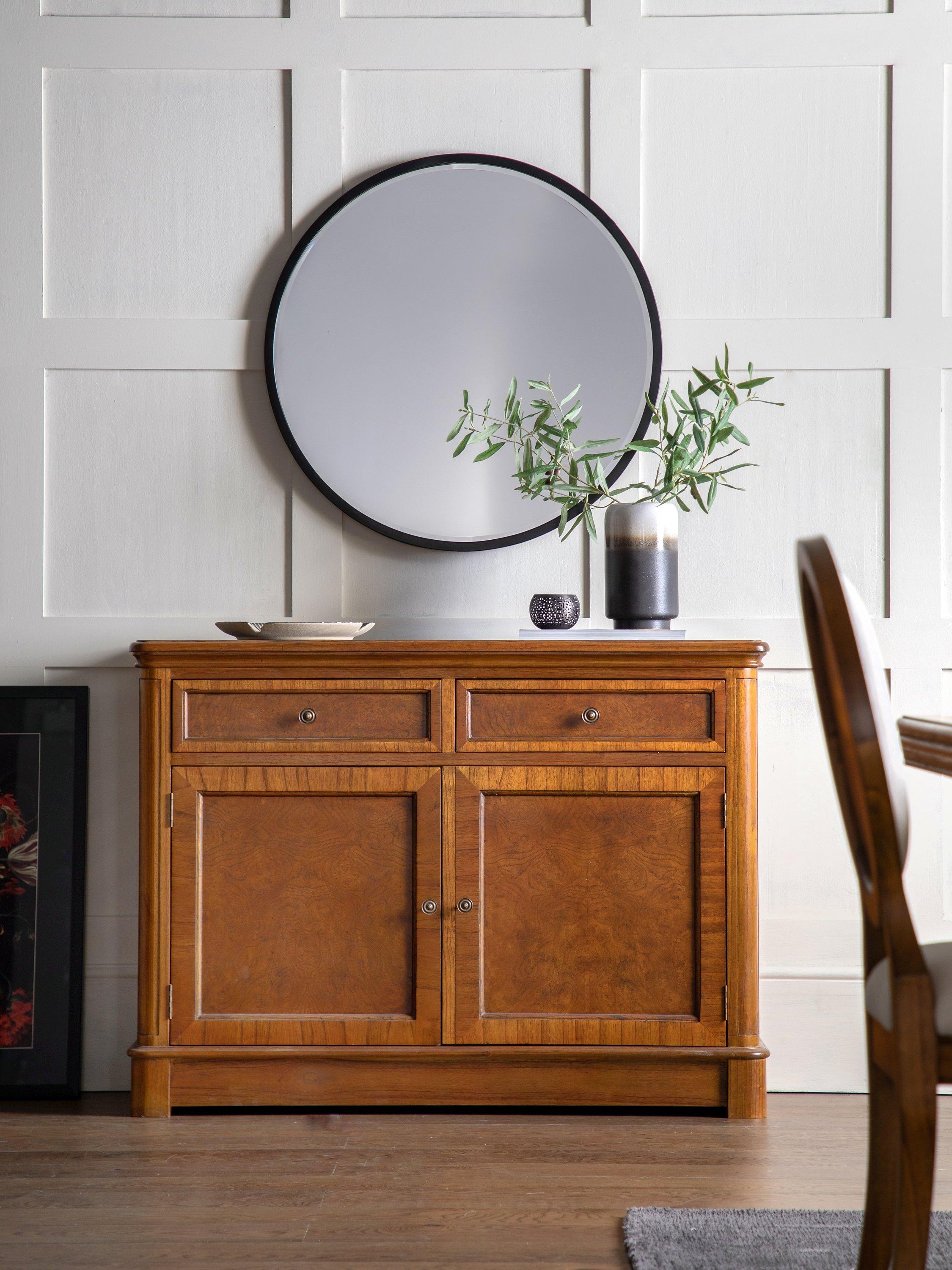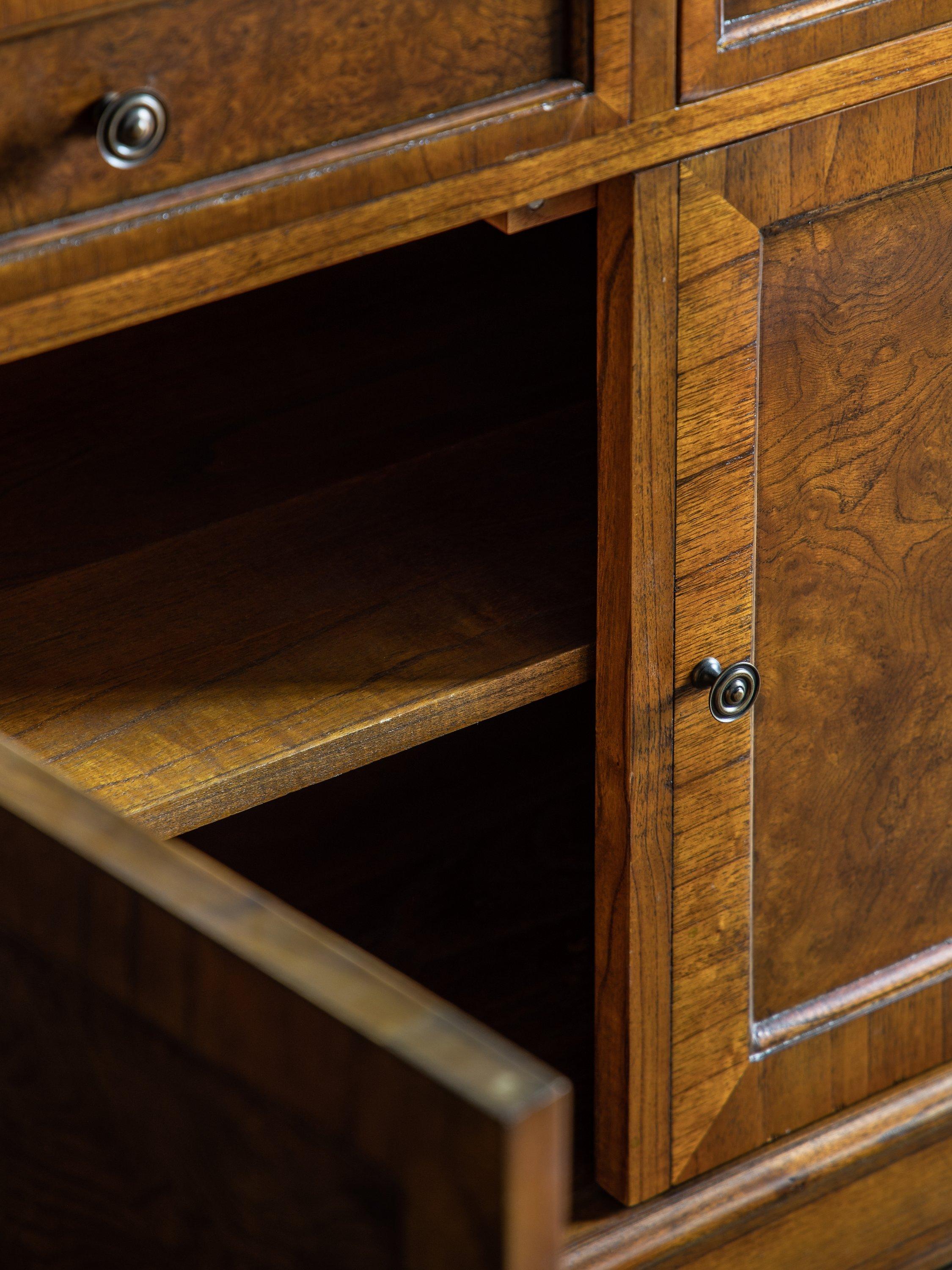 This formal sideboard with 2 drawers and 2 cupboards is made from melia oak solids and pippy oak veneers and is hand-polished with wax lacquer. It’s finished with antiqued brass knob handles and can provide essential storage space in your living room, dining room, bedroom or hallway.