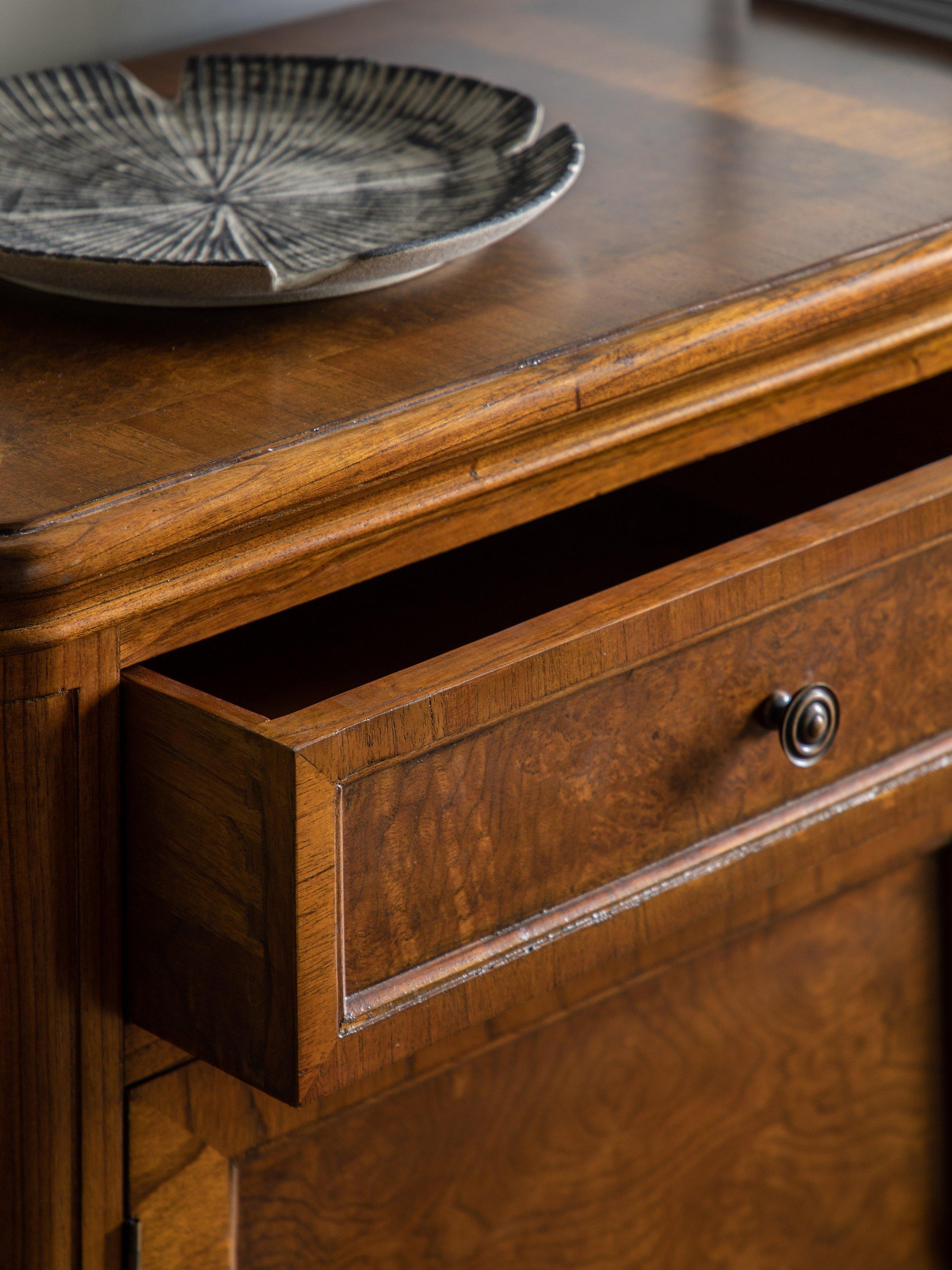 This elegant furniture is inspired by the formal yet practical look of the late 19th century Arts and Crafts movement. Each piece in the Hemingway range is made from melia oak solids and pippy oak veneers, stained a rich deep colour, and hand-polished with wax lacquer. For a traditional finish, doors and drawers are finished with antiqued brass knob handles.