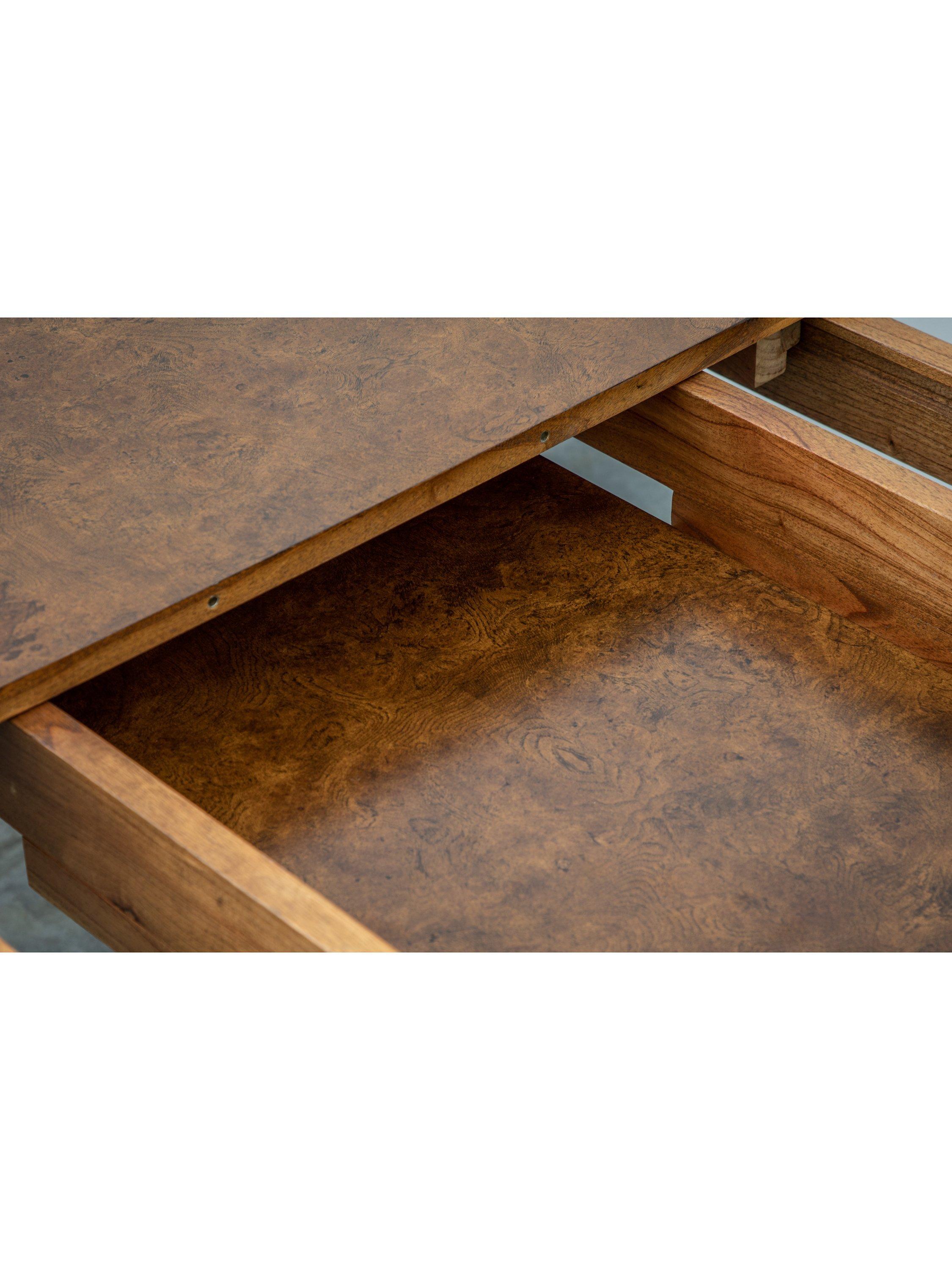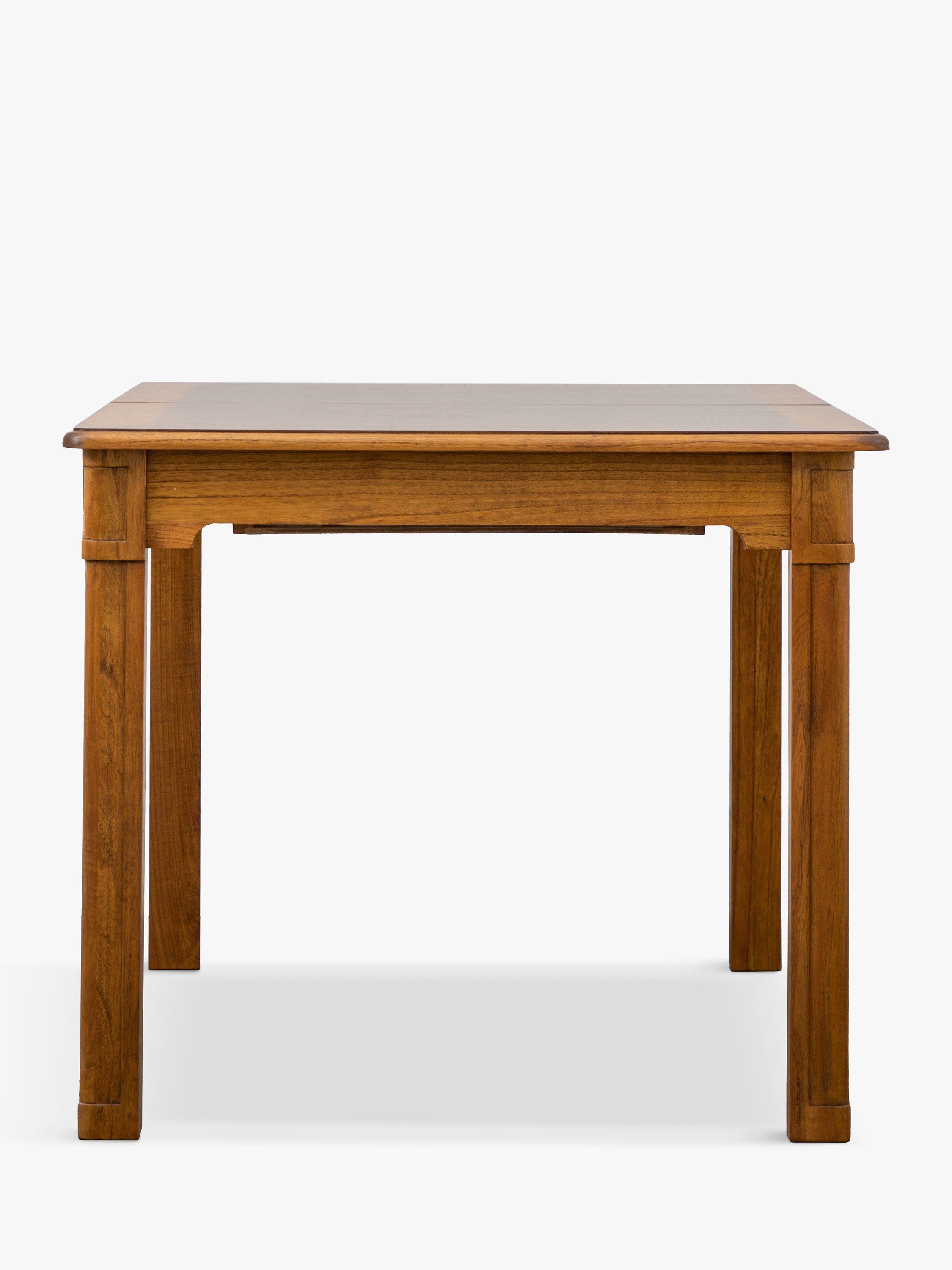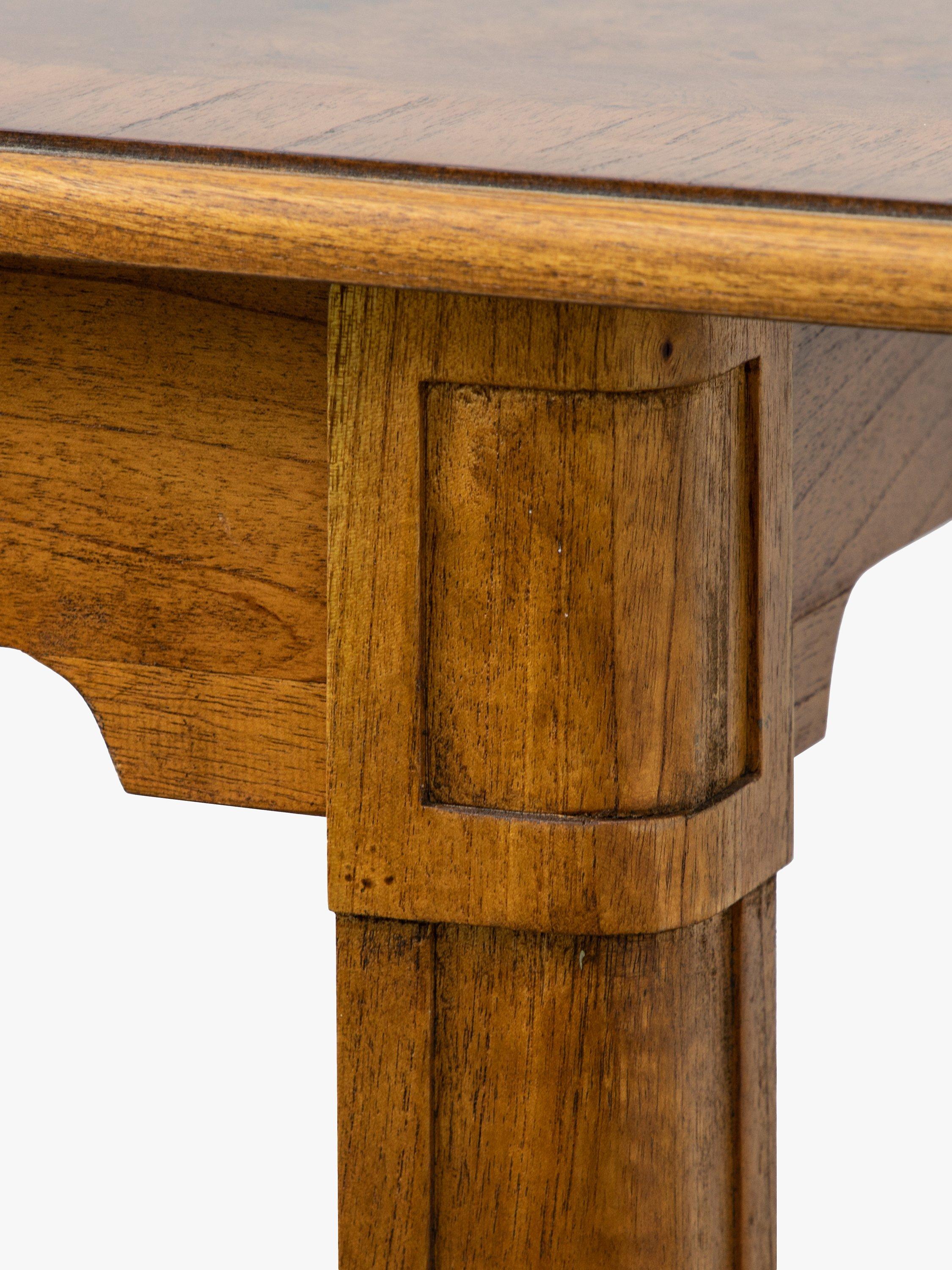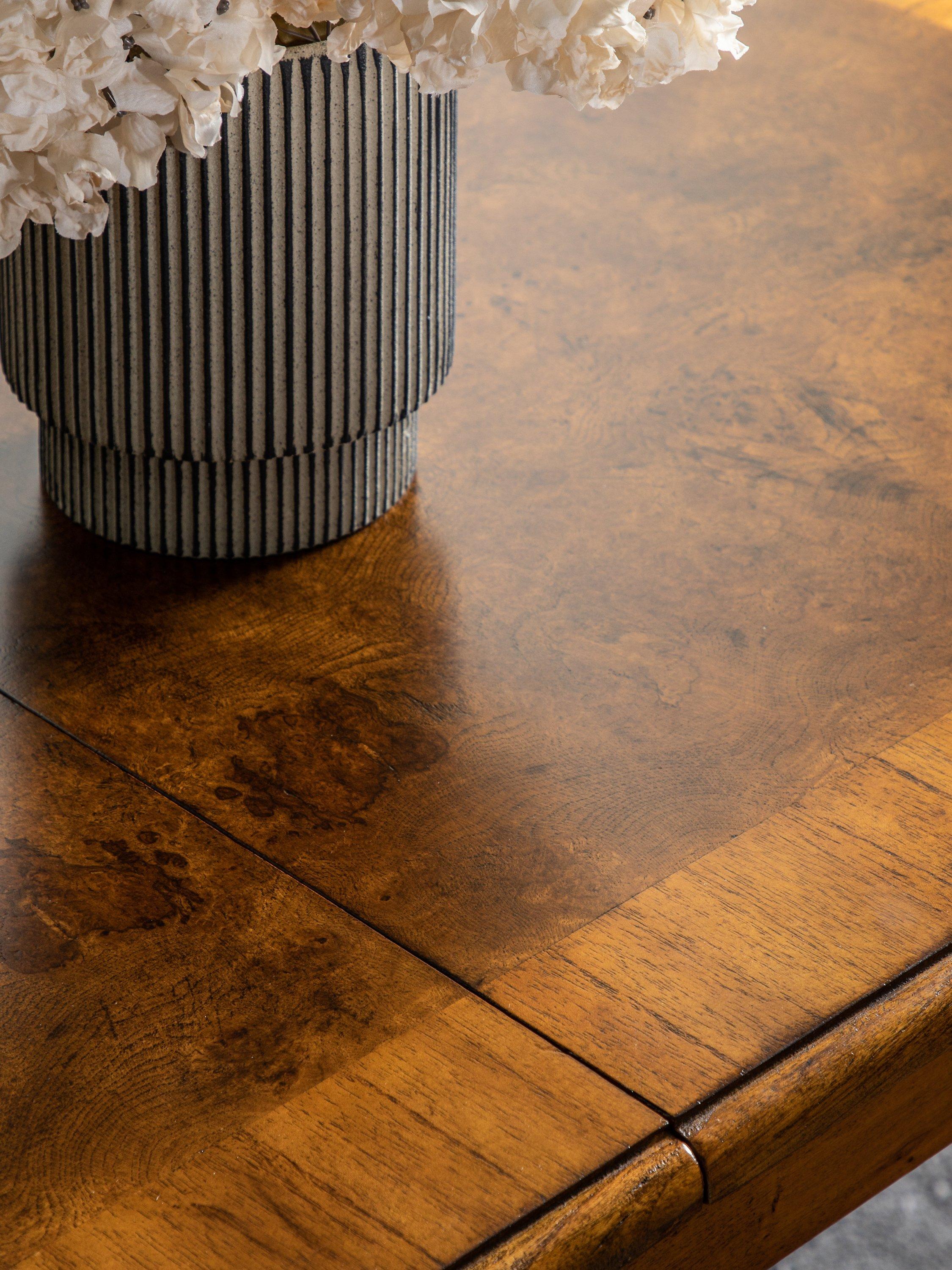 This formal dining table is made from melia oak solids and pippy oak veneers, and is hand-polished with wax lacquer. It seats 4-6, making it ideal for saving space in smaller dining rooms when not in use.