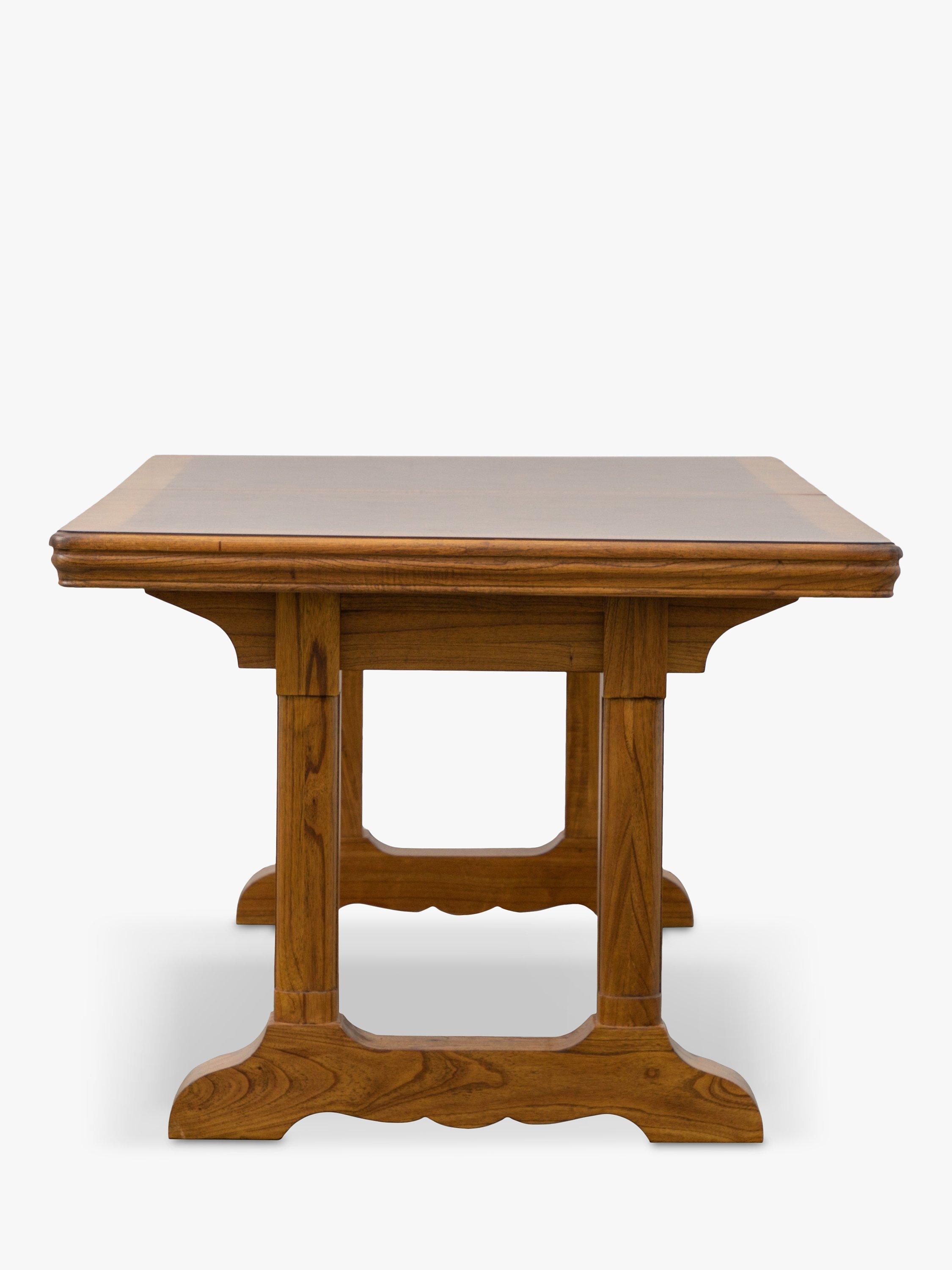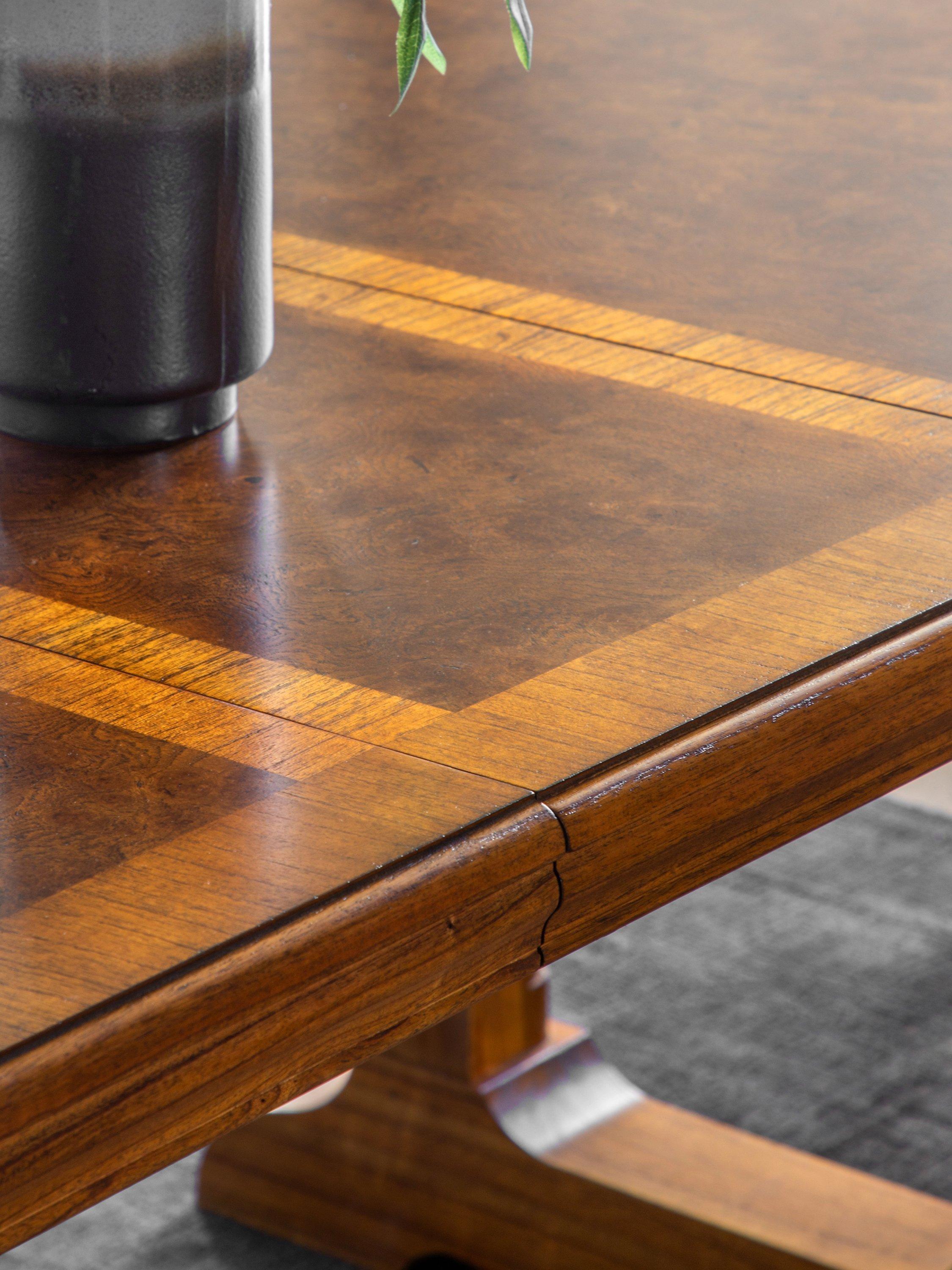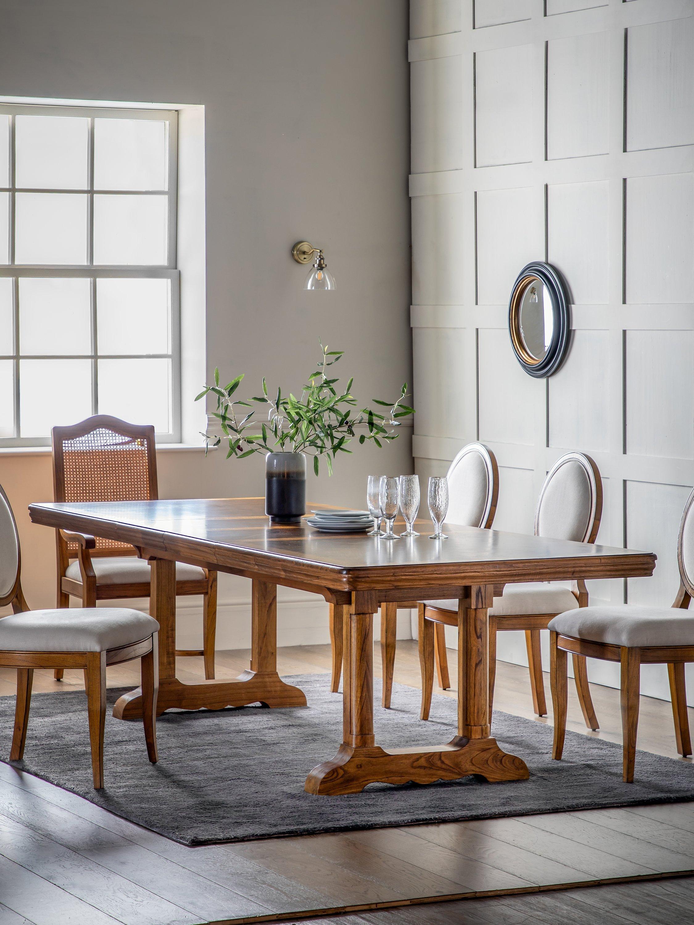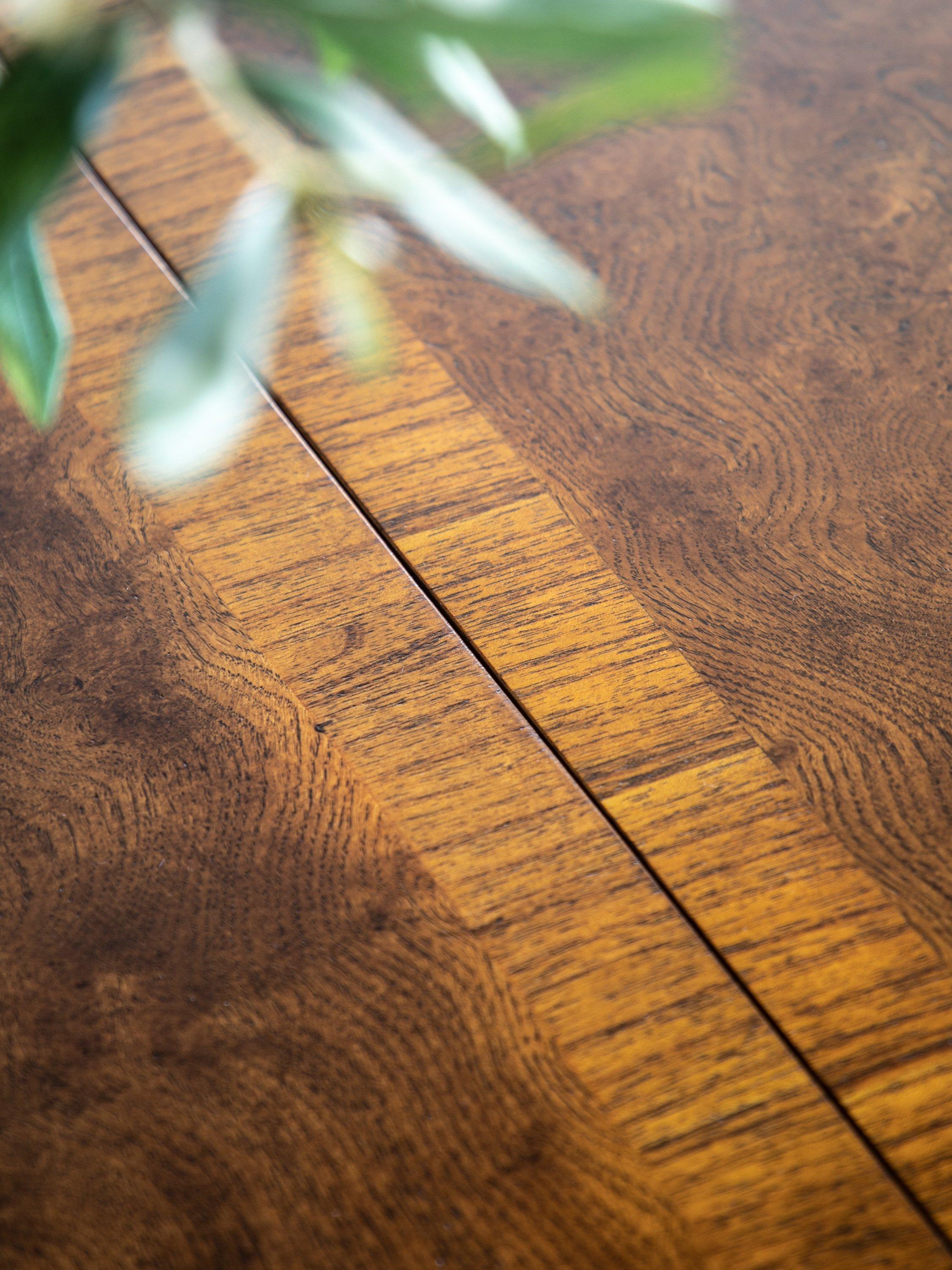 This formal dining table is made from melia ash solids and pippy oak veneers, and is hand-polished with wax lacquer. It features 2 extension leaves and seats 6-10, making it ideal for saving space in smaller dining rooms when not in use.
