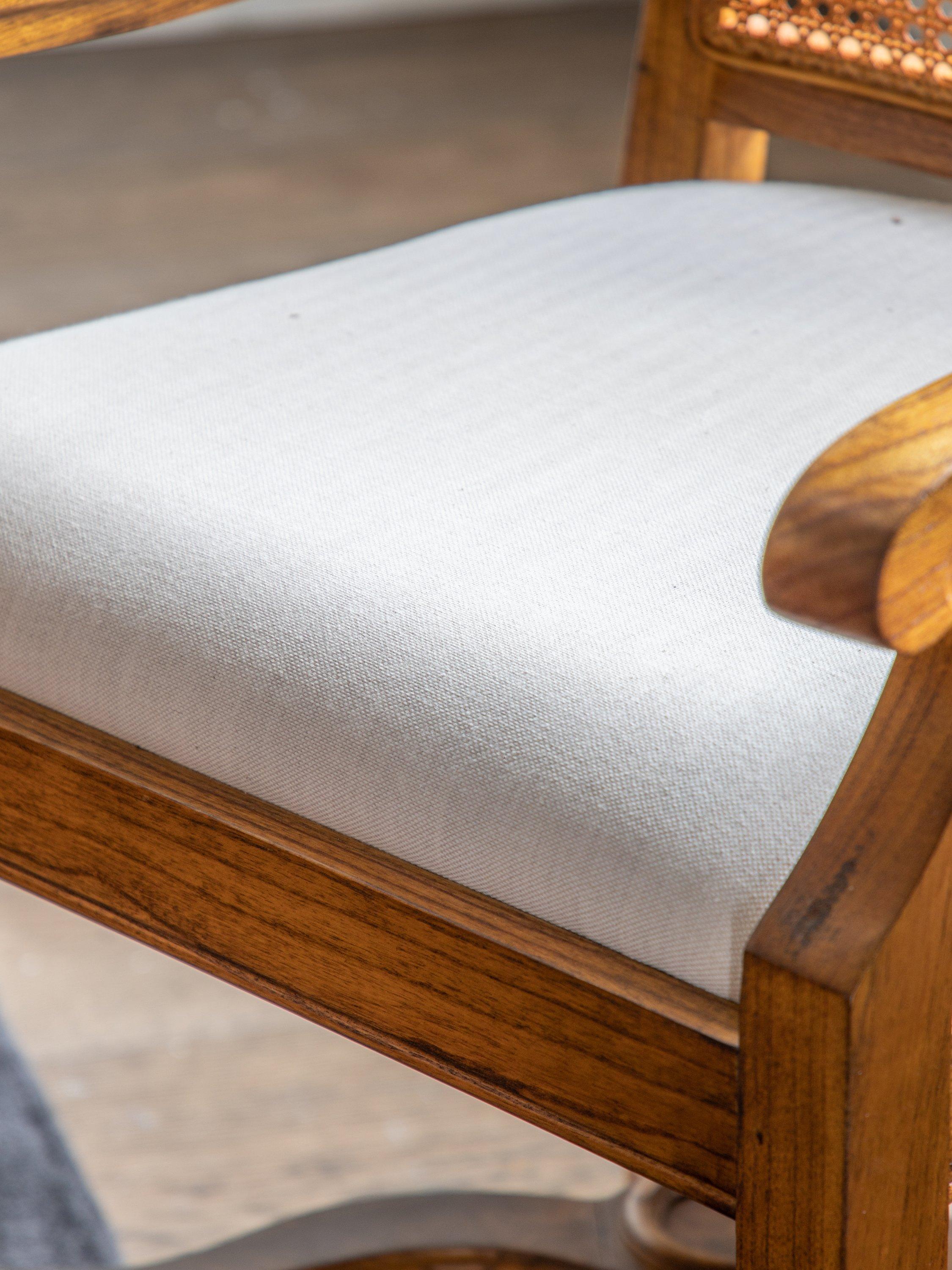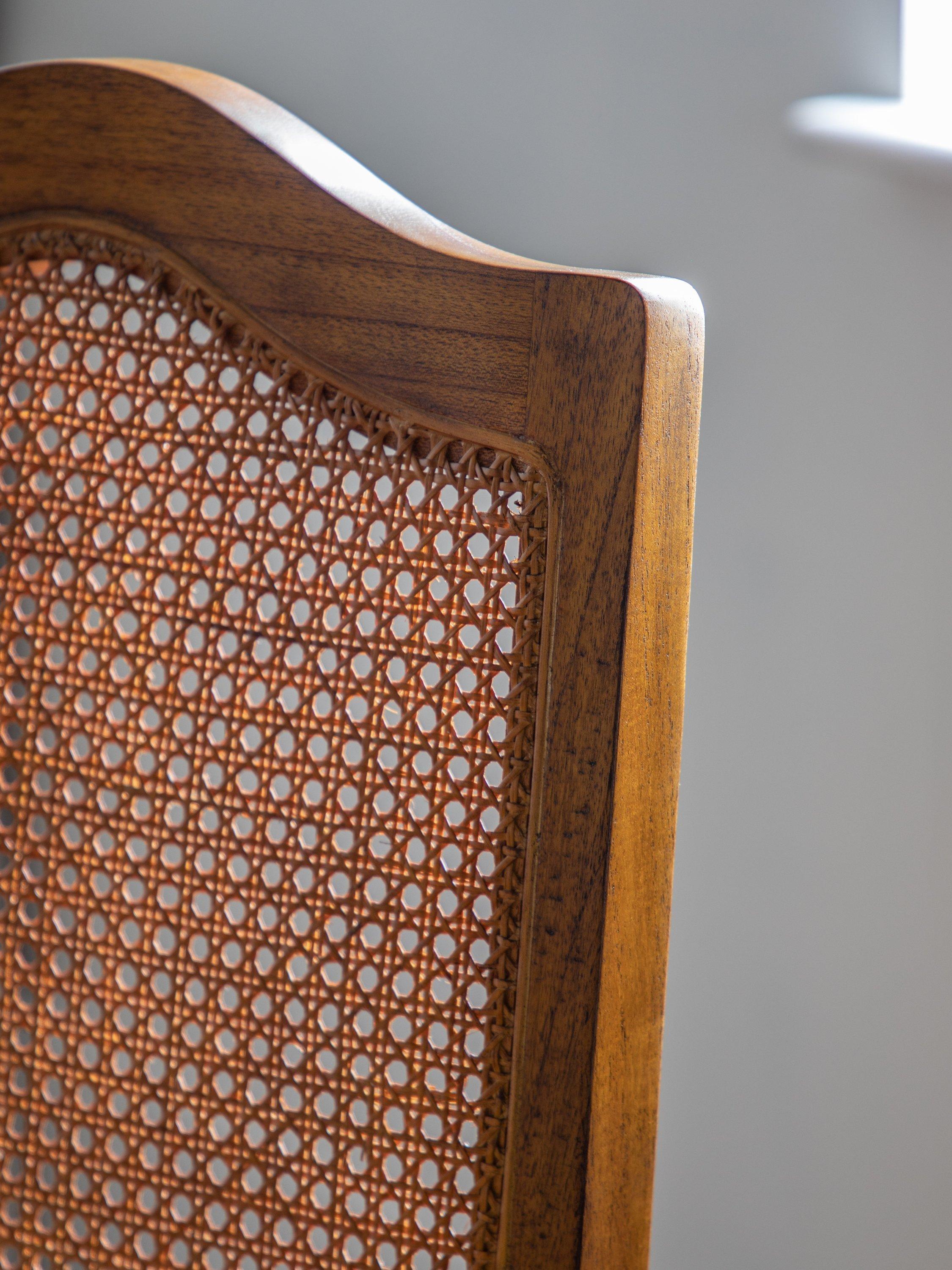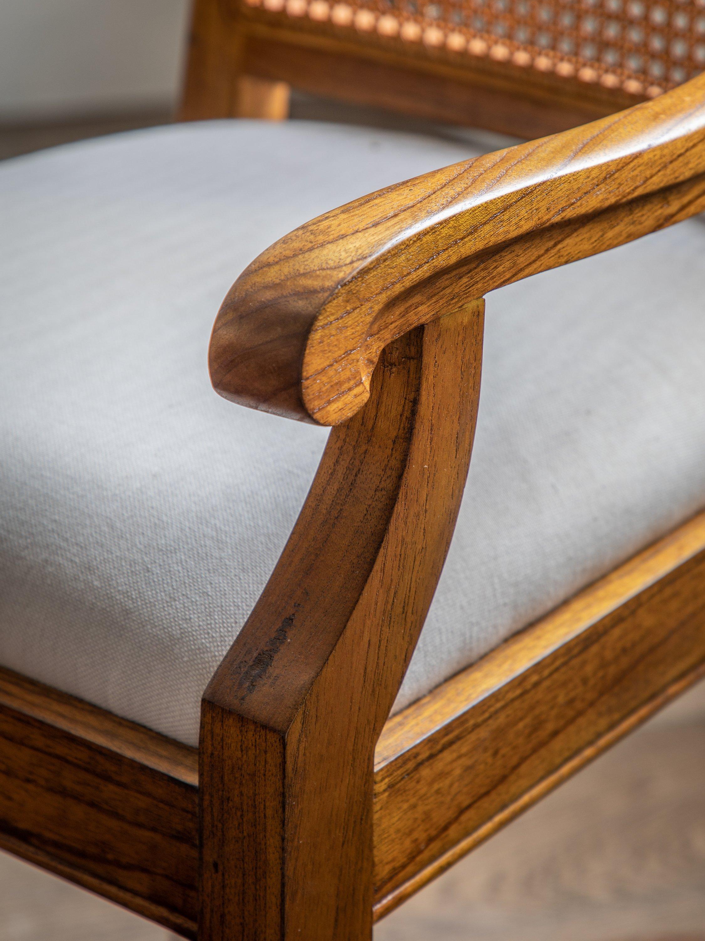 This armchair is made from melia ash and pippy oak veneers. With a cane backrest, plump upholstered seat, and X-shaped stretchers between the tapering legs., it would make a wonderful addition to your home.