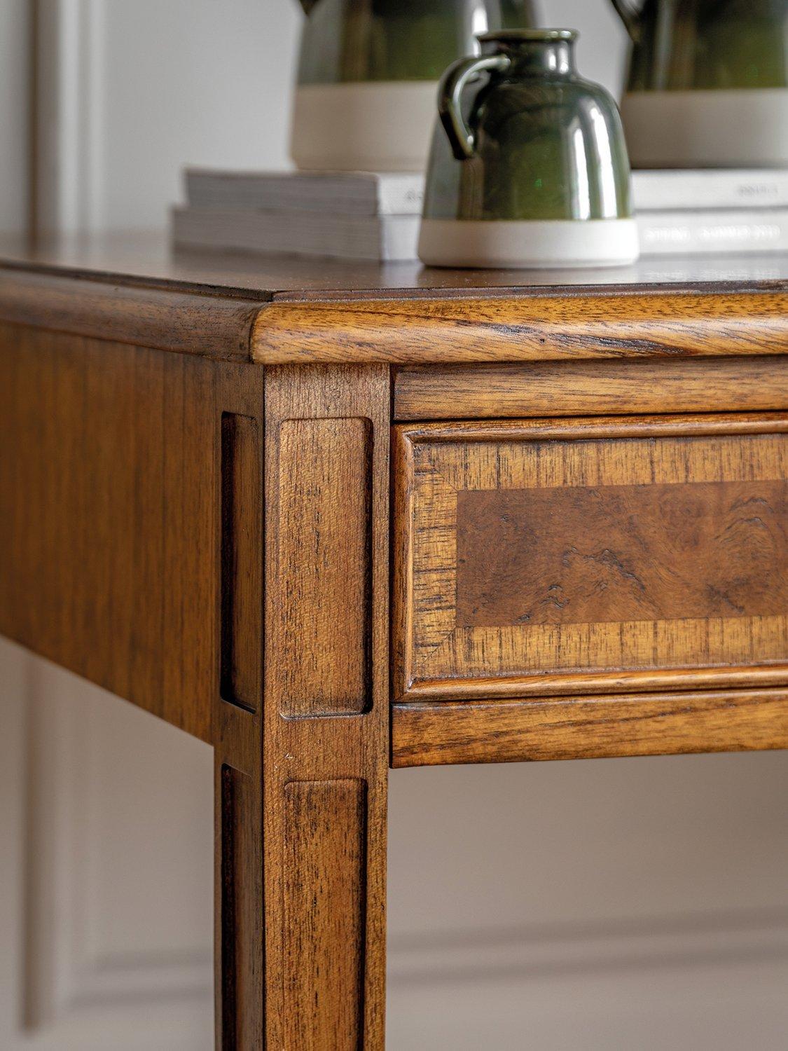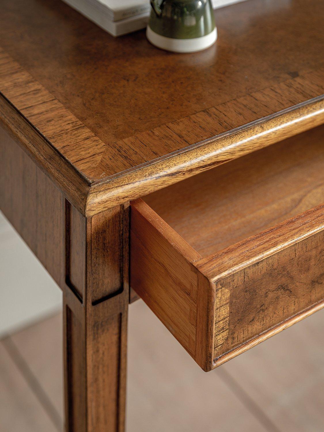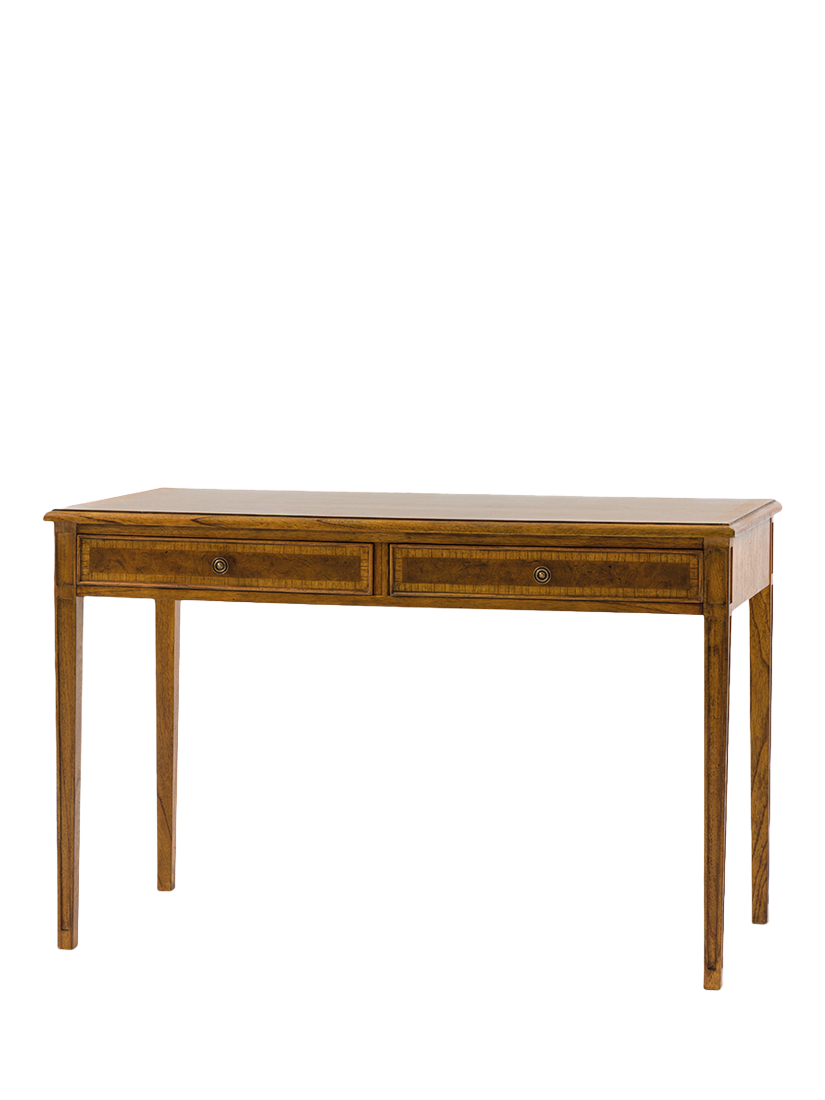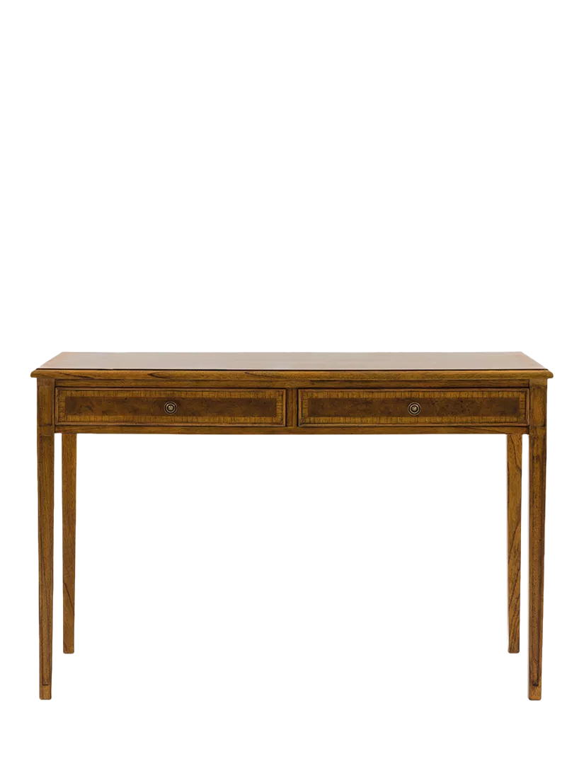 This formal two drawer desk is made from melia oak solids and pippy oak veneers and is hand-polished with wax lacquer. It’s finished with antiqued brass knob handles and provides essential storage space in your office whilst adding style and elegance as you work.