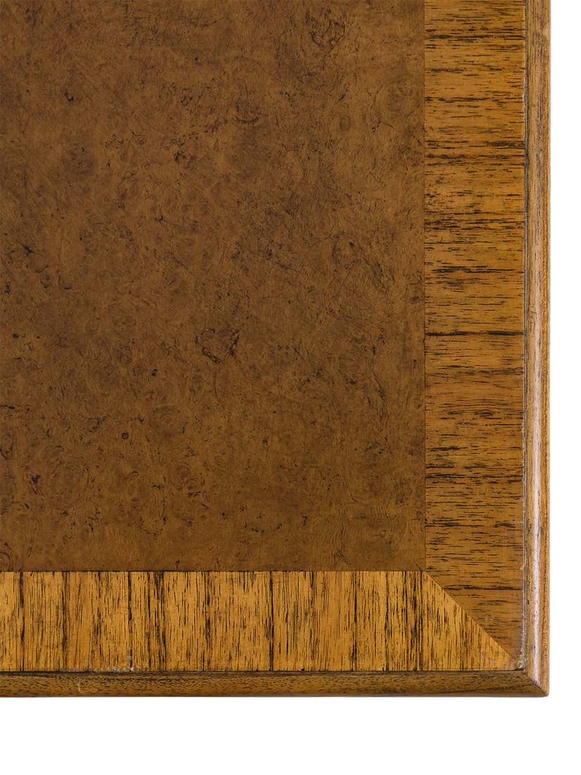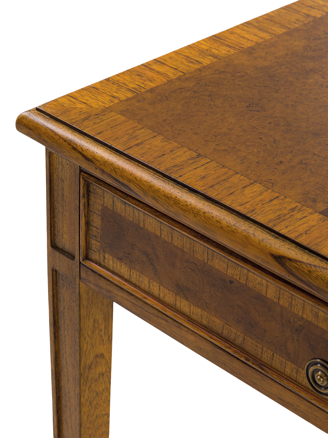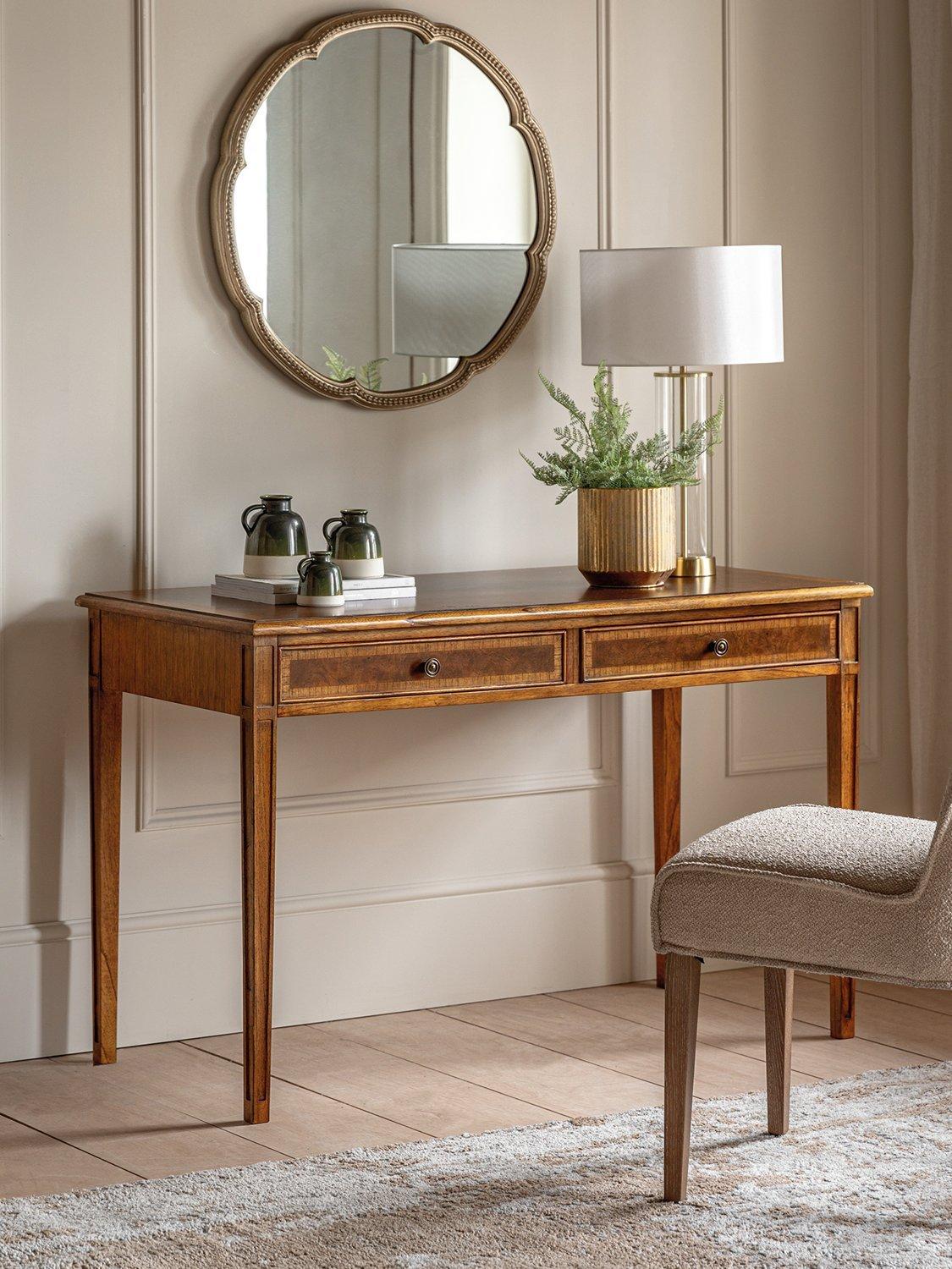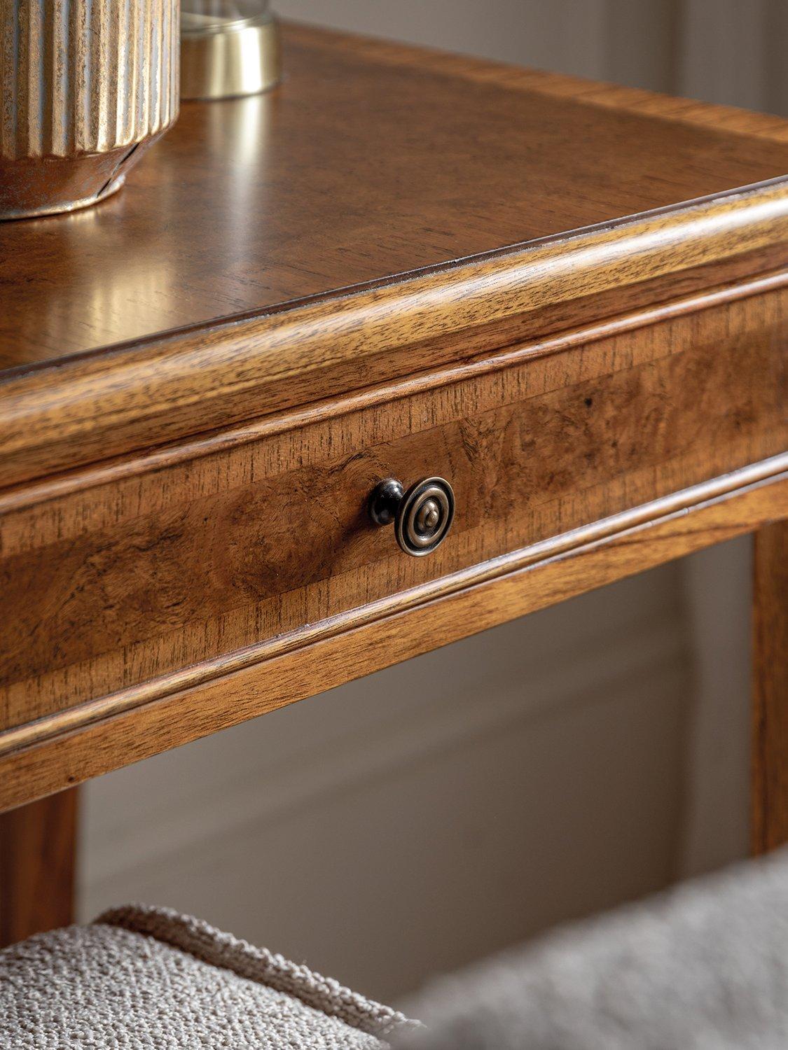 This formal two drawer desk is made from melia oak solids and pippy oak veneers and is hand-polished with wax lacquer. It’s finished with antiqued brass knob handles and provides essential storage space in your office whilst adding style and elegance as you work.