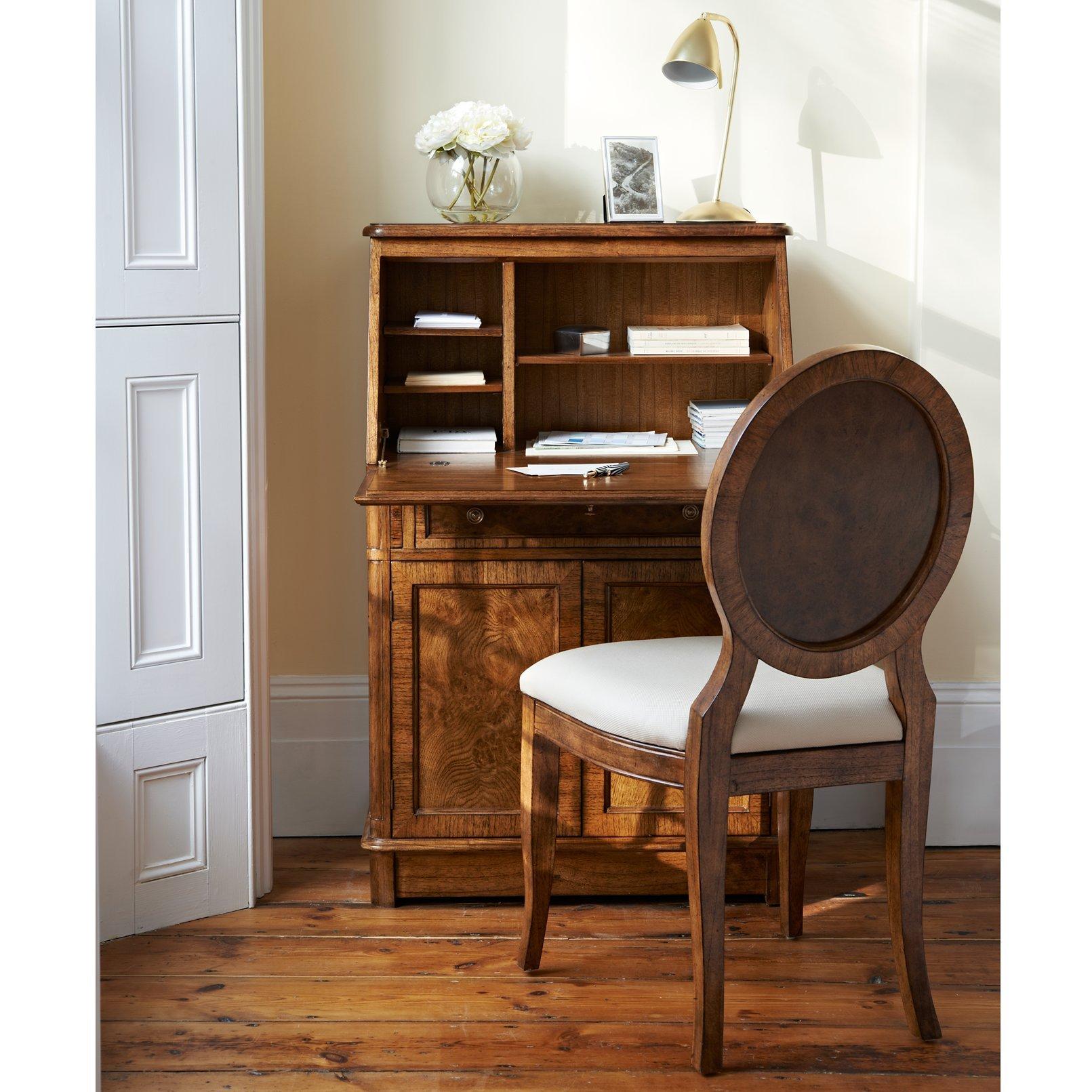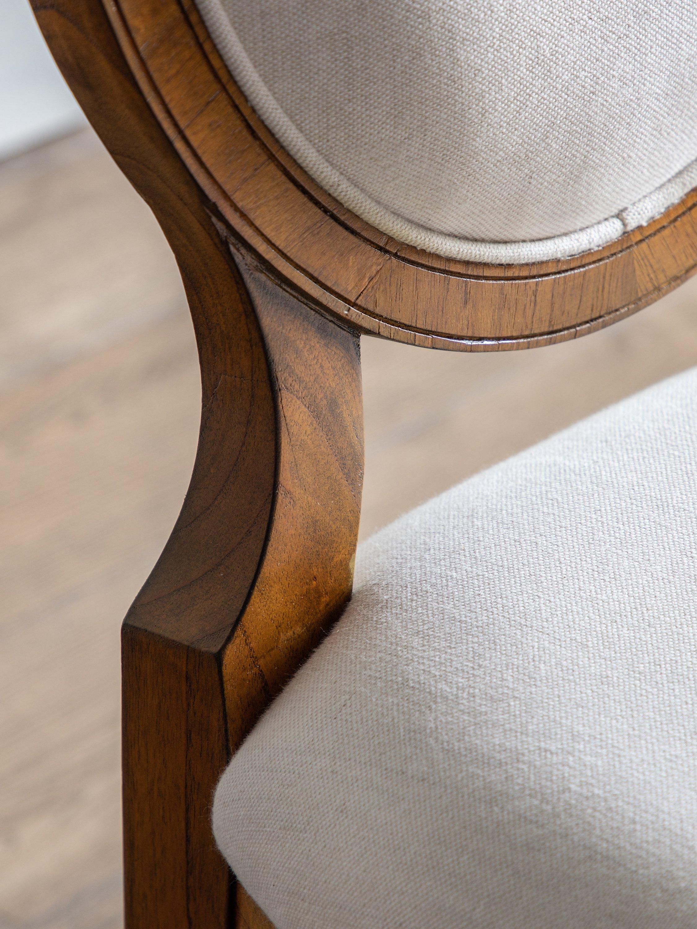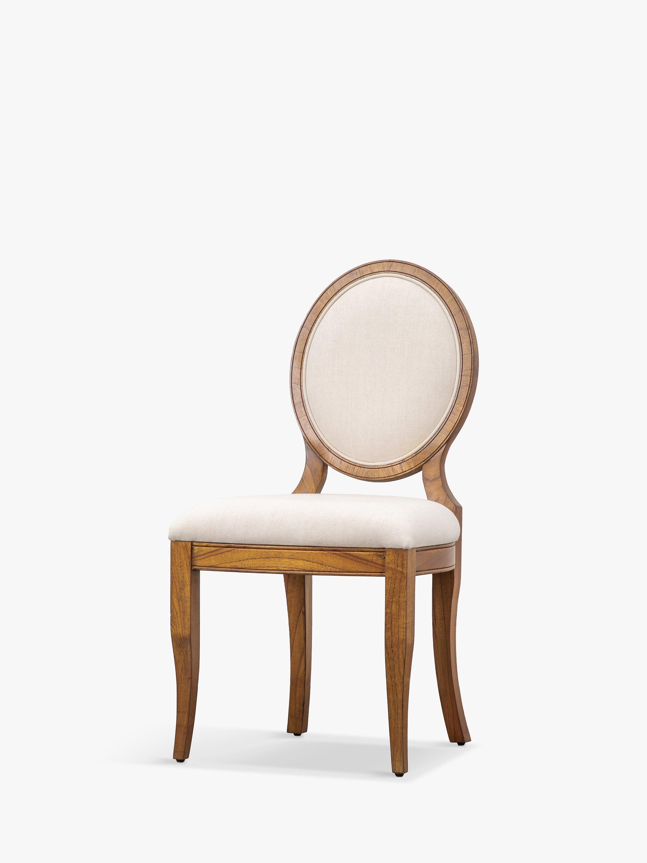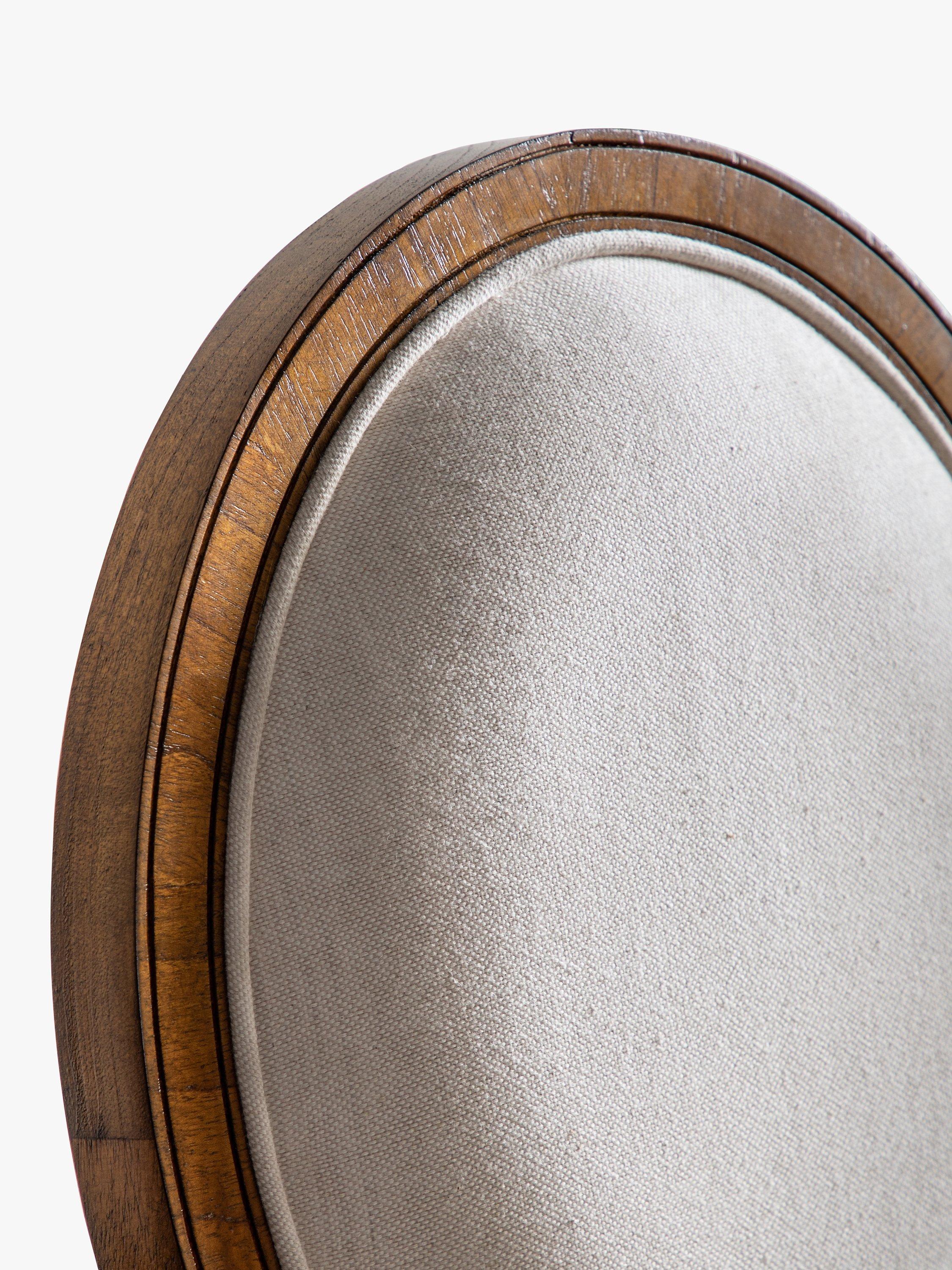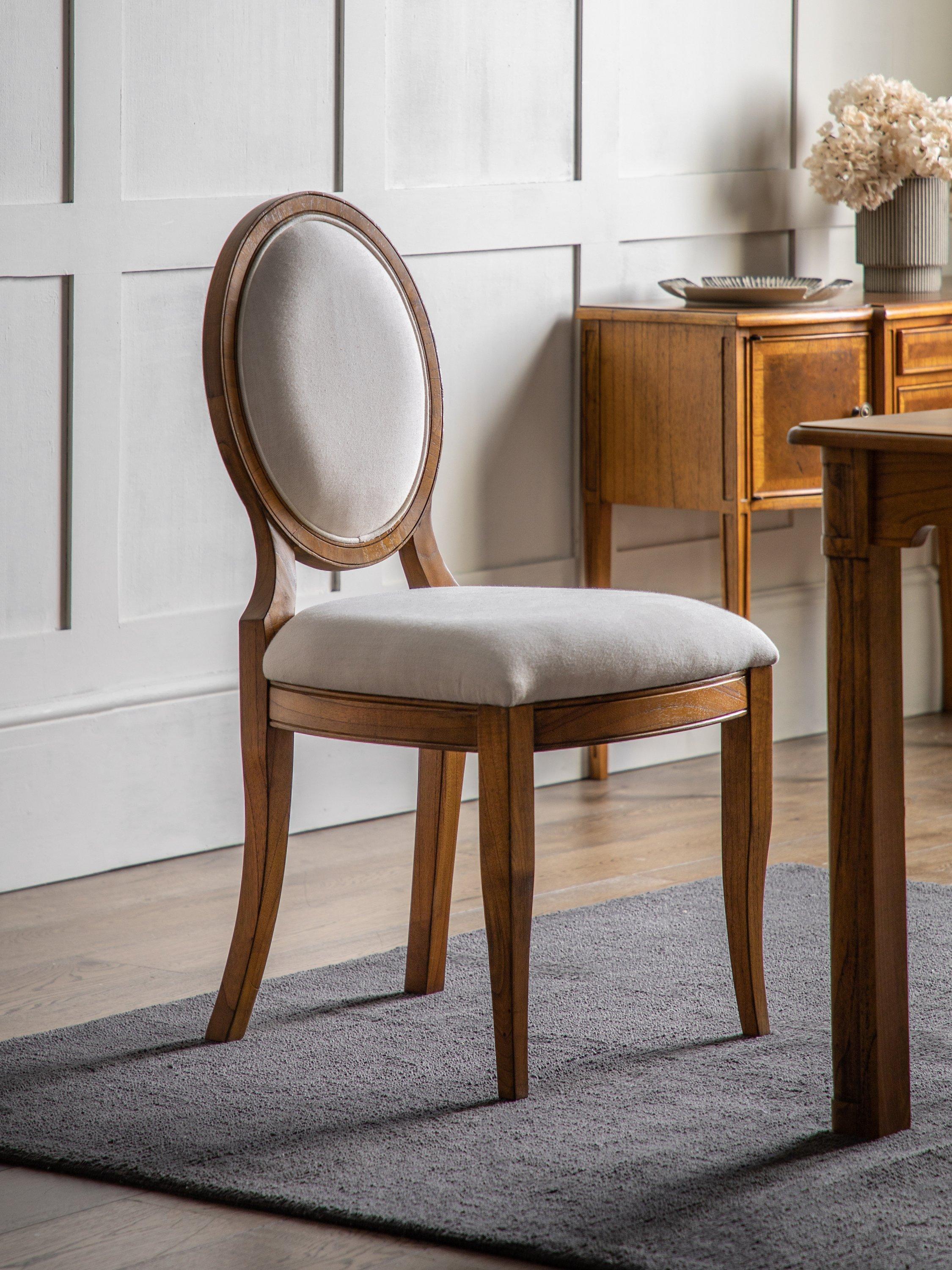 Dining chair made from solid ash and pipy oak veneers. With formal oval back, delicate turned feet, and plump upholstery on the seat and backrest.