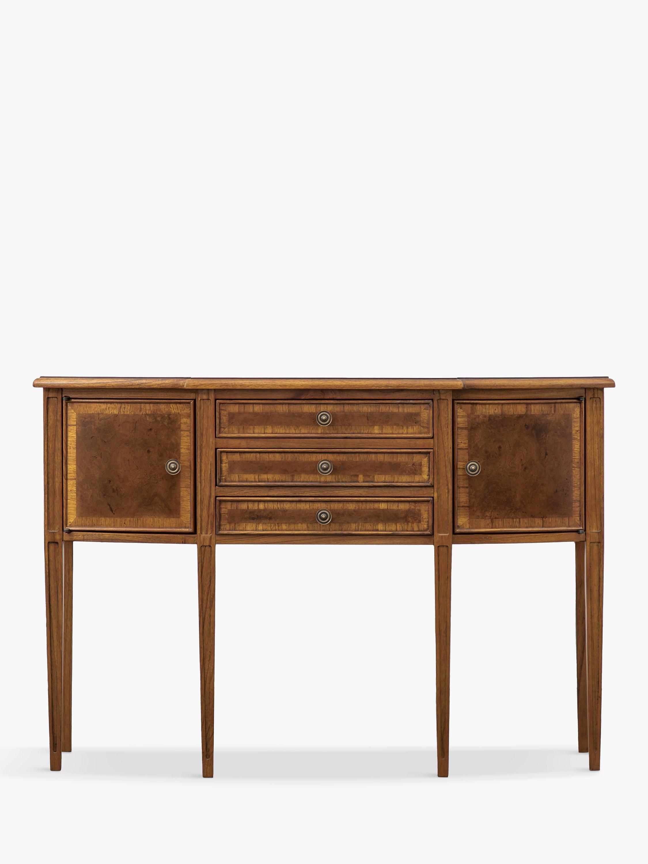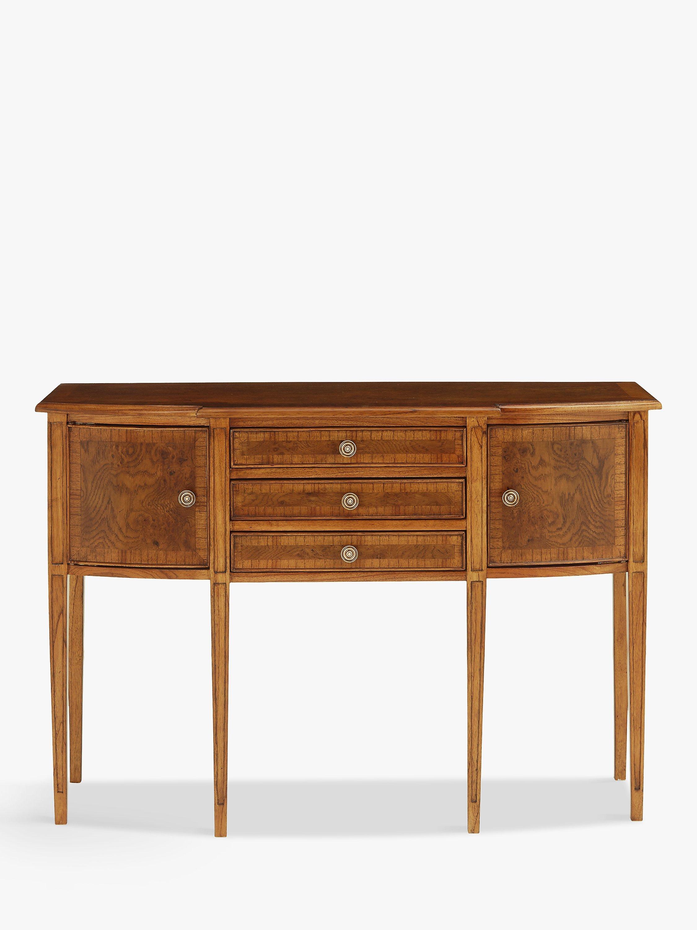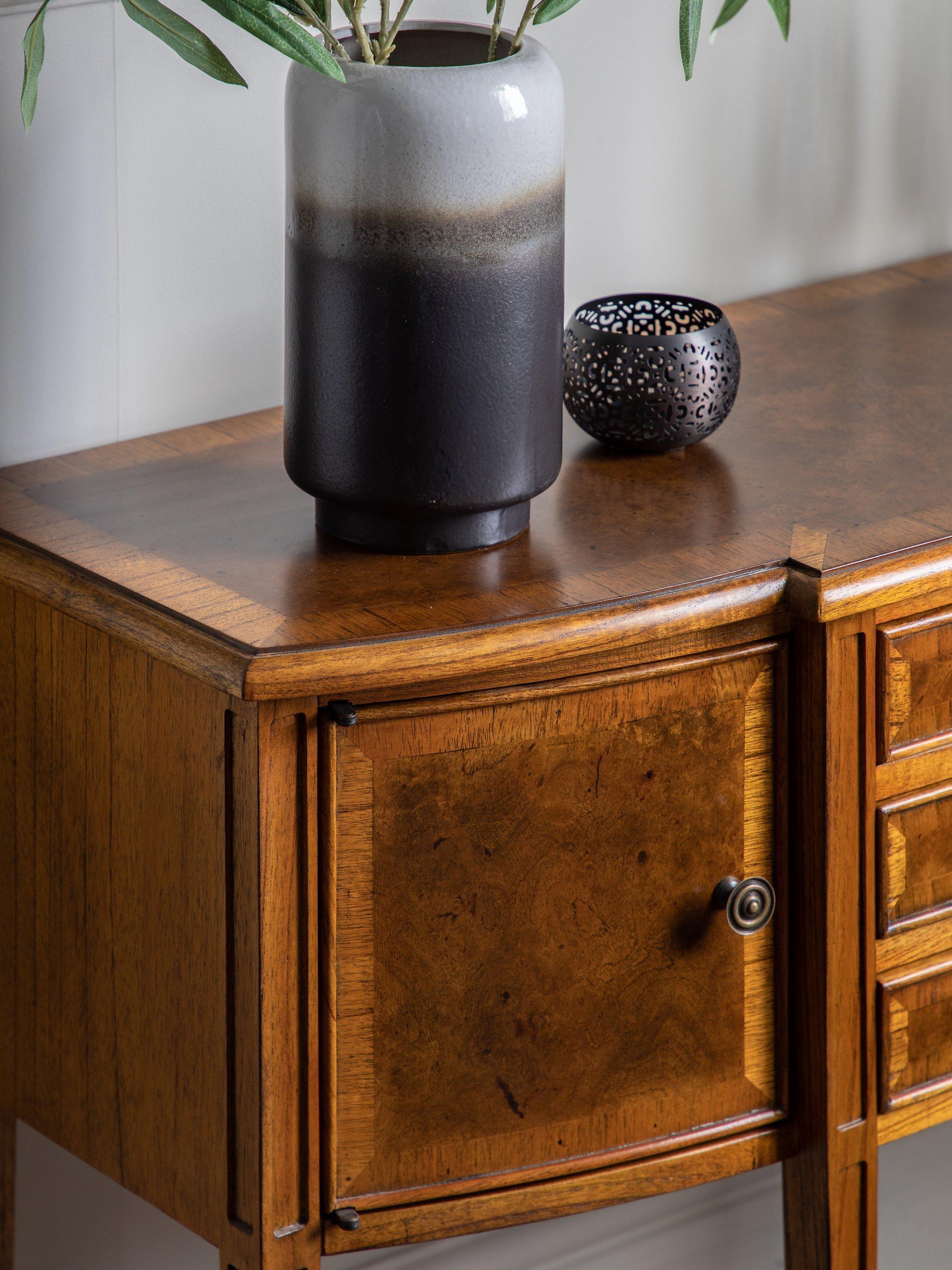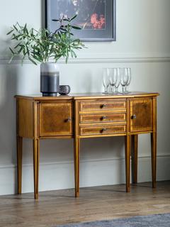 Our Hemingway range of furniture offers traditional, heritage-style designs, made from natural materials and built-to-last. This sideboard is made from melia oak solids and pippy oak veneers, stained in a rich, deep colour and hand-polished for durability with a wax lacquer. Antique brass knob handles complete its formal late 19th century aesthetic. There's plenty of storage space thanks to three spacious drawers and two cupboard sections to the side.