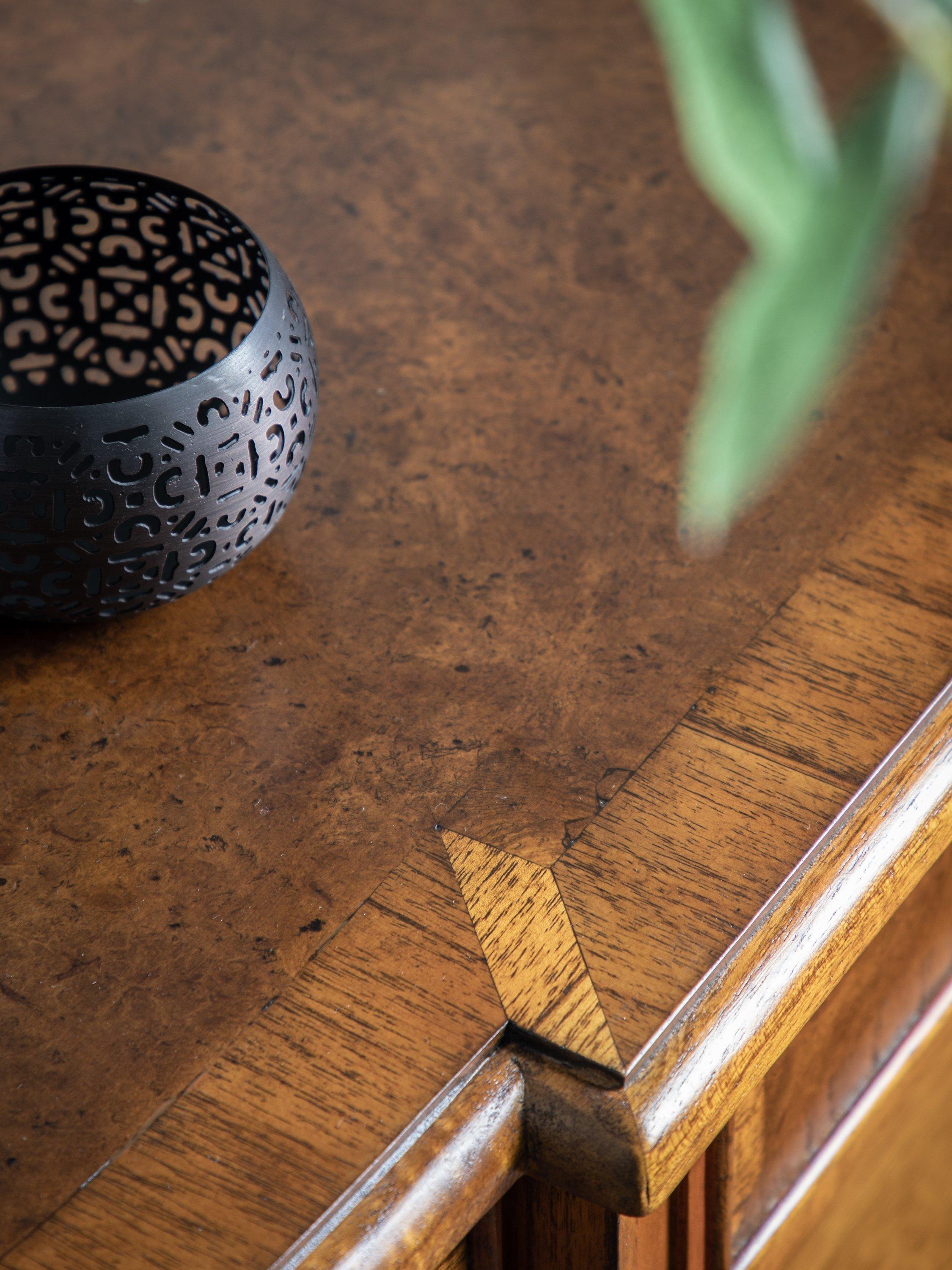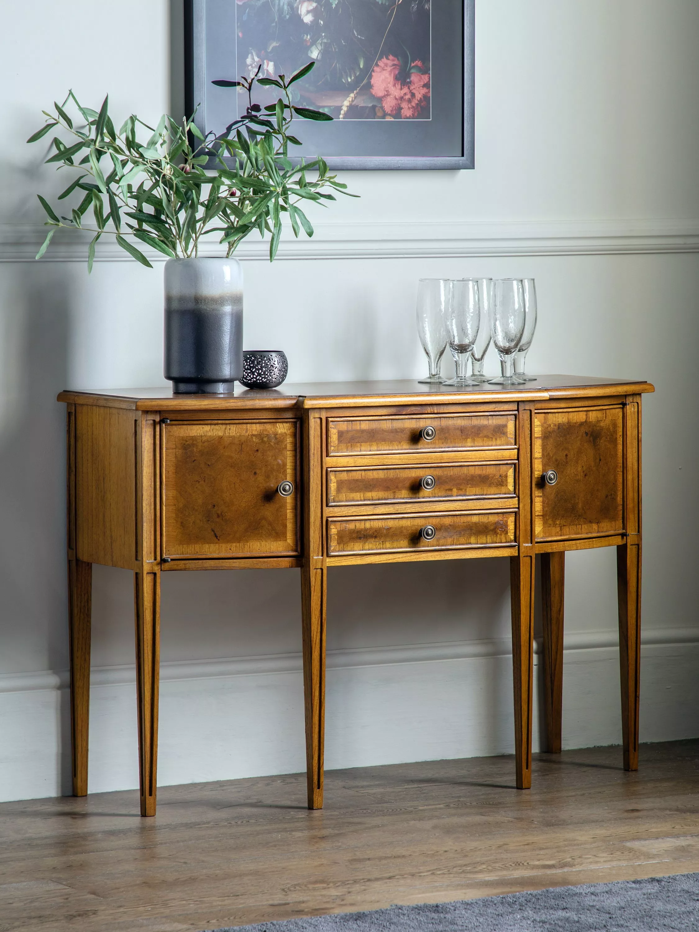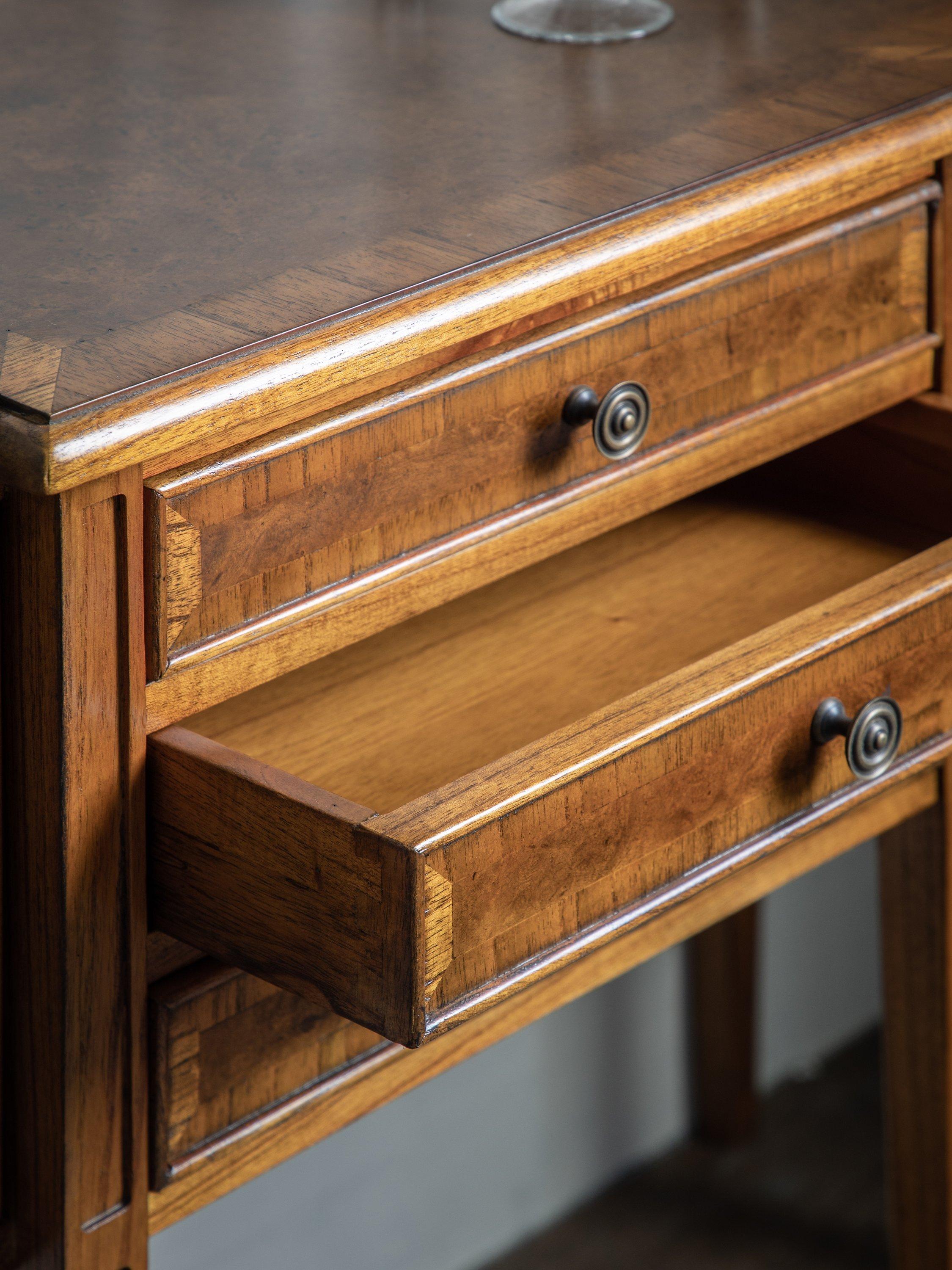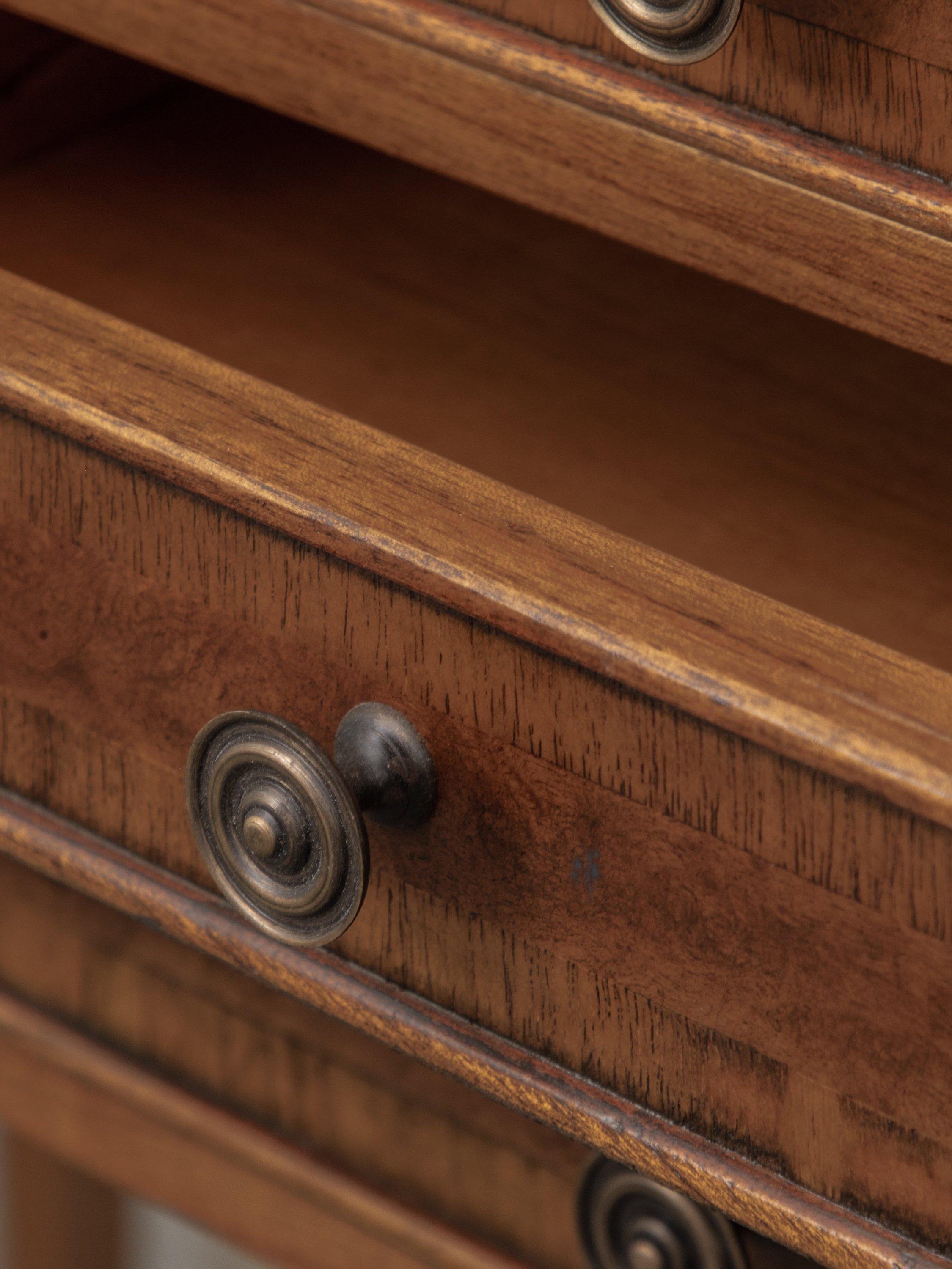 Our Hemingway range of furniture offers traditional, heritage-style designs, made from natural materials and built-to-last. This sideboard is made from melia oak solids and pippy oak veneers, stained in a rich, deep colour and hand-polished for durability with a wax lacquer. Antique brass knob handles complete its formal late 19th century aesthetic. There's plenty of storage space thanks to three spacious drawers and two cupboard sections to the side.