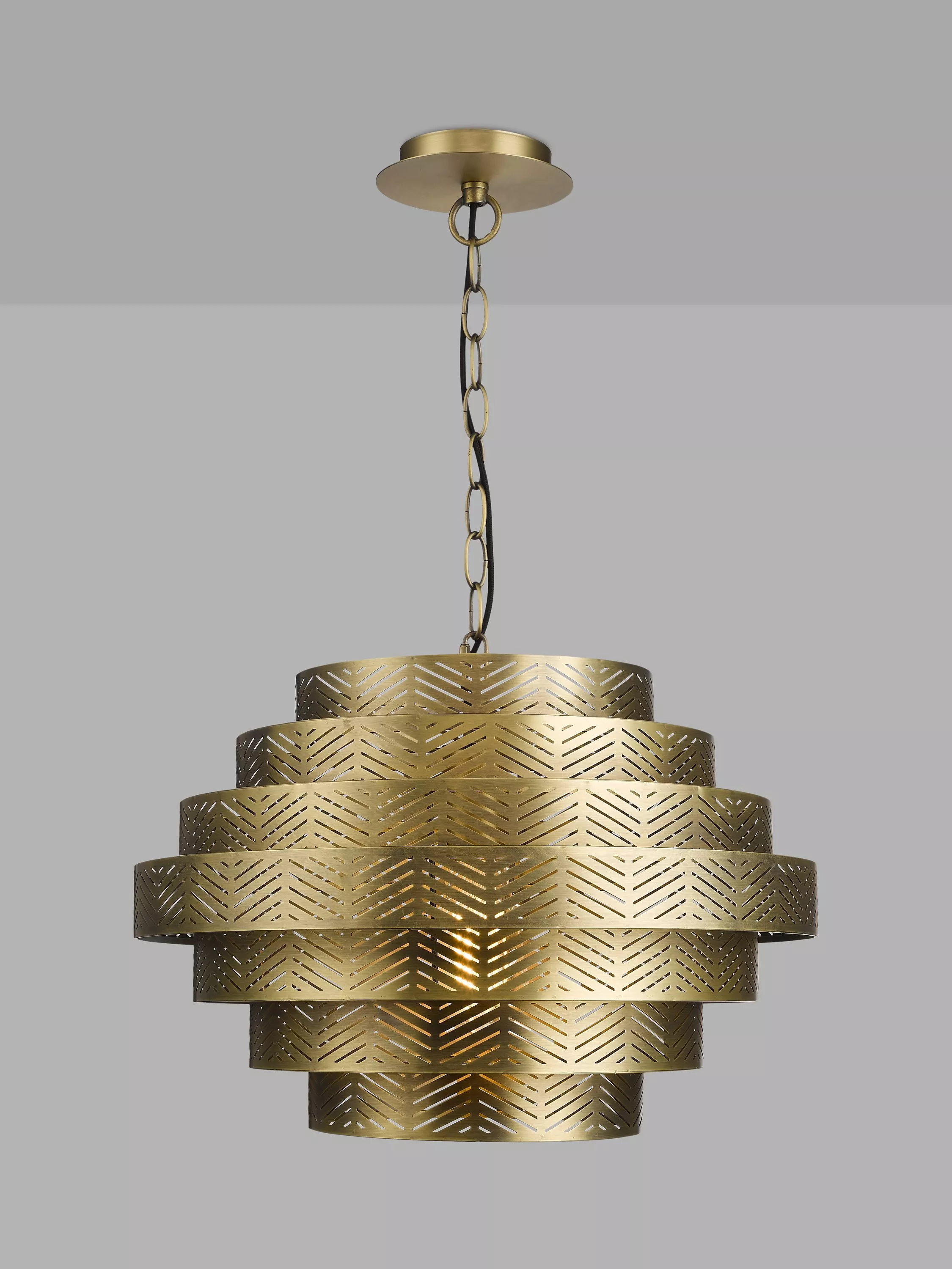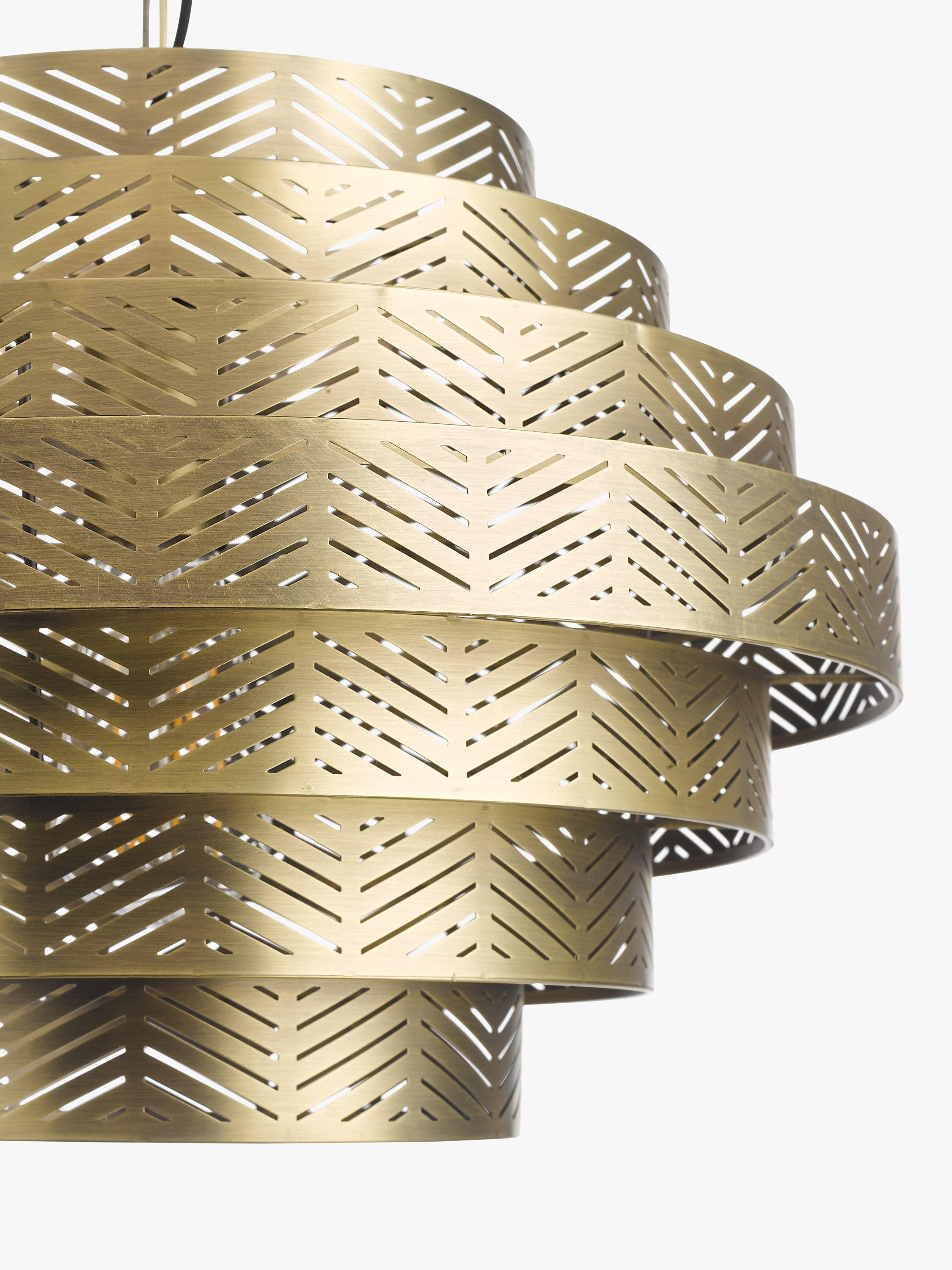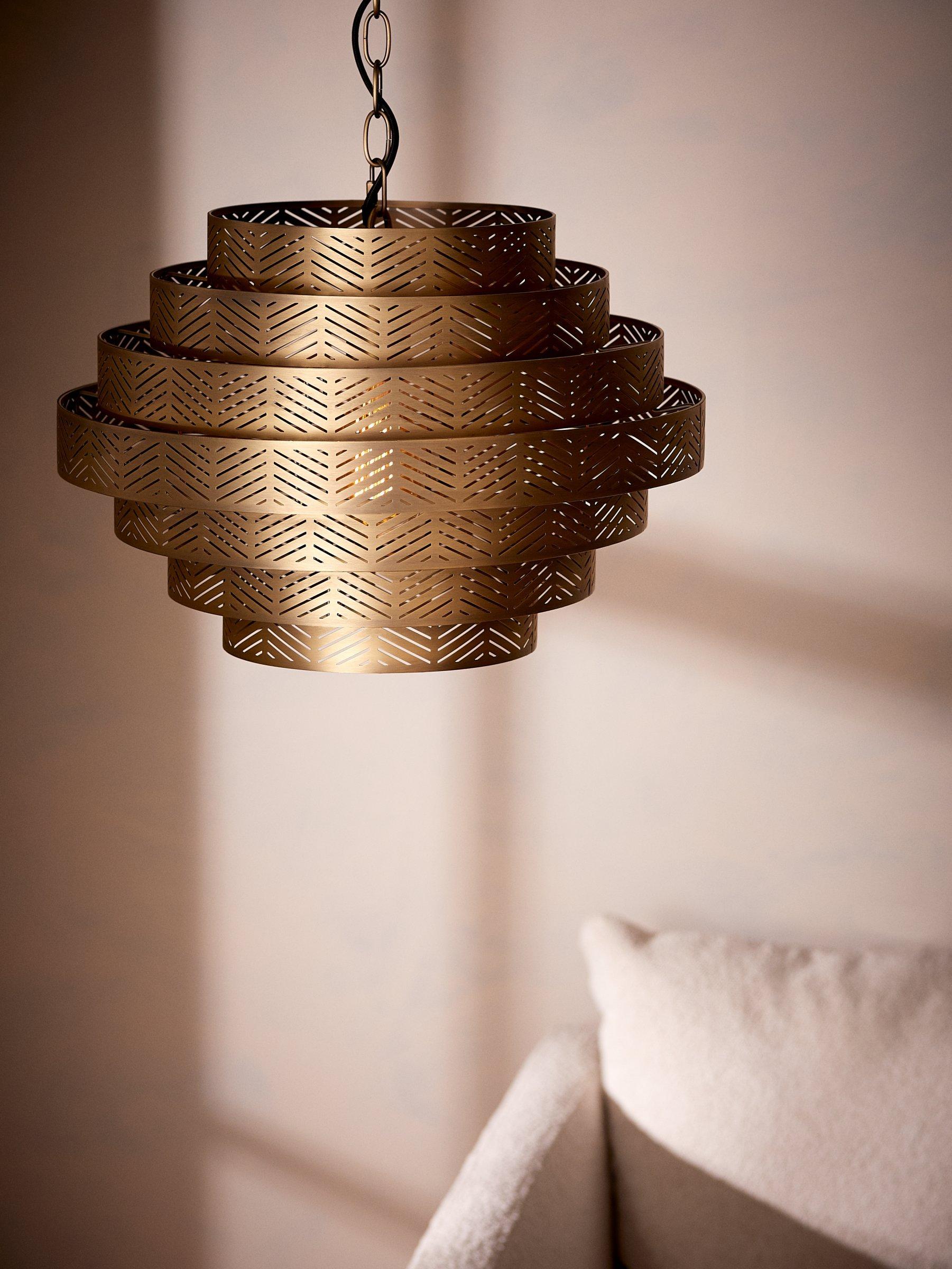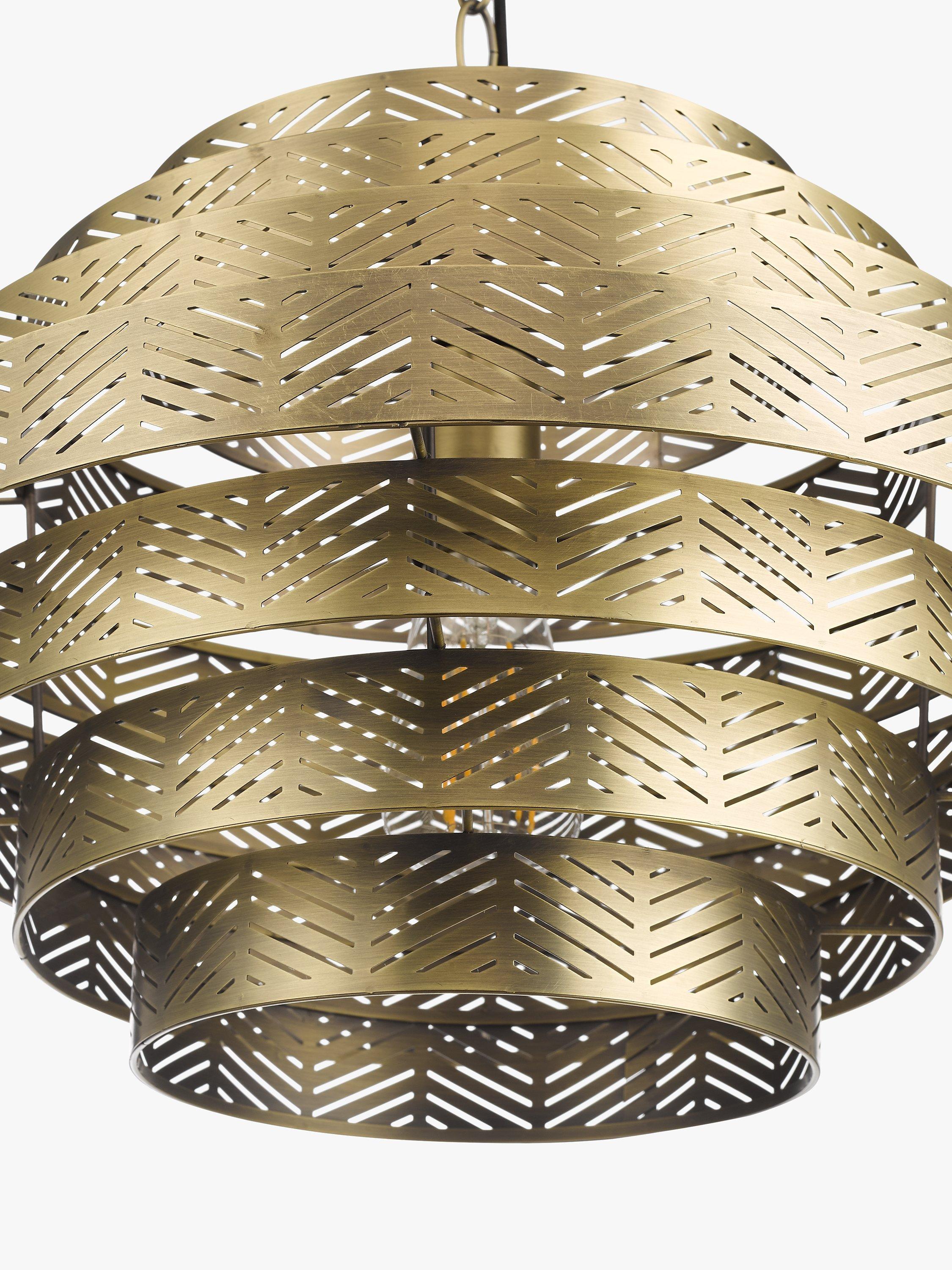 Light projects up and down this ceiling light, which is made from metal and pierced with zig-zag cuts in a fretwork herringbone pattern. Formed with seven layers and tapering at the top and bottom, the antique brass finish gives its Art-Deco inspired design an industrial edge. It's suspended from a height-adjustable chain cable and well-suited in living rooms and hallways.