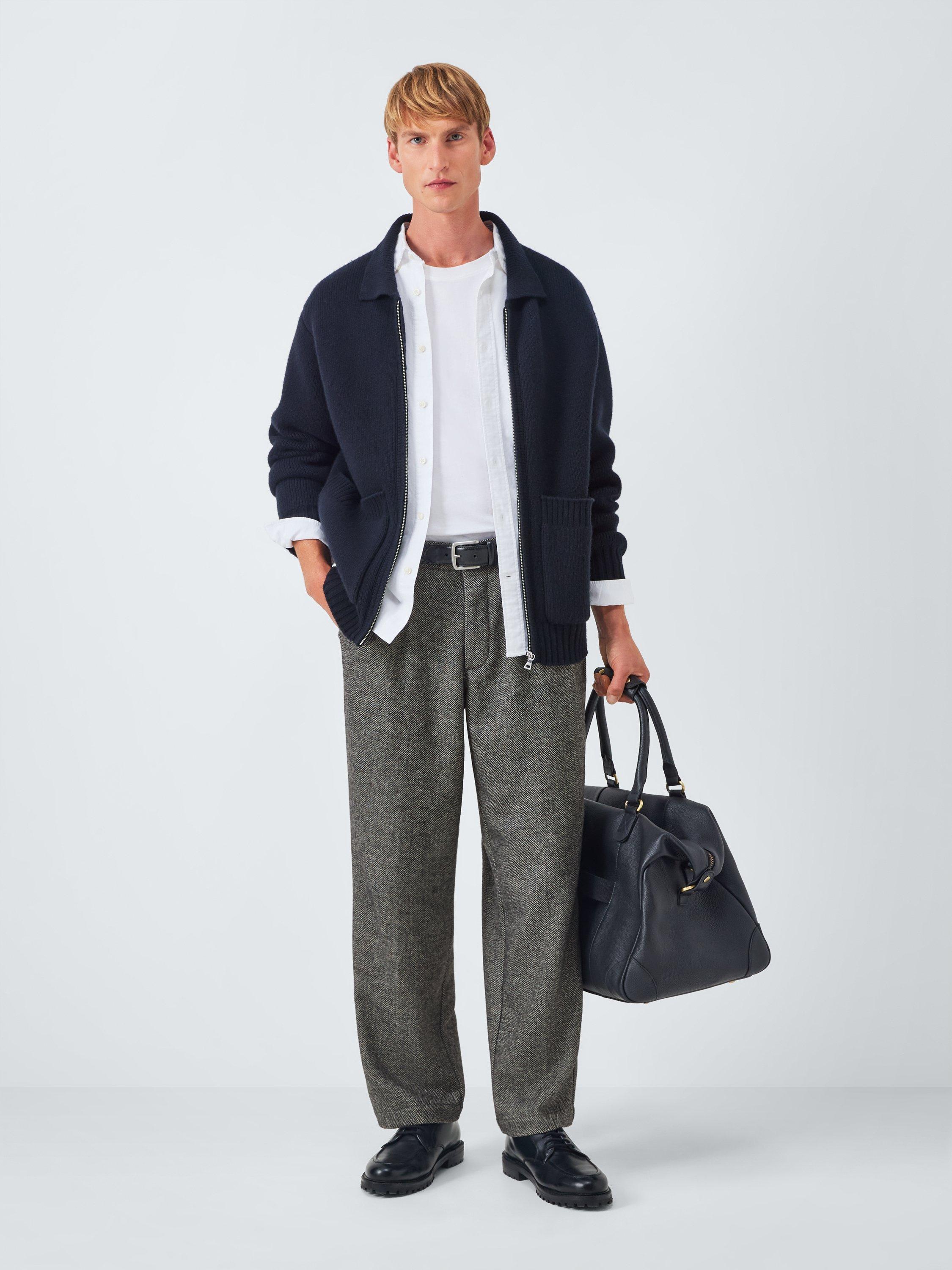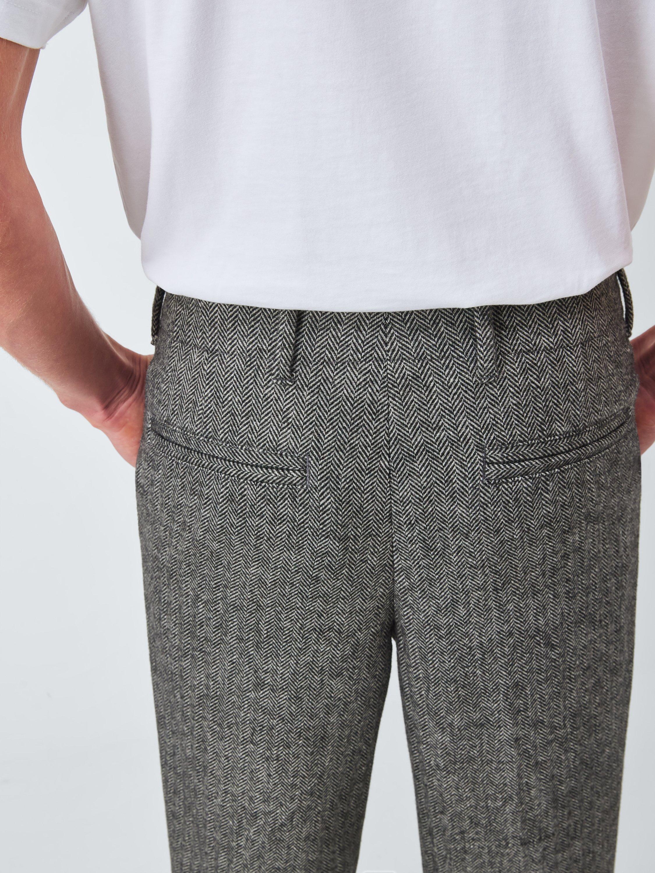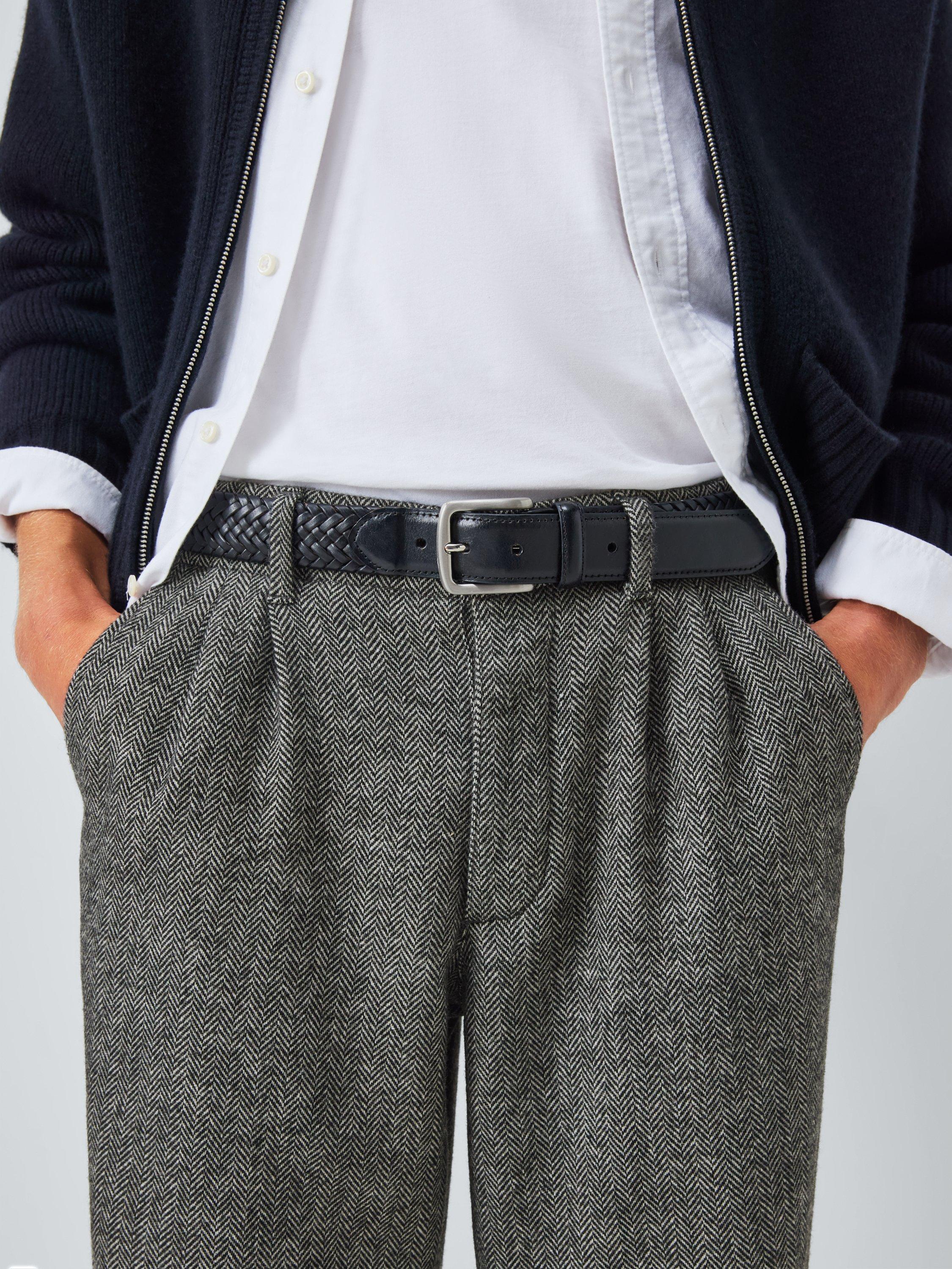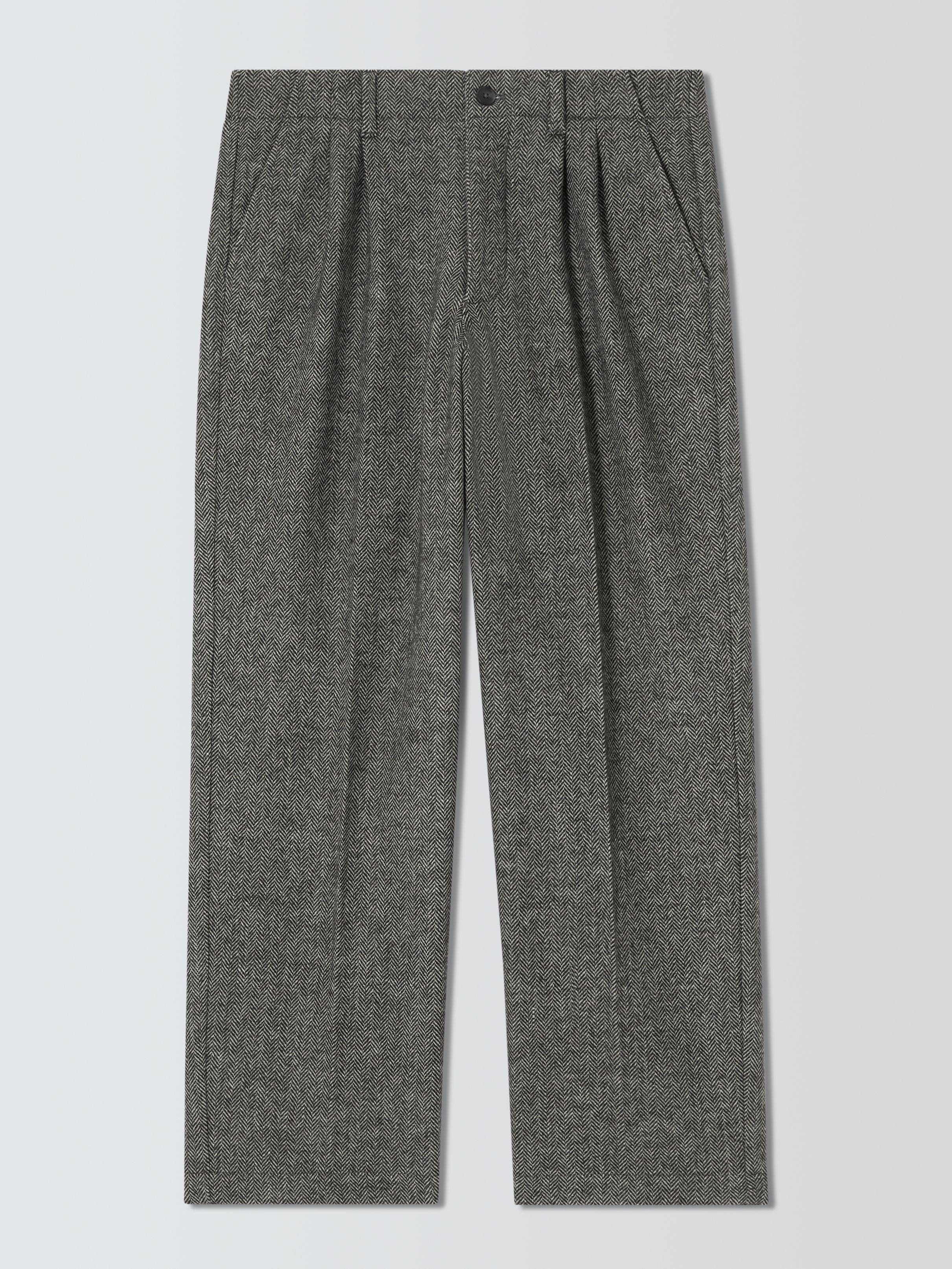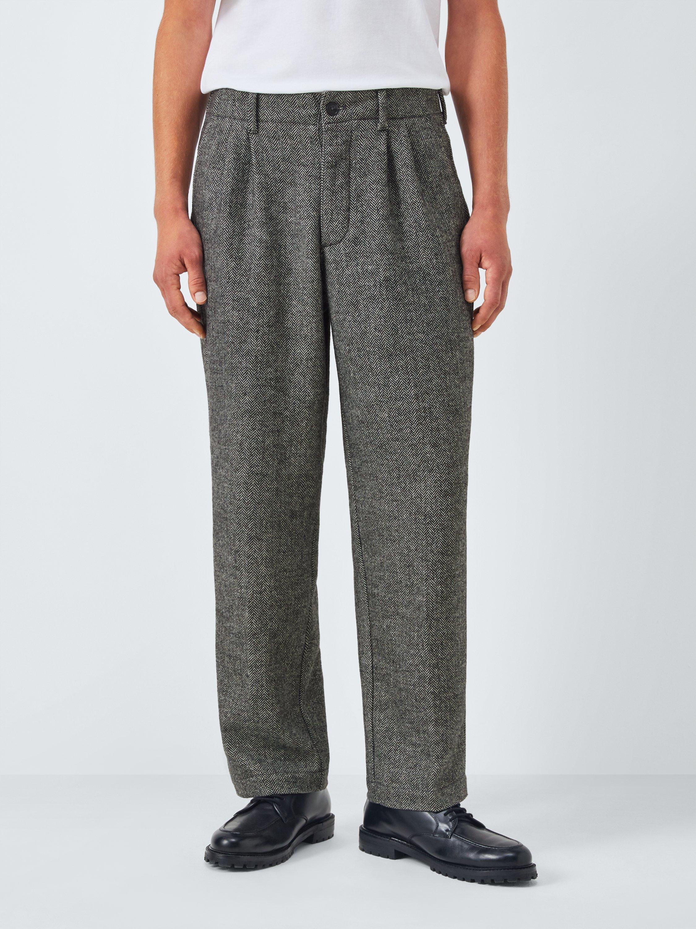 Straight herringbone trousers with double pleats, two side pockets, two back pockets and standard belt loops.