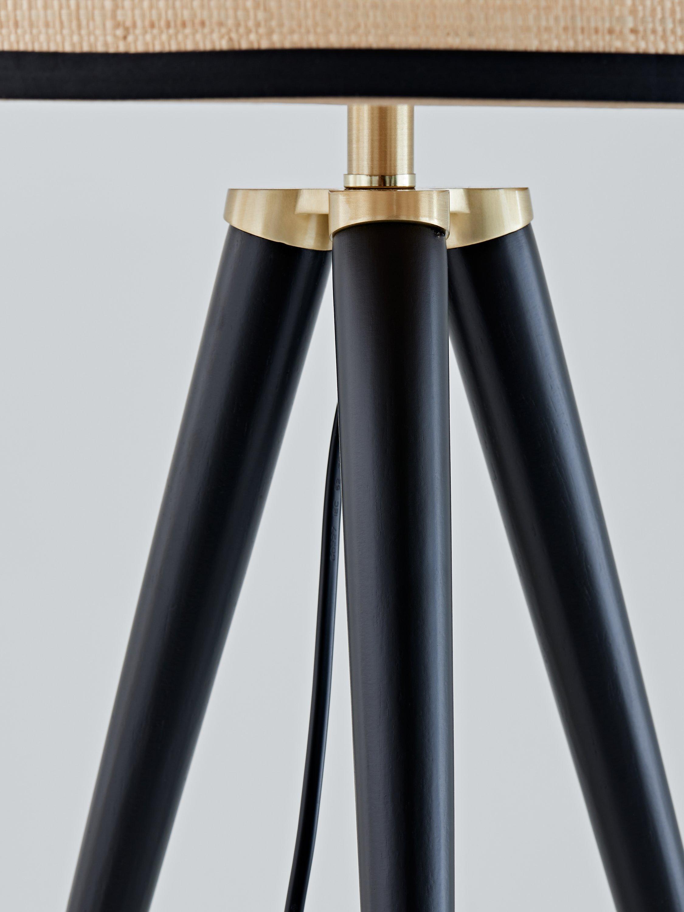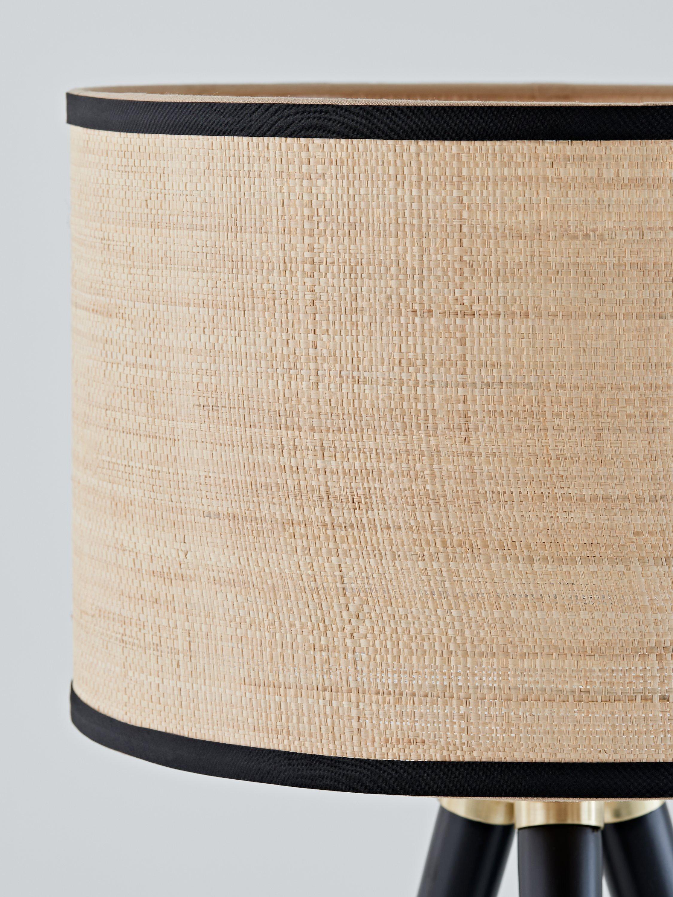 Our Herschel table lamp has a contemporary tripod design with natural elements including wood tripod legs and a short natural raffia grass drum shade. The textured shade disperses light from a 10W LED bulb. The sturdy and stylish design features antique brass detailing. Lamp shade trim matches the wood stain finish on the tripod legs.