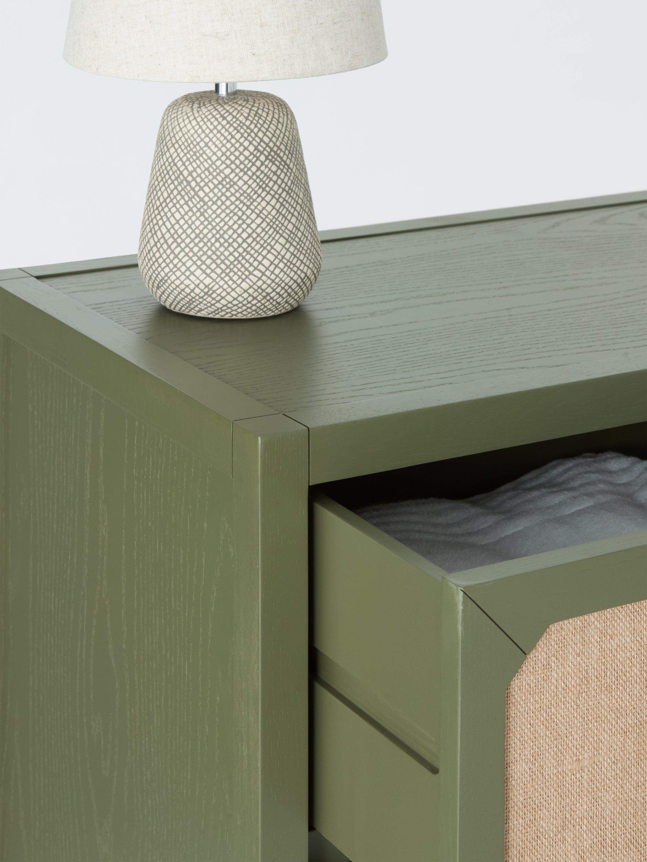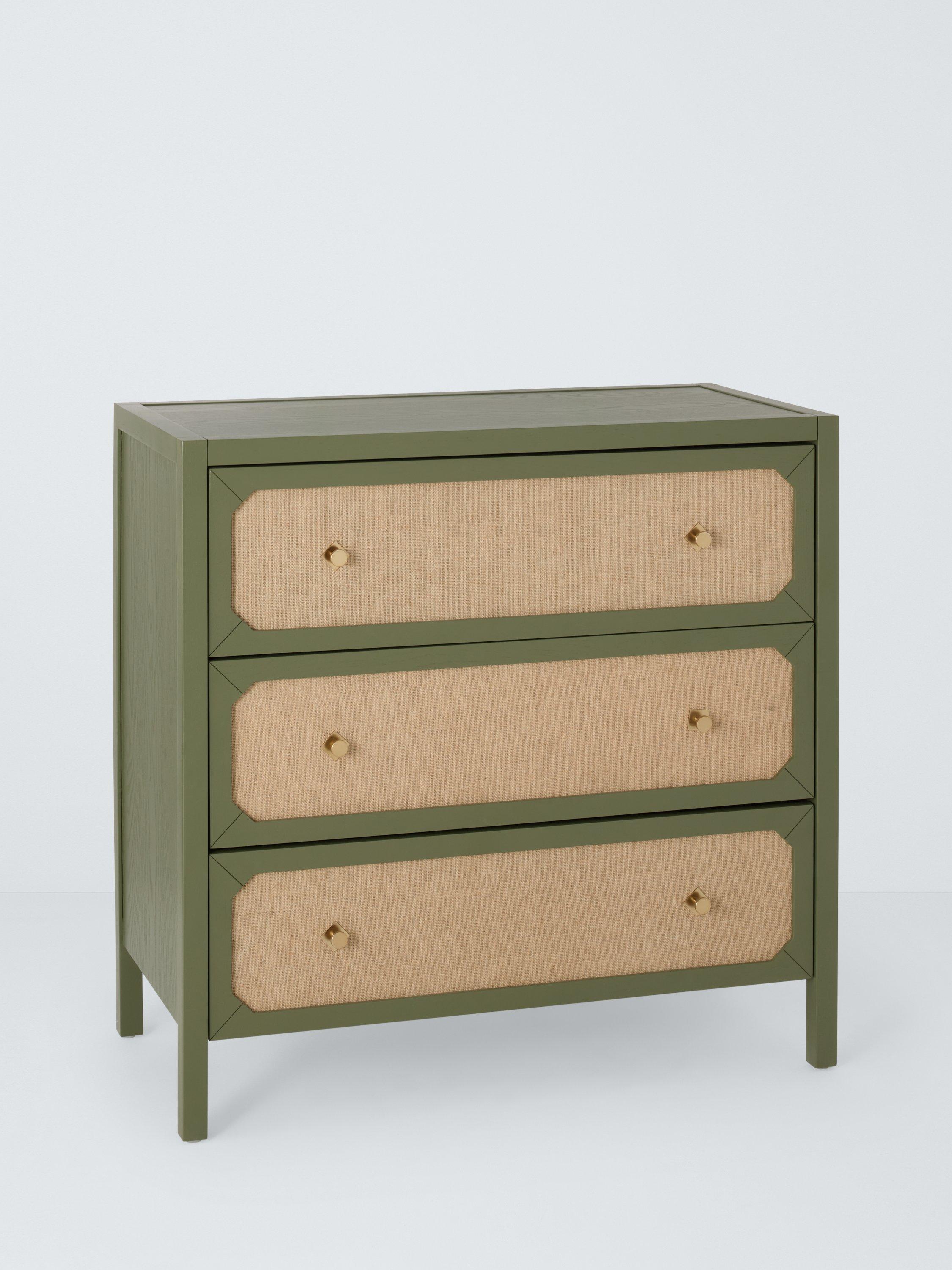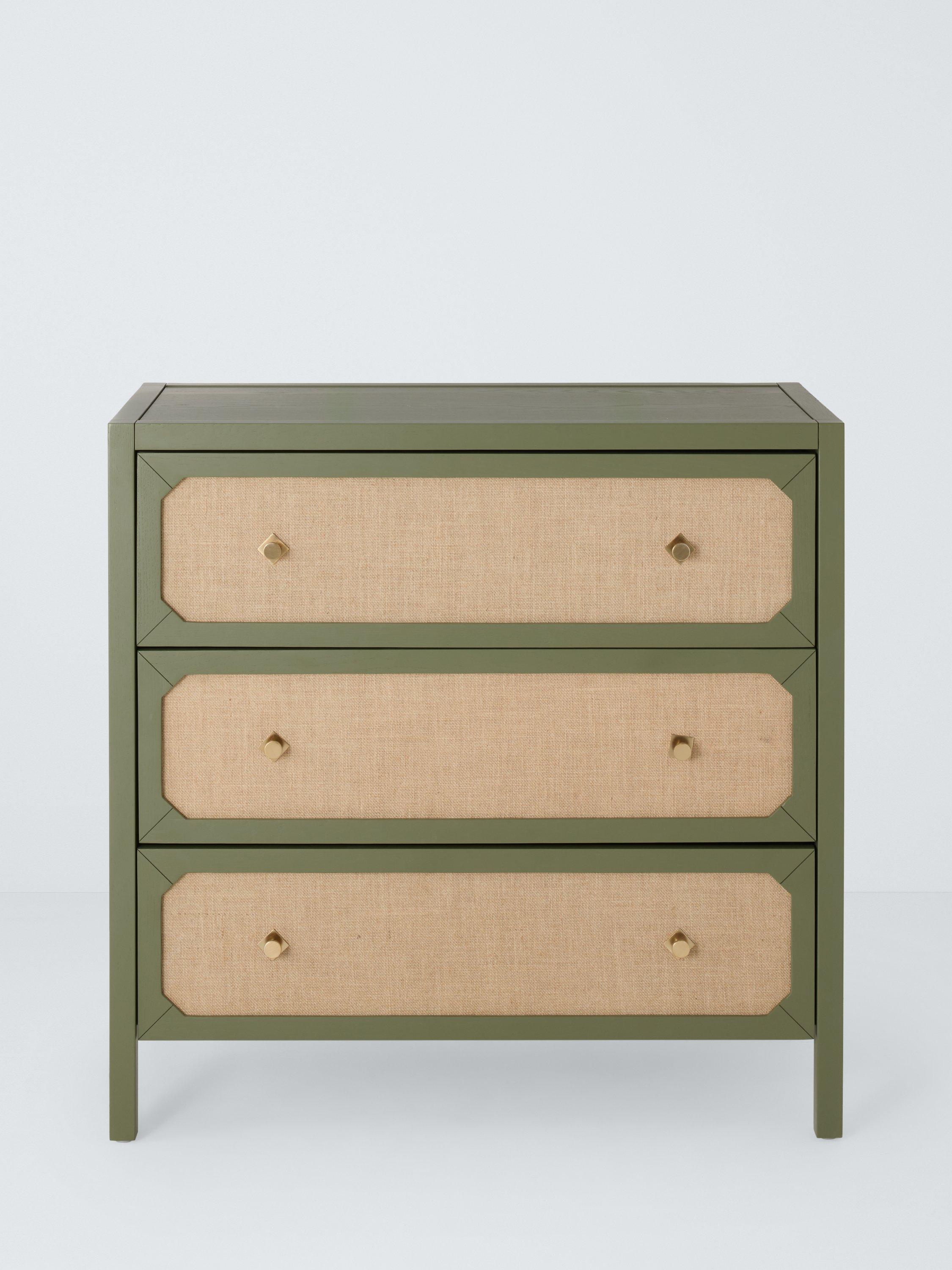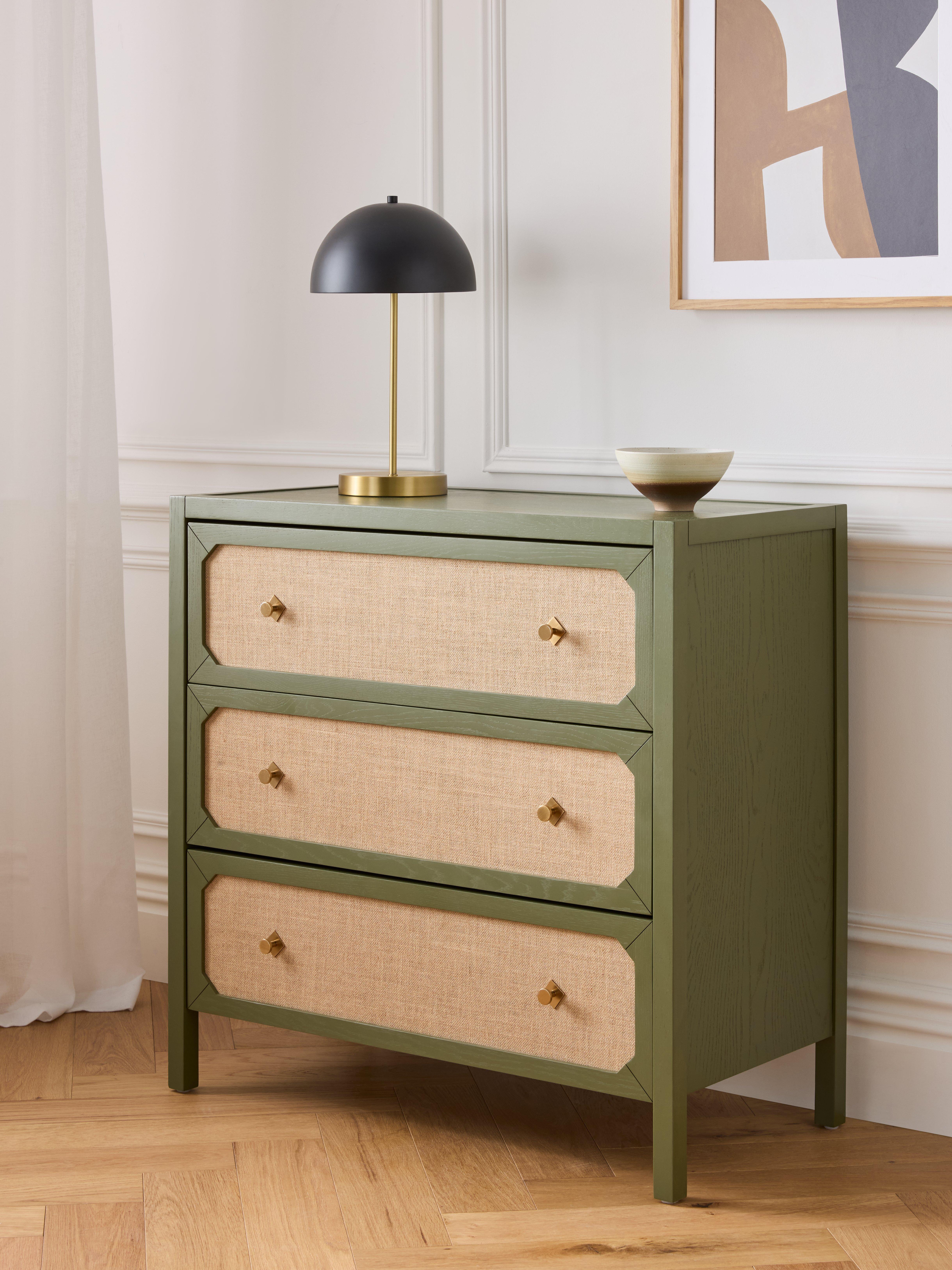 When you're looking for furniture that's more than just practical, but also adds character and charm to your space - our Hetti range meets the brief. This chest of drawers is built from a mix of hard-wearing timbers, including oak, with statement hessian-fronted drawers that add texture and warmth. There are three spacious drawers, and each is elevated with a brass handle and matching backplate. Elegant, adventurous, yet sophisticated, it will bring a distinctive style to your bedroom.