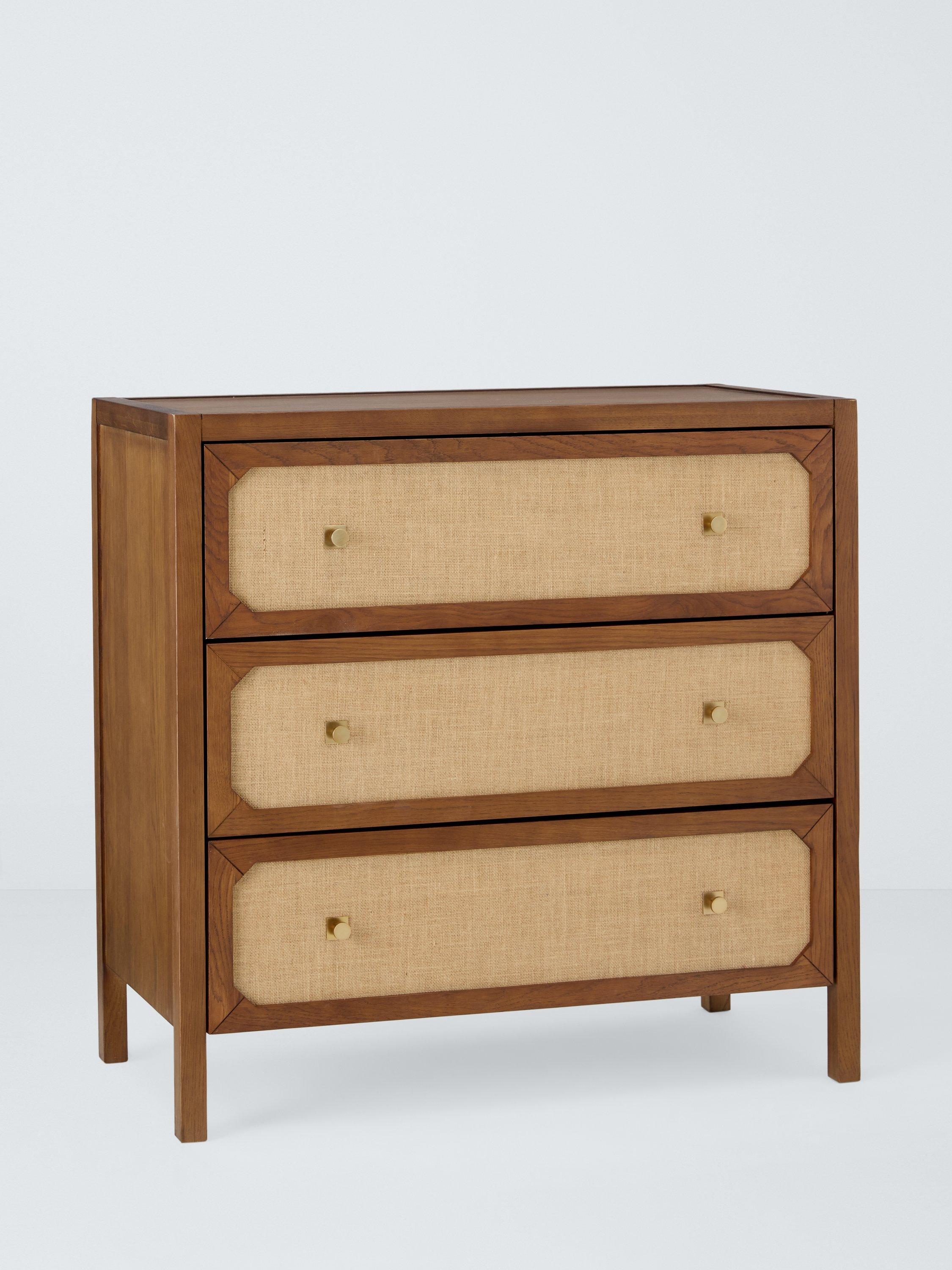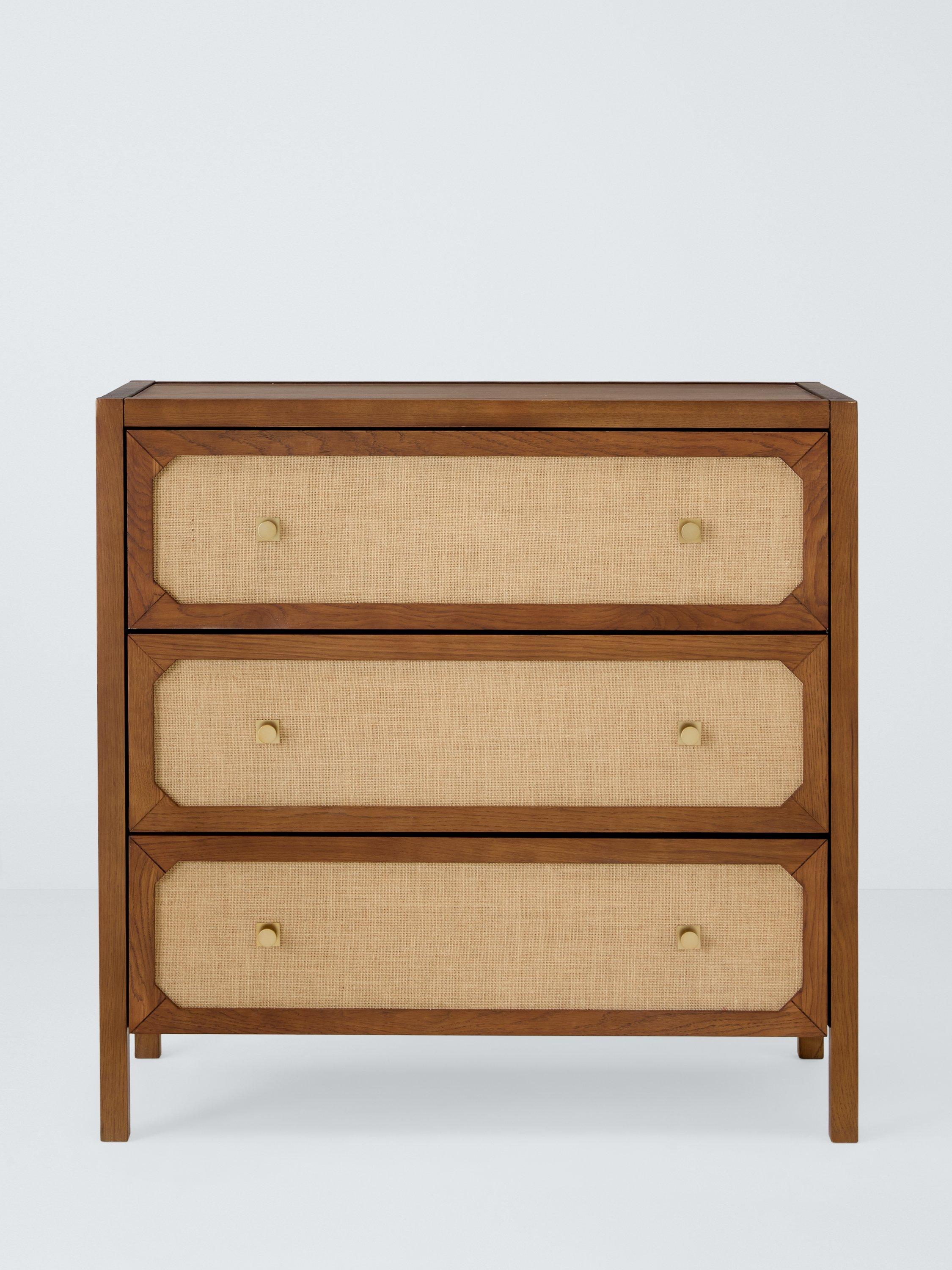 When you're looking for furniture that's more than just practical, but also adds character and charm to your space - our Hetti range meets the brief. This chest of drawers is built from a mix of hard-wearing timbers, including oak, with statement hessian-fronted drawers that add texture and warmth. There are three spacious drawers, and each is elevated with a brass handle and matching backplate. Elegant, adventurous, yet sophisticated, it will bring a distinctive style to your bedroom.