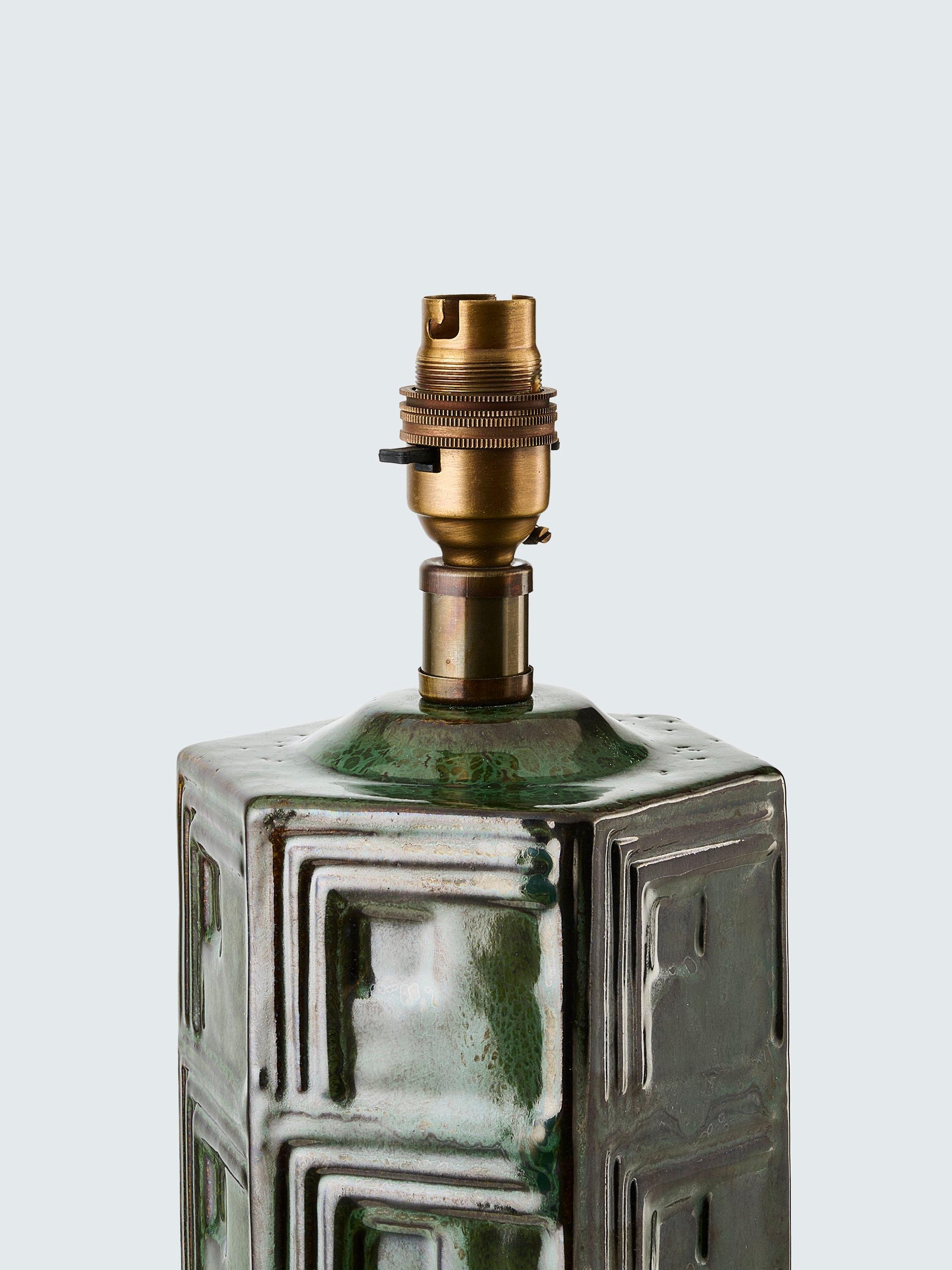 This Mid-century style ceramic table lamp base features a gorgeous green antiqued reactive glaze, which accentuates its geometric shape and patterns. Pair it with a shade of your choice for a complete look.