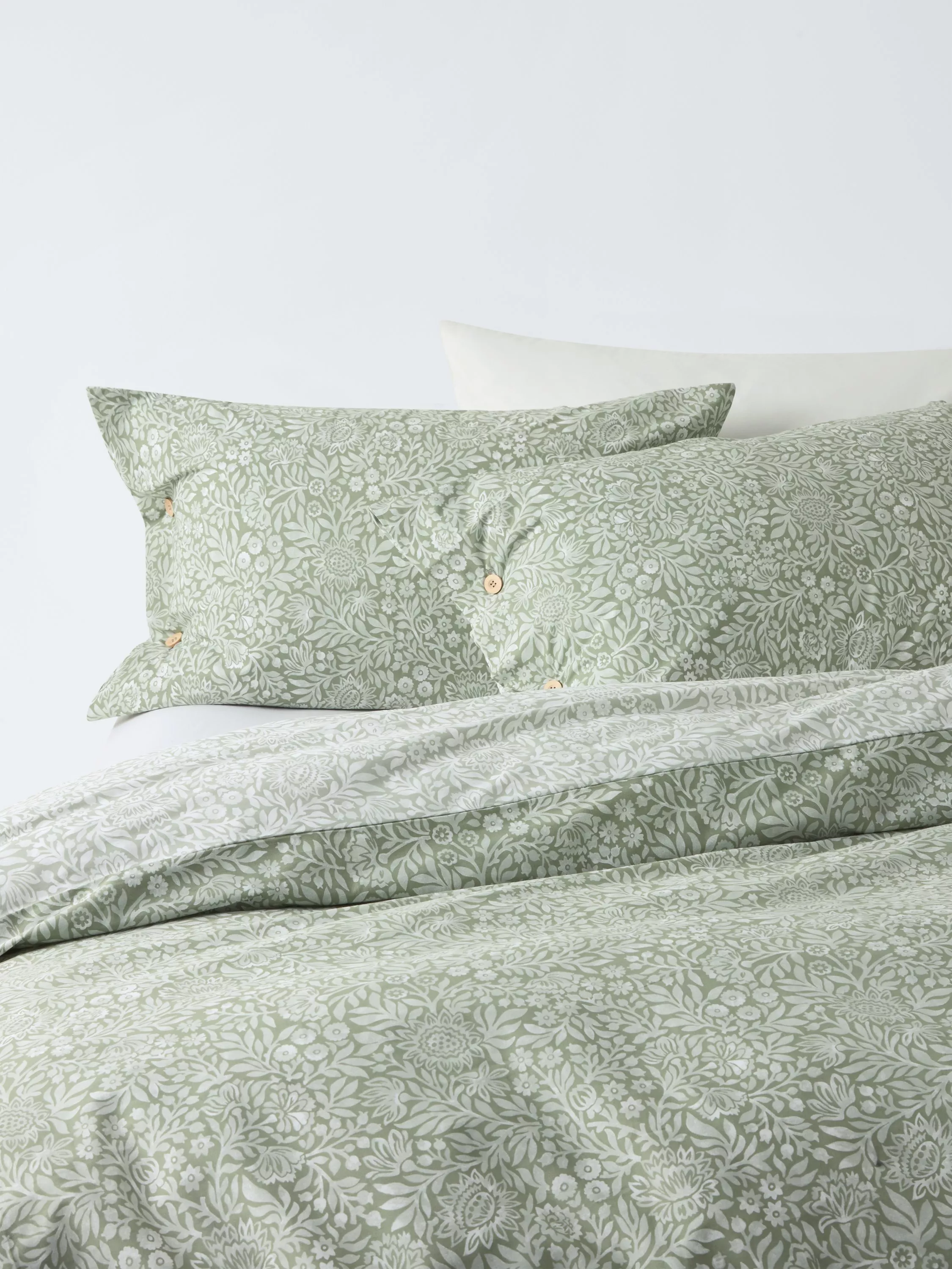 This charming floral print has a darker ground on the face and the same print in reverse colours on the back. There are wooden buttons on the pillowcases and duvet closure for additional detail.