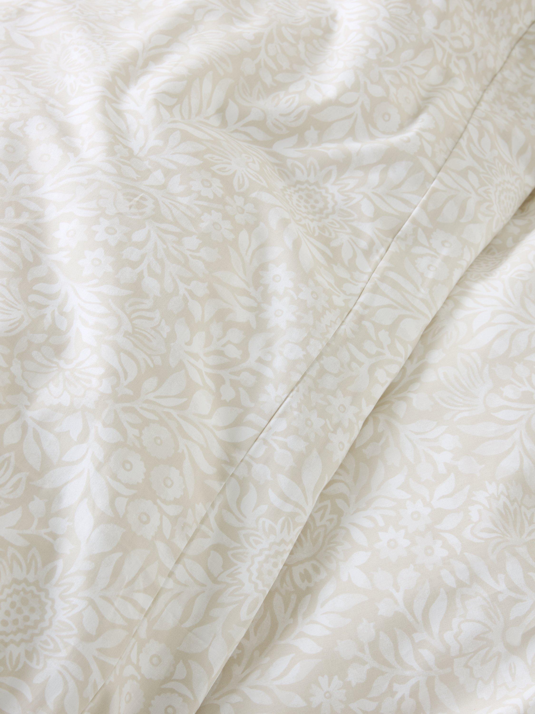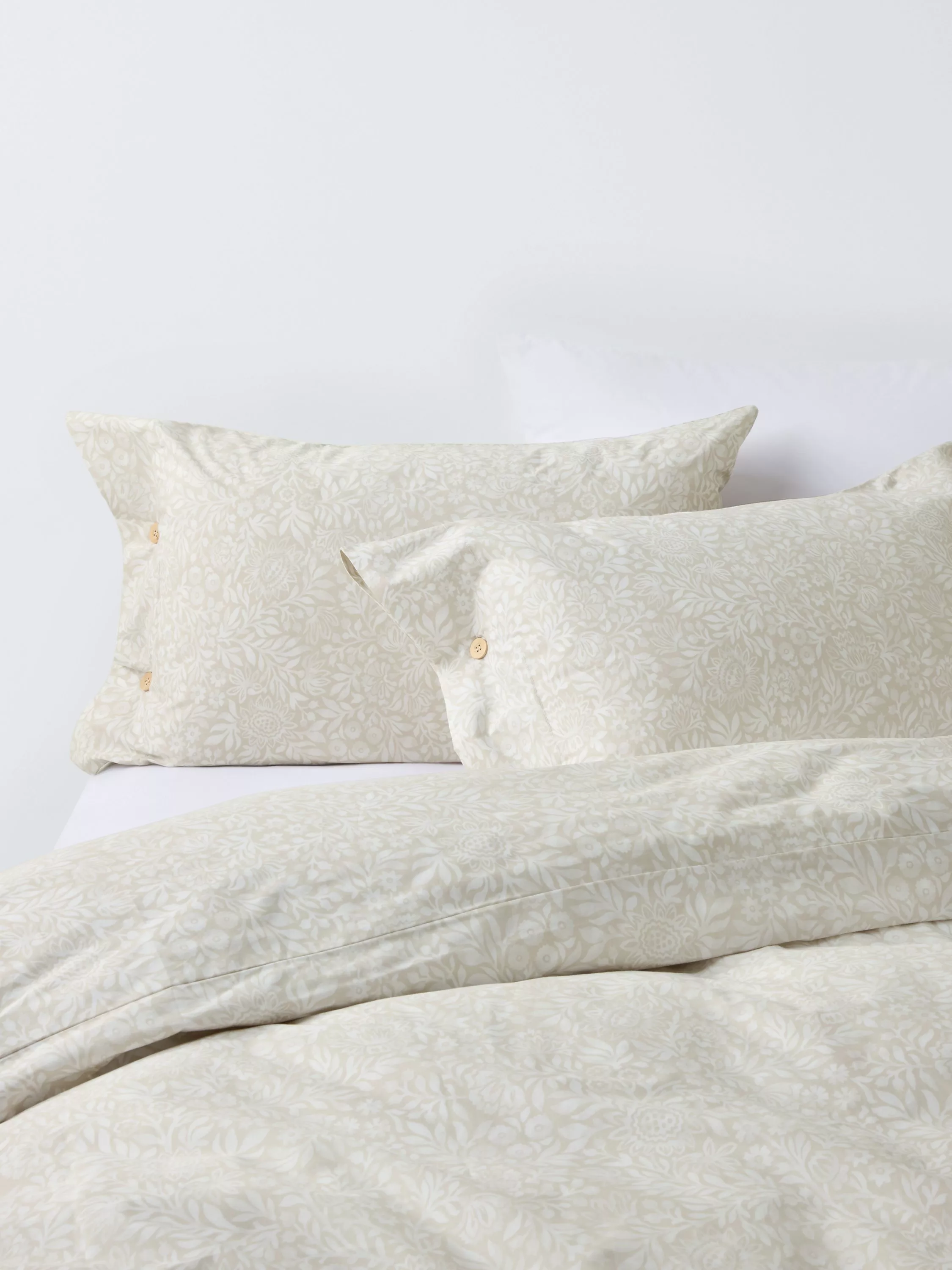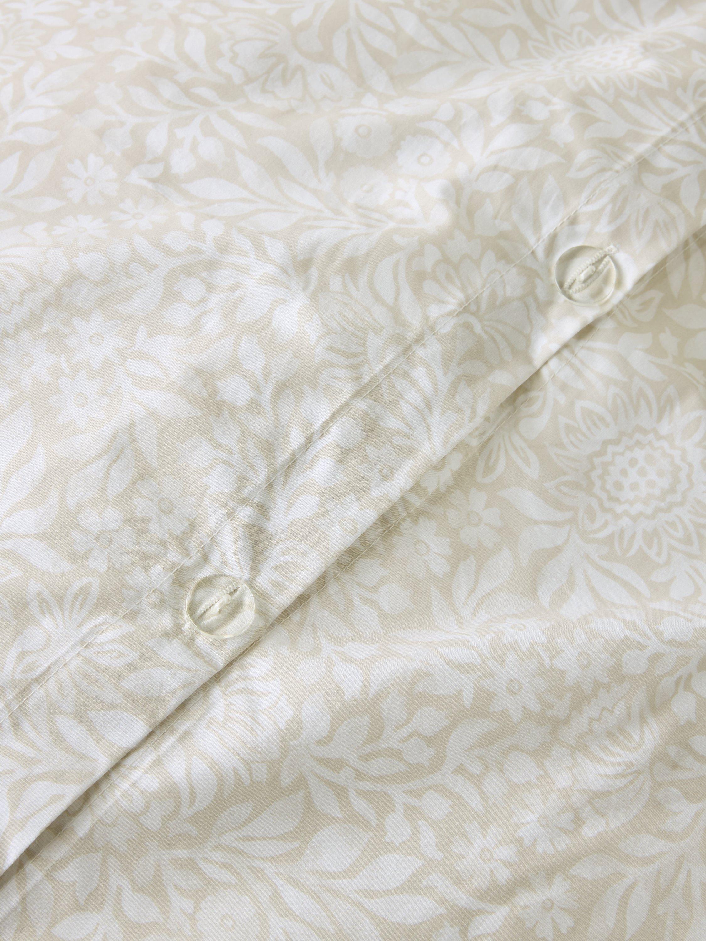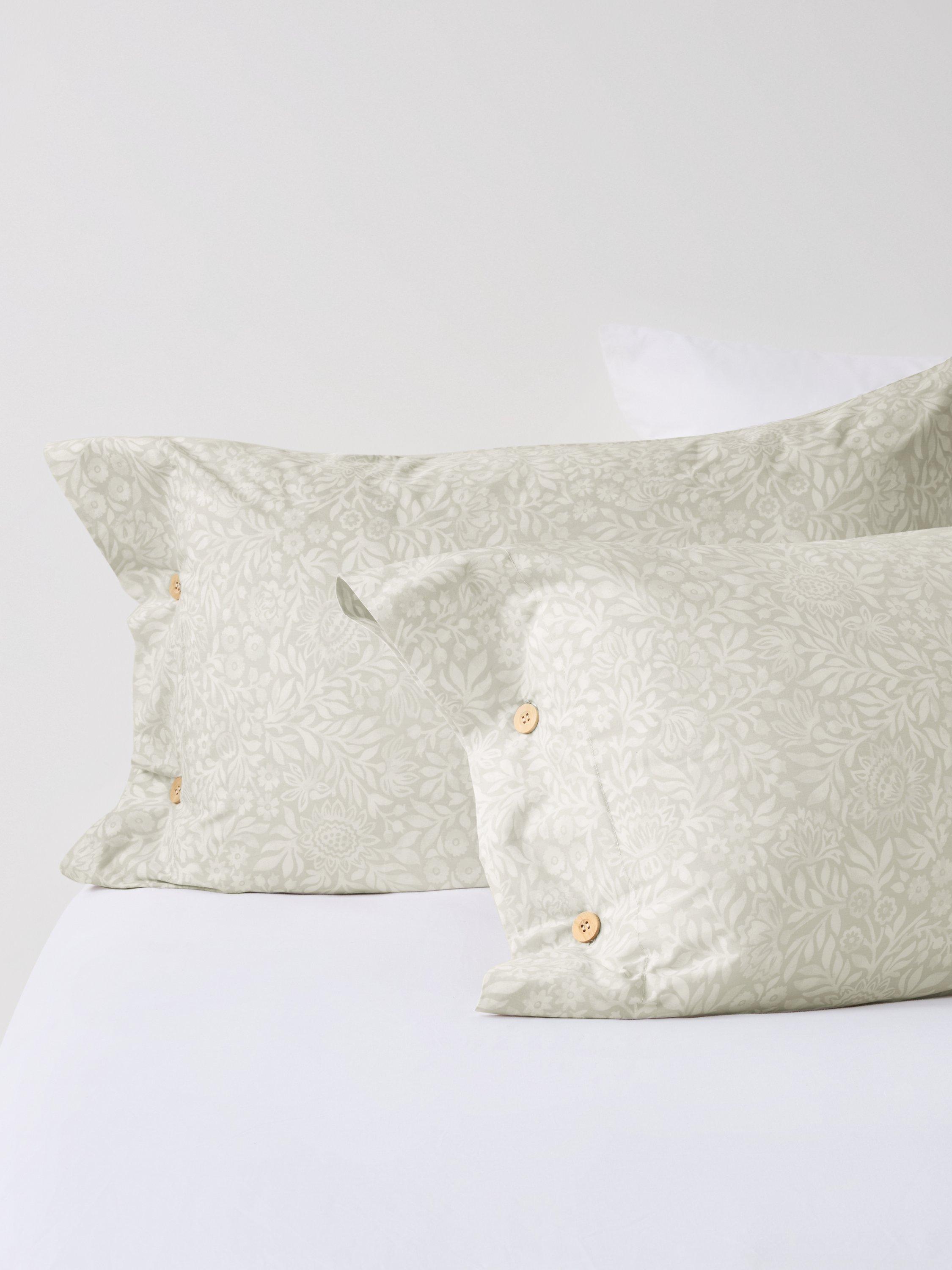 This charming floral print has a darker ground on the face and the same print in reverse colours on the back. There are wooden buttons on the pillowcases and duvet closure for additional detail.