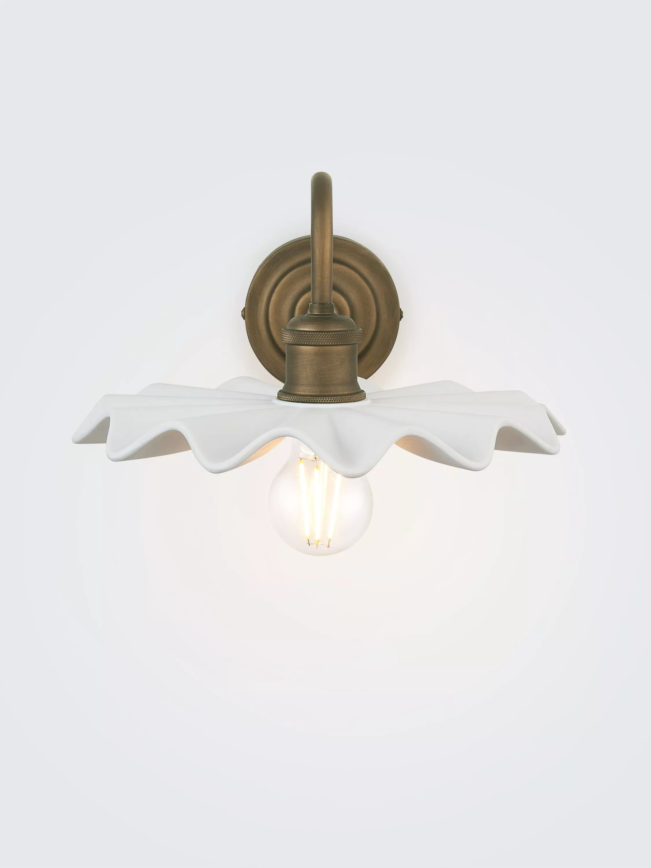 A true visual delight, the Holm wall light seamlessly blends modern elegance with timeless charm. Featuring a contemporary scalloped shade, it's crafted from matt white translucent porcelain and finished with tarnished brass plating. Holm emits a soft, ambient glow that adds warmth to any space.