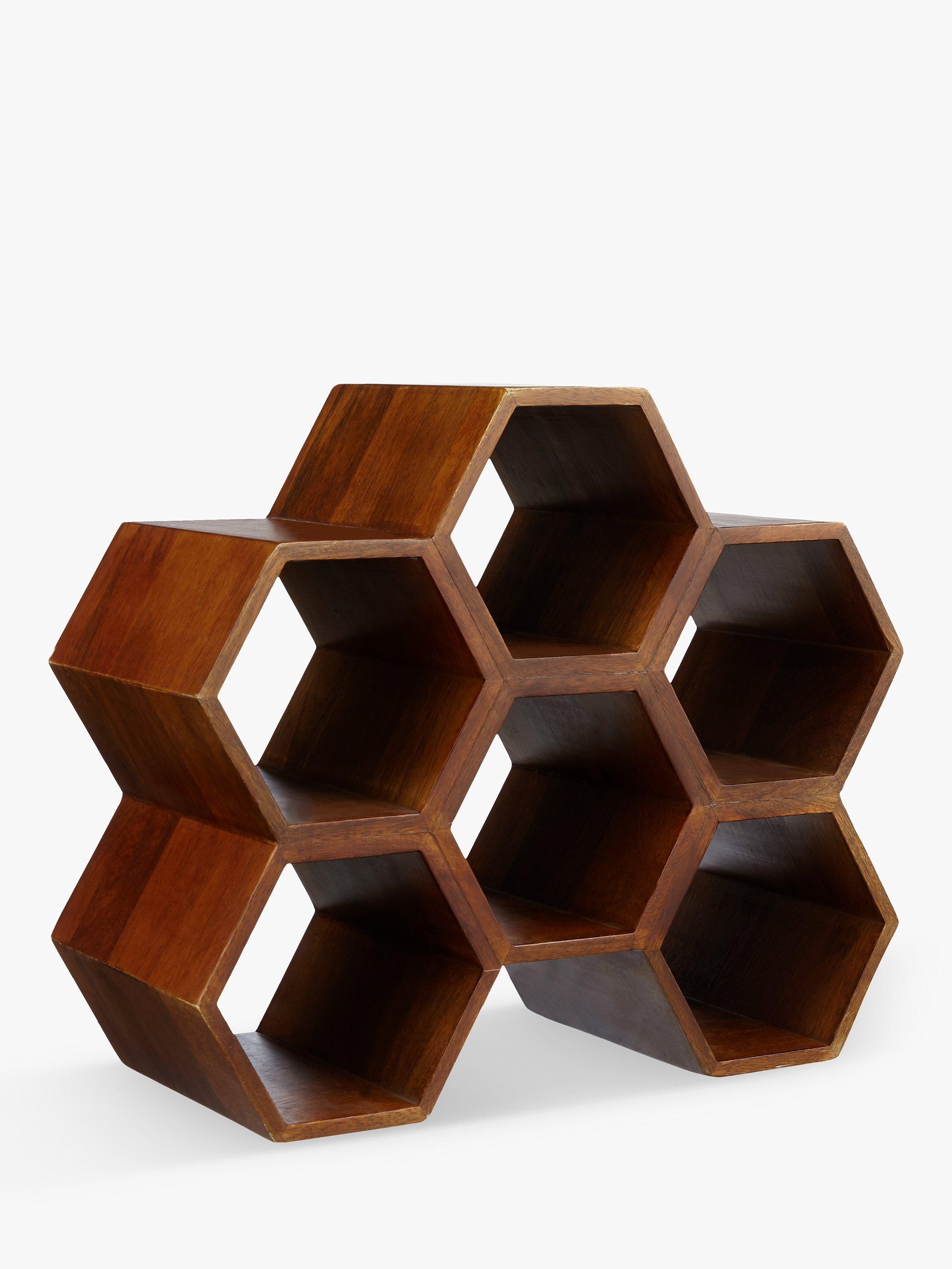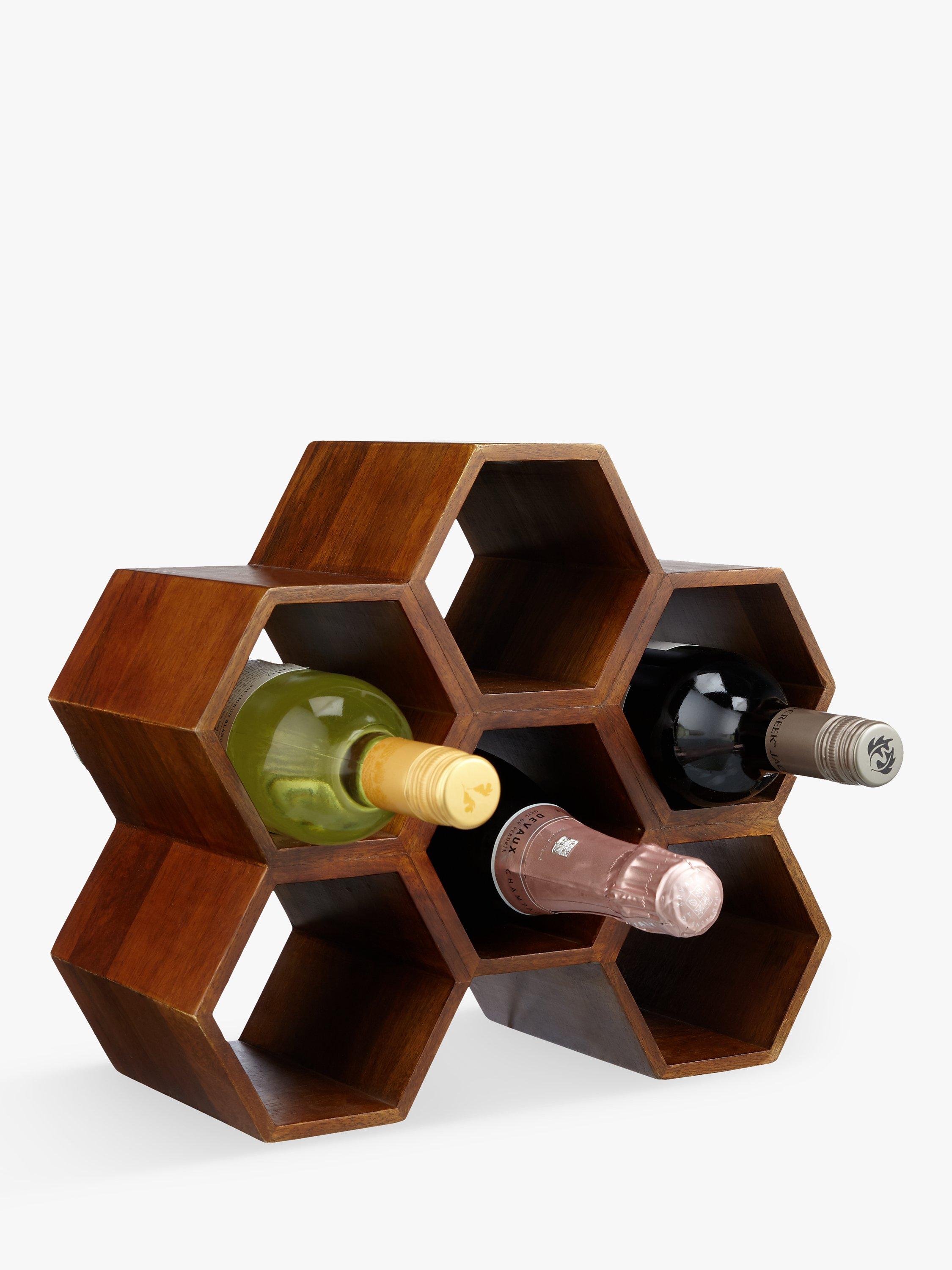 This characterful mango wood wine rack in a honeycomb shape is an eye-catching and compact solution to wine storage, holding up to six bottles. It looks great on a kitchen work surface with its stained finish that brings out the woodgrain pattern.