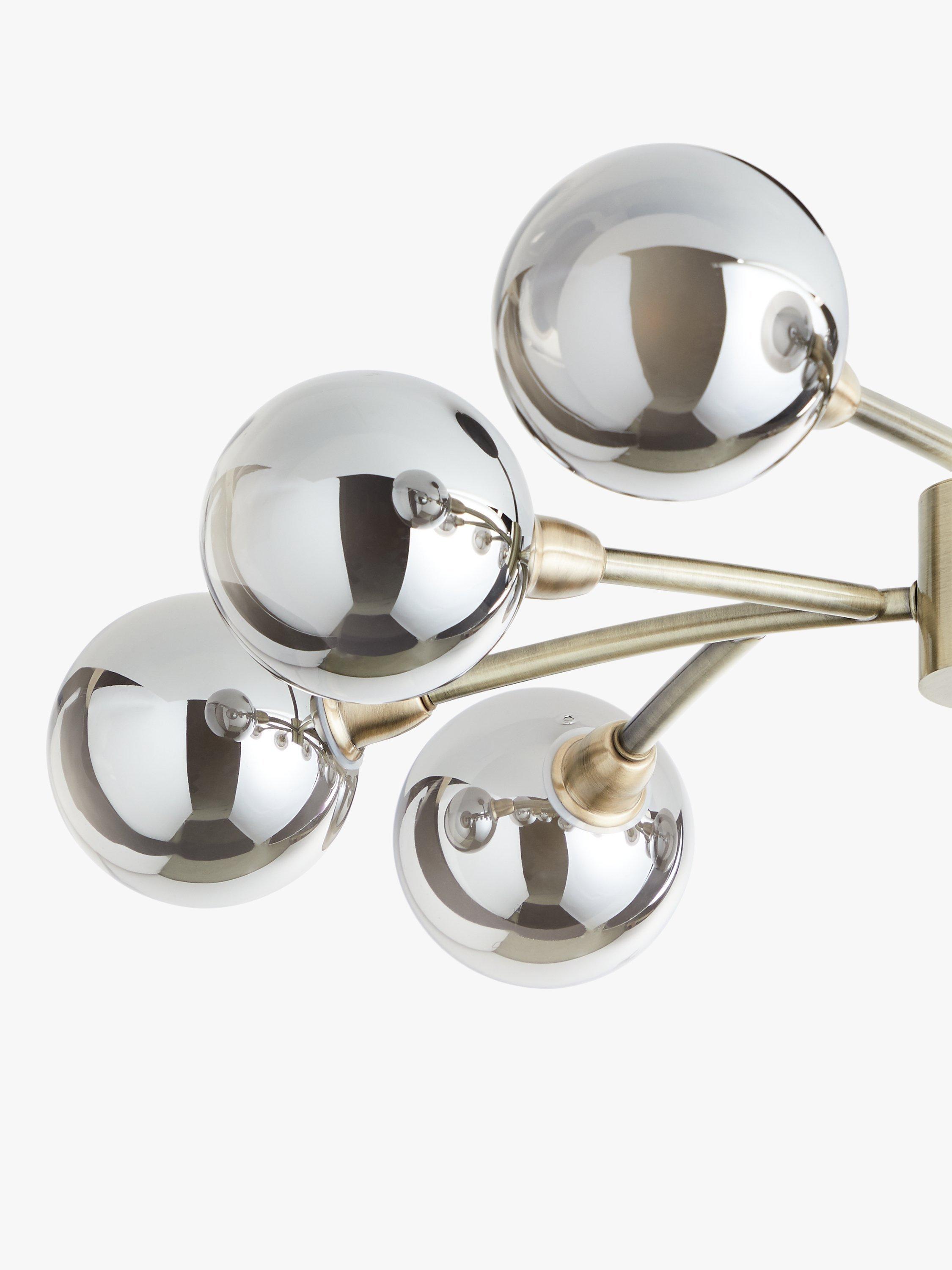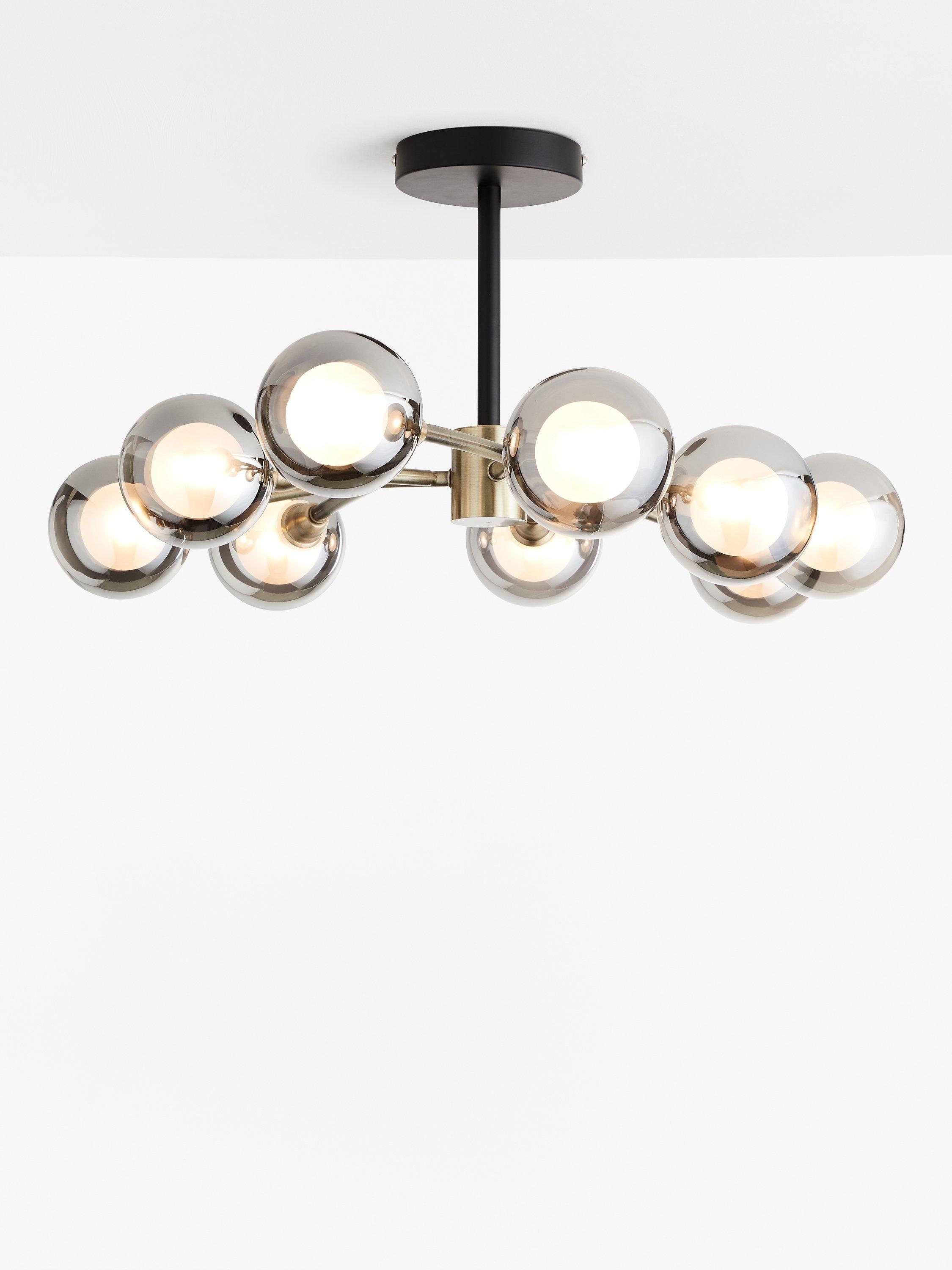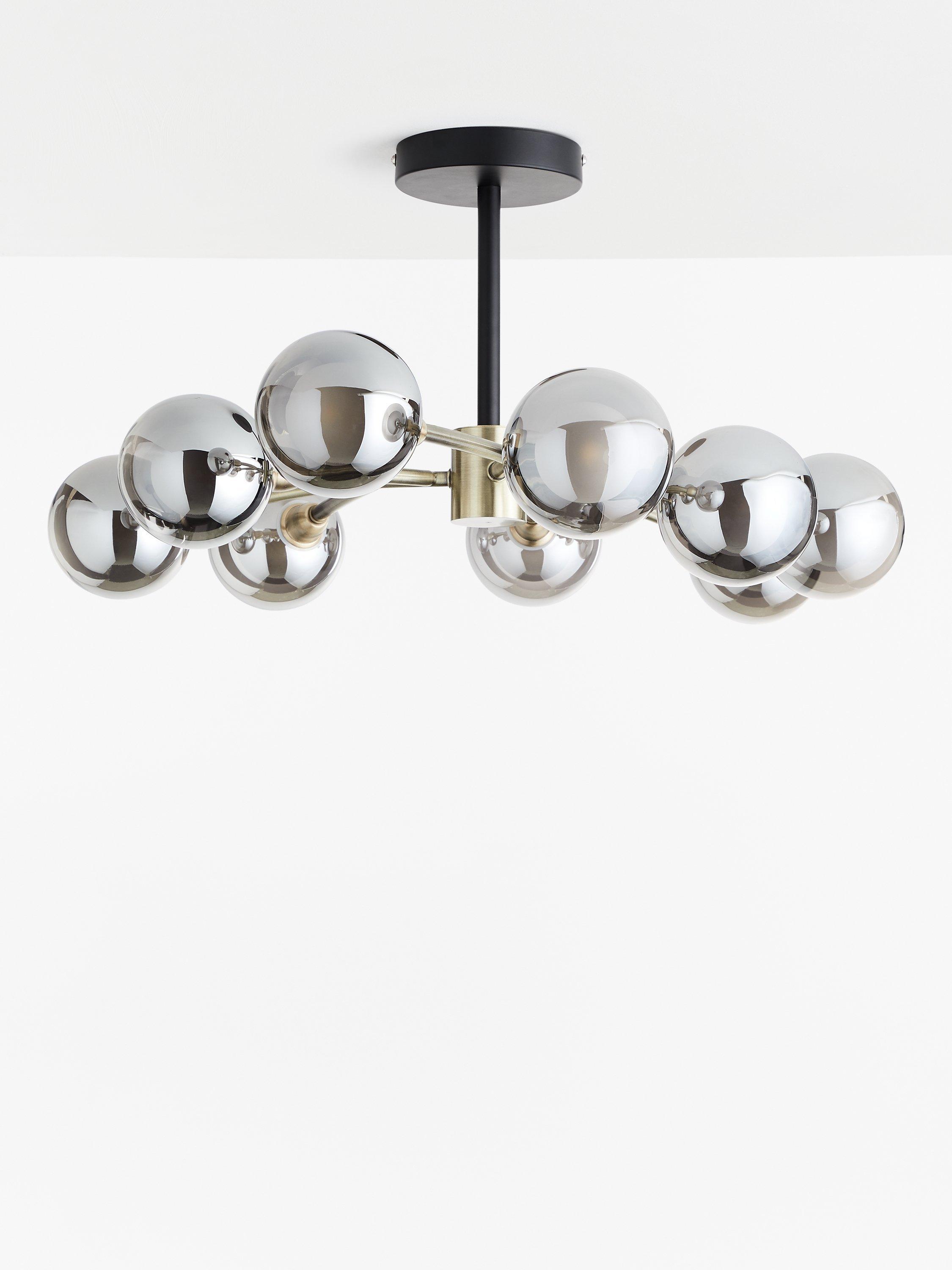 Opt for an eye-catching home lighting solution with our Huxley ceiling light. This semi-flush fitting has a multi-armed design, incorporating nine, semi-transparent smoked glass shades. When switched on, it makes a glowing orb light effect that's enhanced thanks to its metallic finish. Ideal for creating ambient light, making your space feel naturally warmer, restful and more inviting. This light is perfect for art-Deco inspired home interiors.