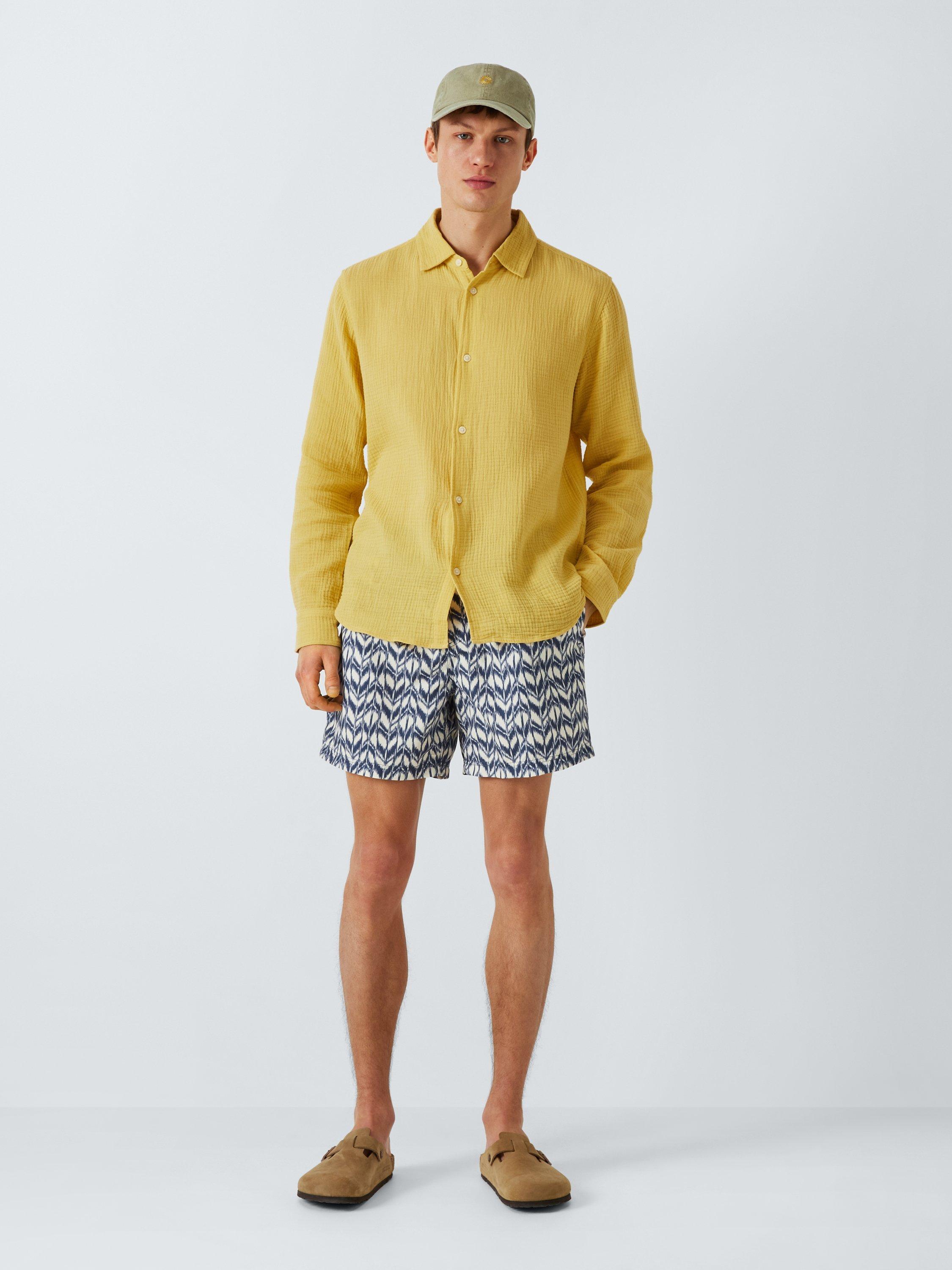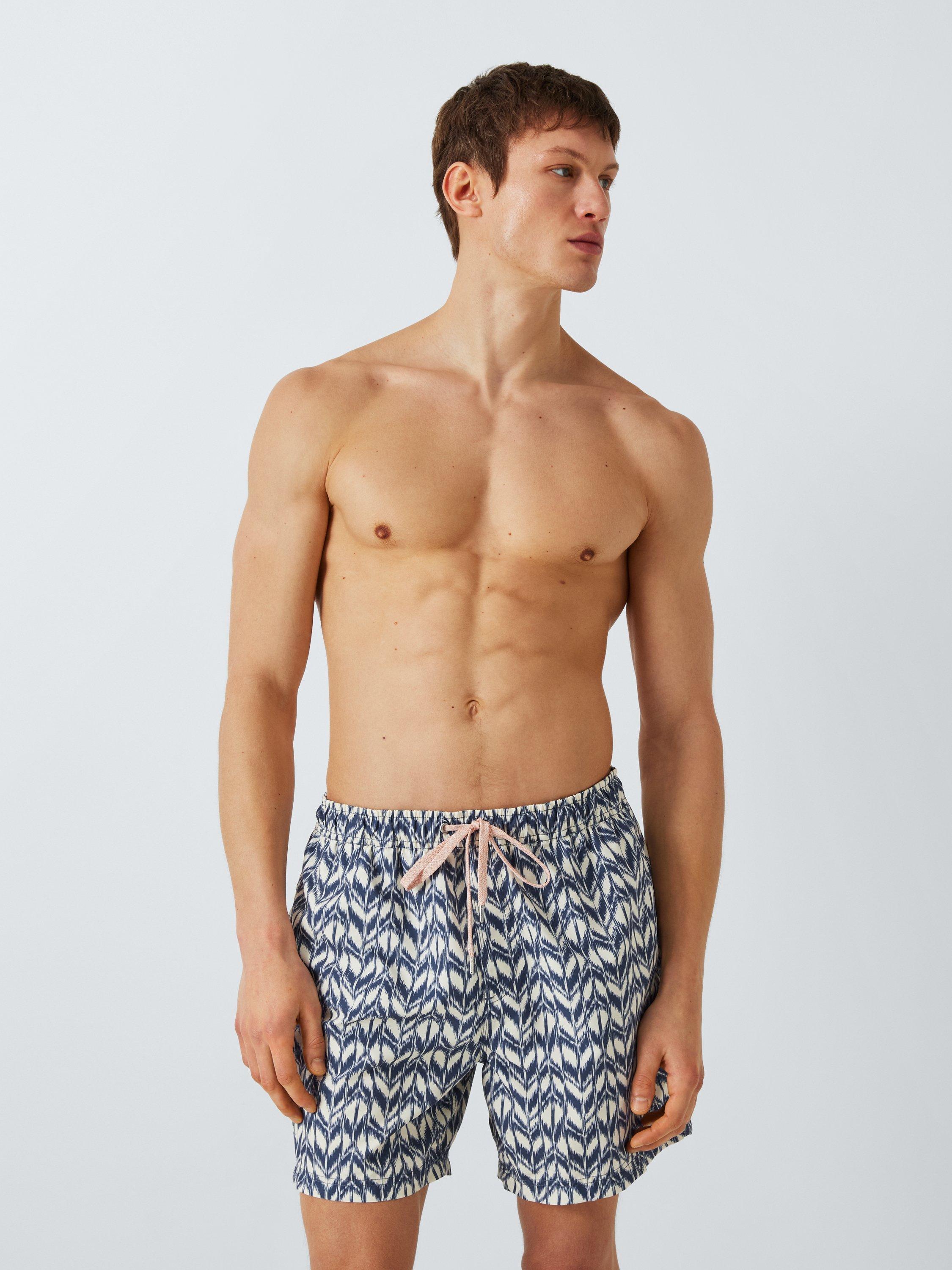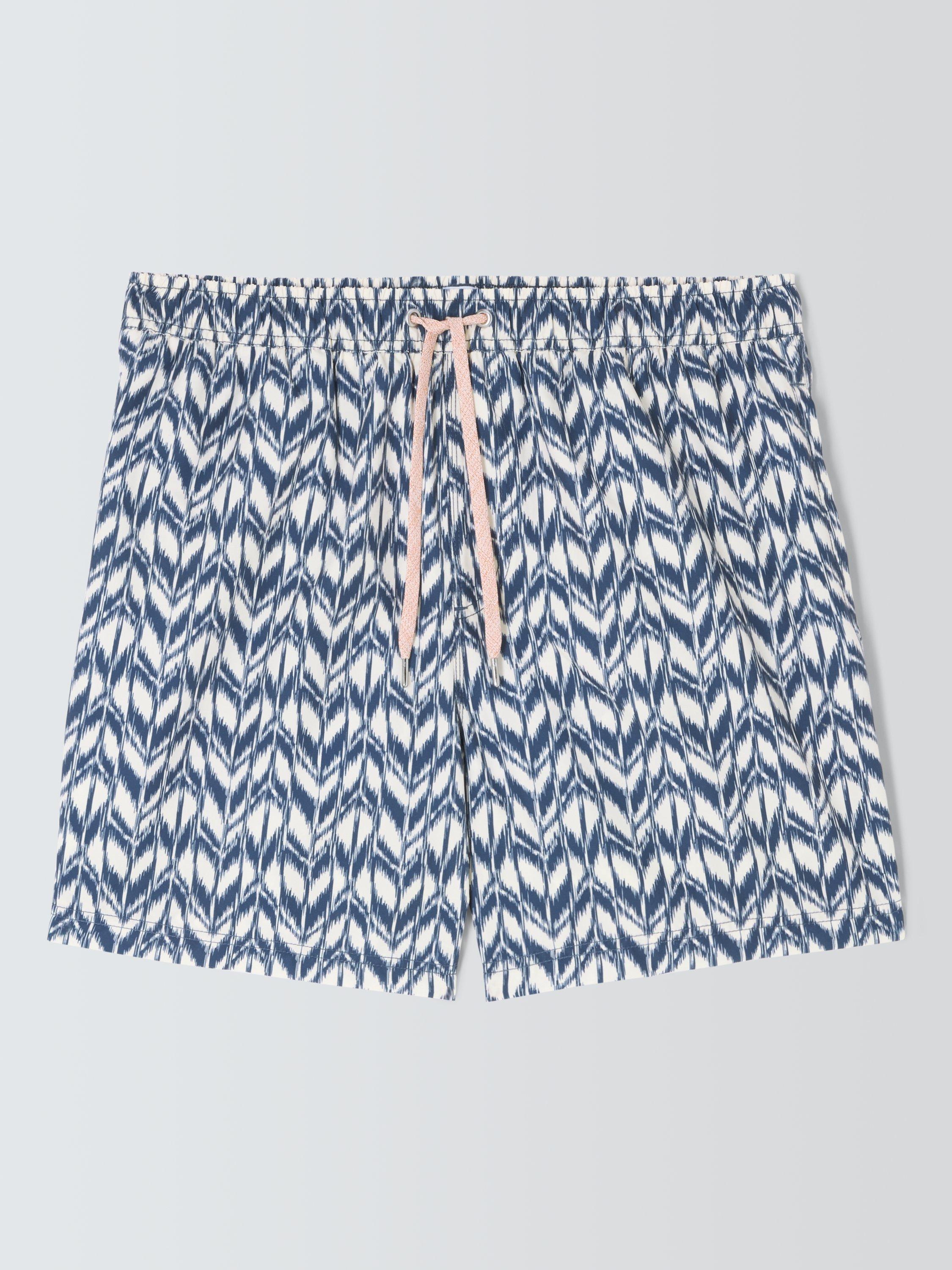 Take to the water (or just lay back on the beach of course), in our stylish swim shorts. Made from a quick-drying recycled fabric, they carry a stylish Ikat-style print, have a drawstring waist, and are finished with handy side pockets.