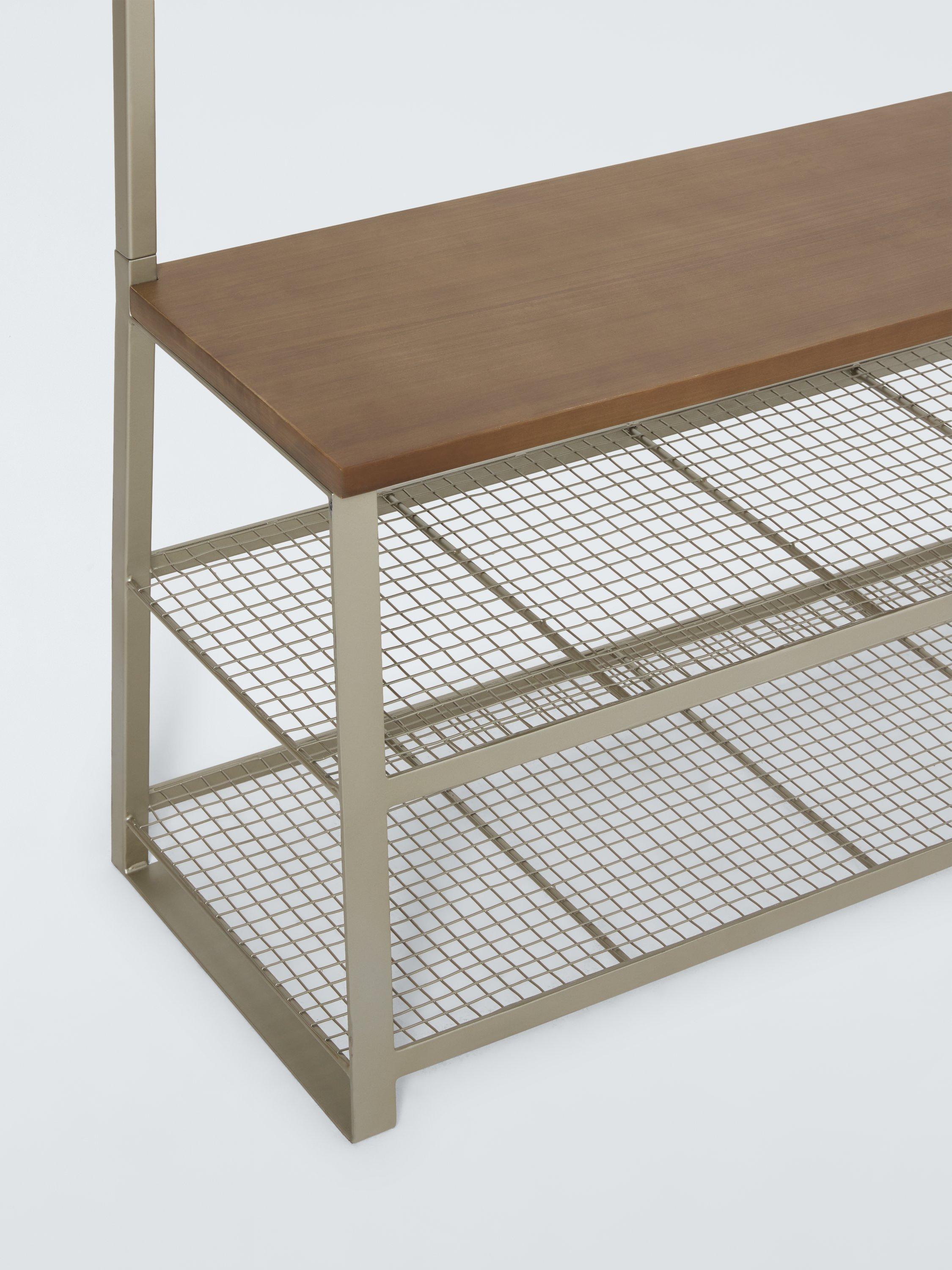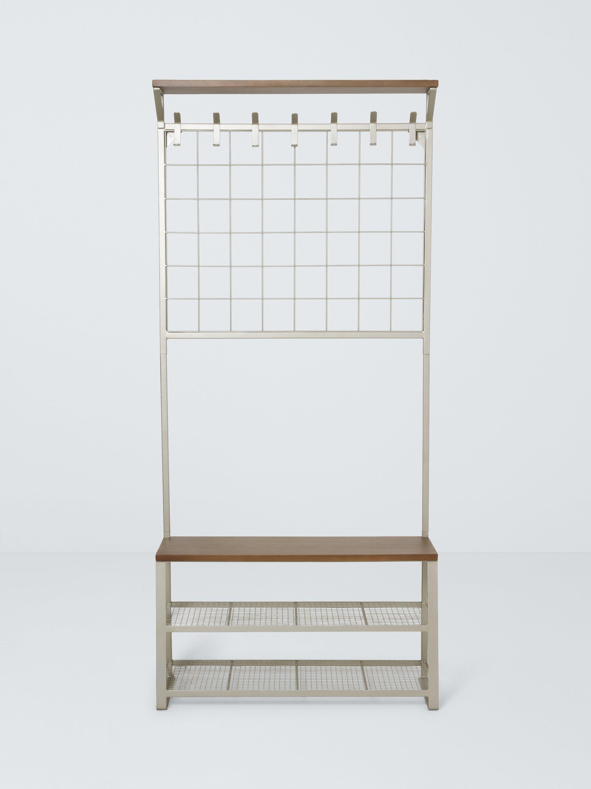 This industrial-style metal hallway unit gives you plenty of options for storage with 7 double coat hooks, two tiers for shoe storage and a bench seat. The open gridded back can also be used for hanging items such as umbrellas.
