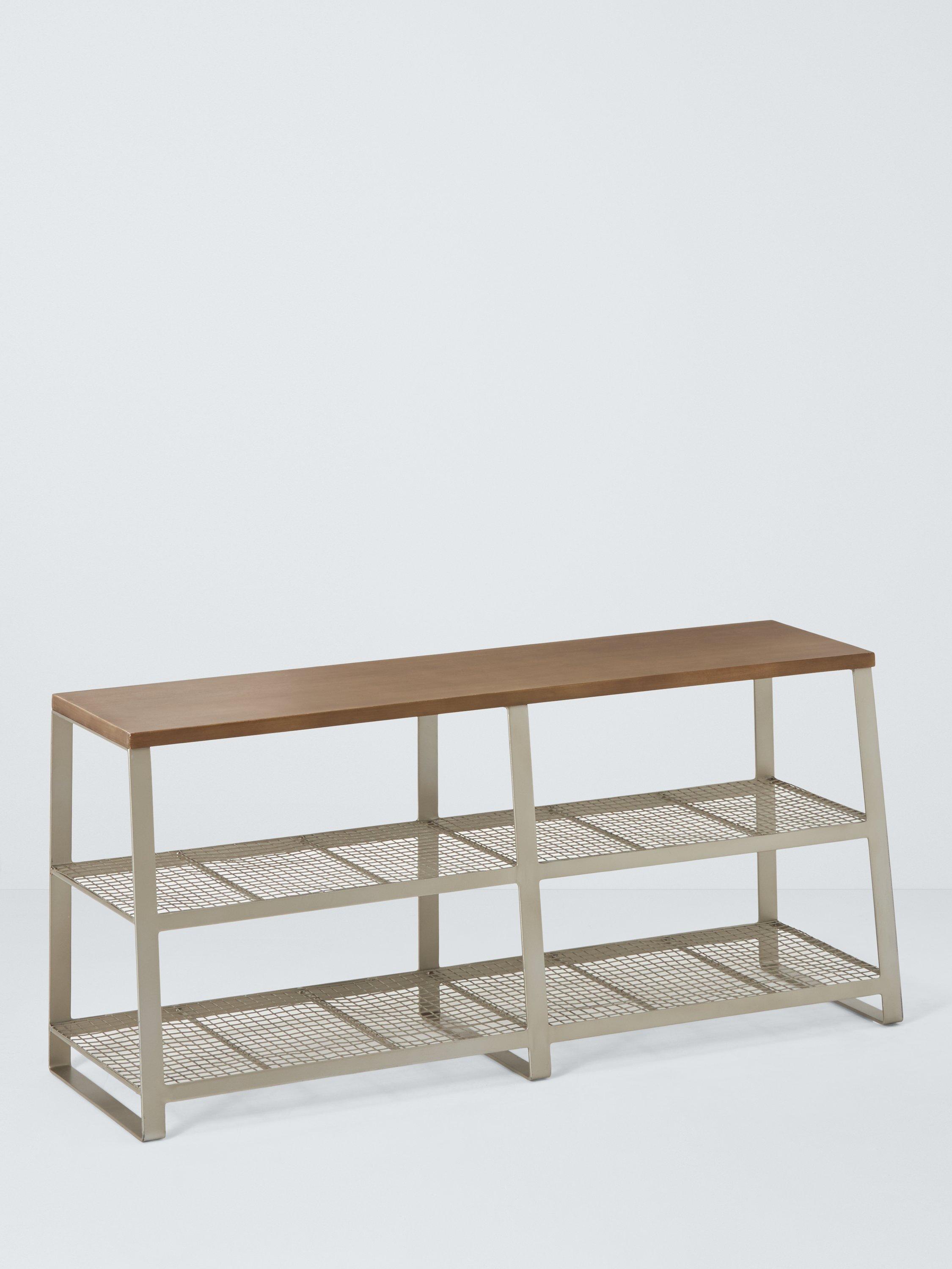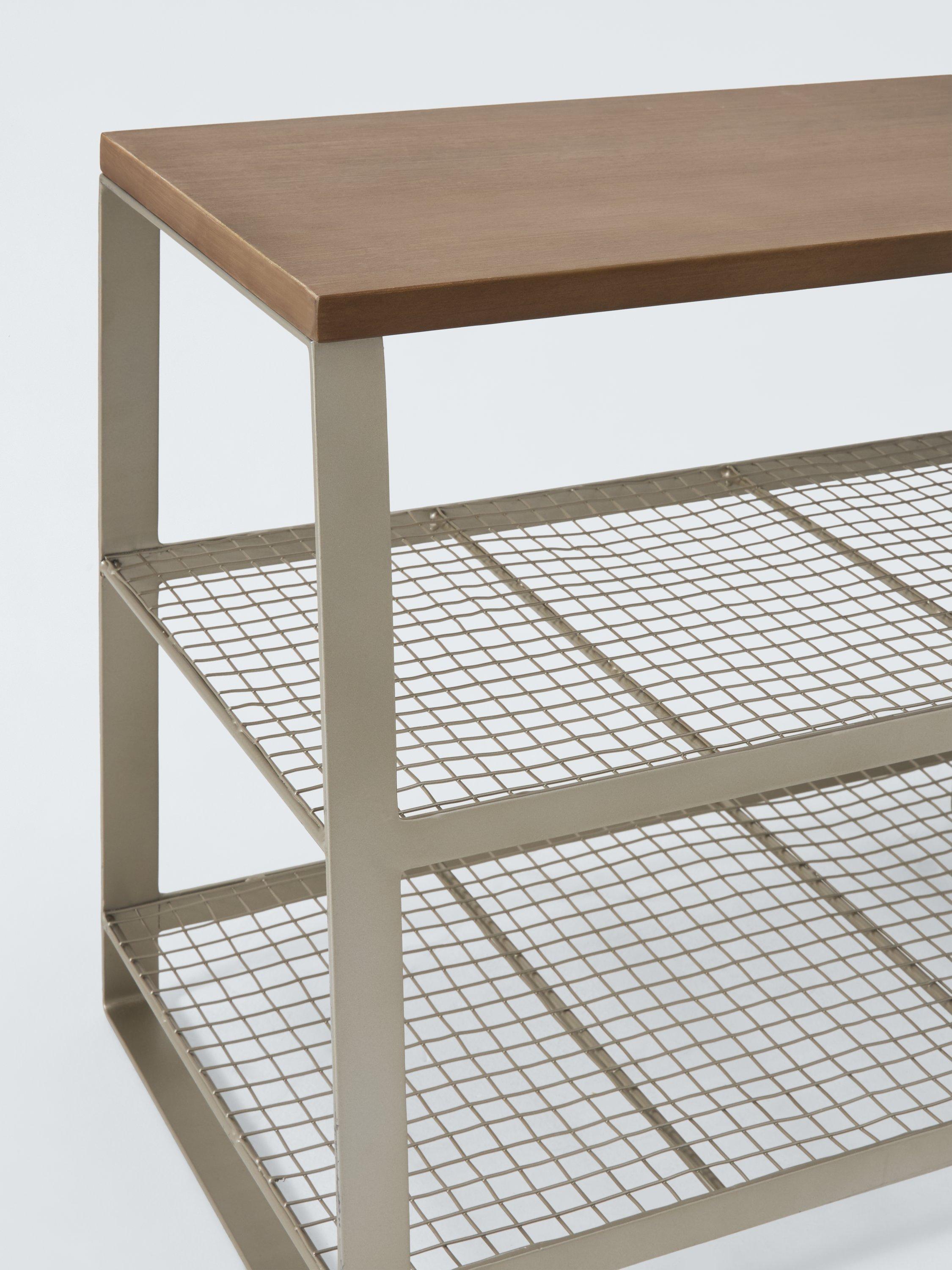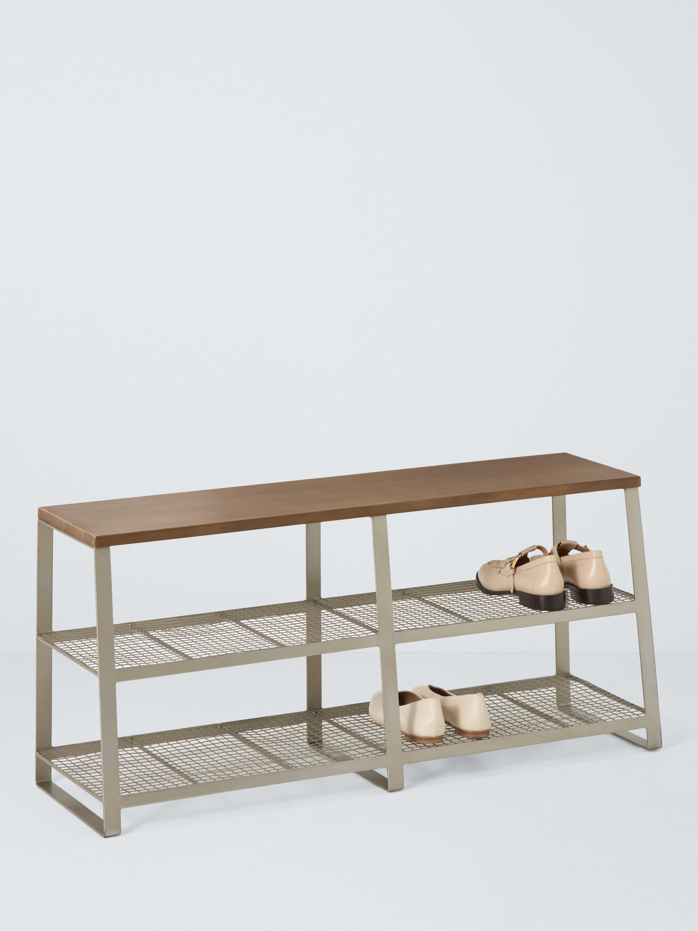 Handmade, with a weathered grey mango wood top and powder coated, angled metal frame, this industrial-style shoe bench holds up to 6 pairs.