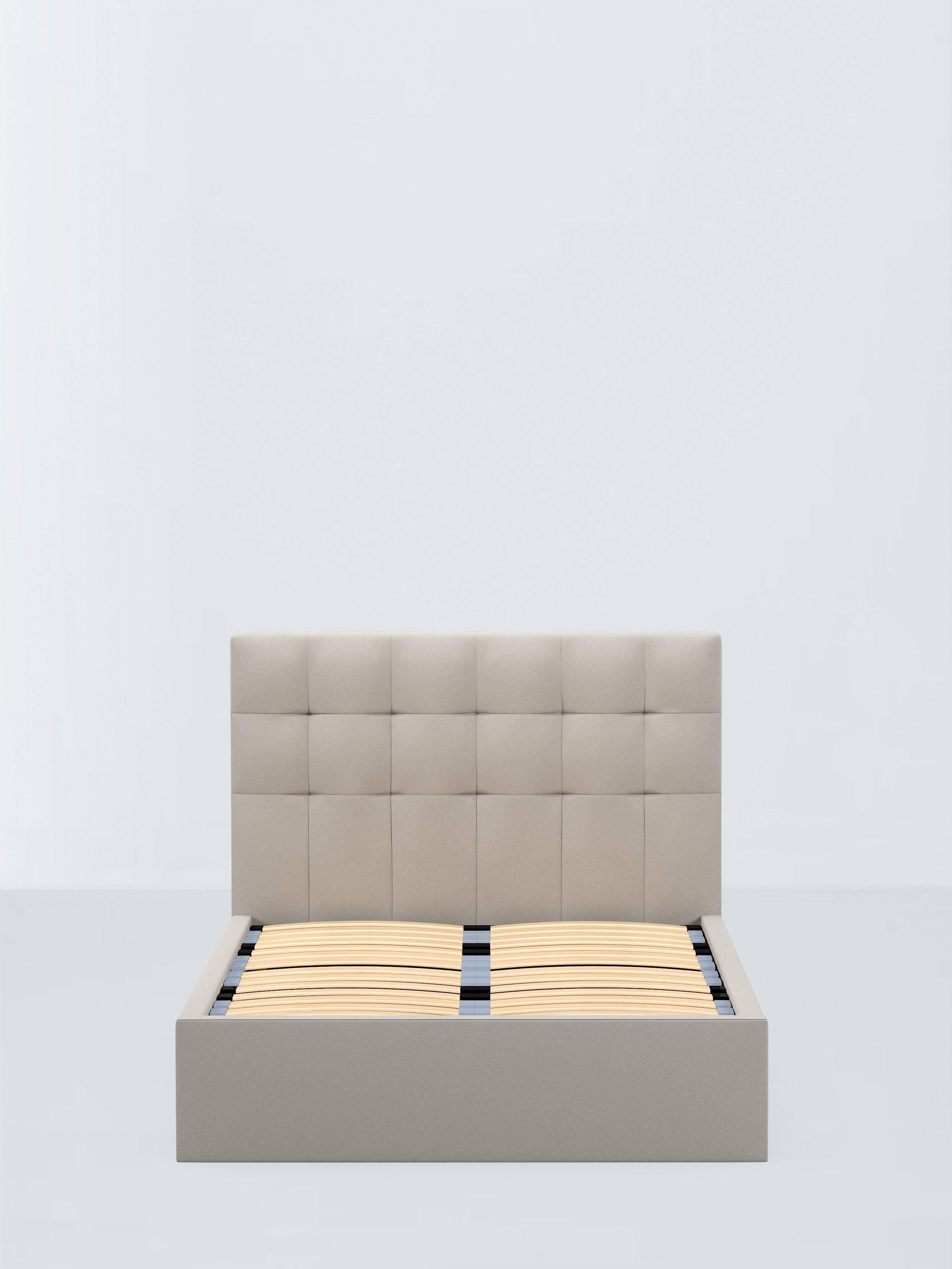 Our Ingrid ottoman bed frame is designed to free-up your floor space and bring a clever storage option into your bedroom. We've kept the design simple and practical, fusing clean lines with soft edges. Easy to assemble and made from high-quality timbers, it boasts a contemporary style which incorporates a large well-padded, grid-design headboard, an effect created by clever stitching. This bed frame is designed with wider slats at the shoulders, lumbar and feet providing maximum support for you and your mattress so that you experience perfect spinal alignment while you sleep. The standard slat caps are black so we have added grey slat caps to ensure that you know where to place the wider slats.