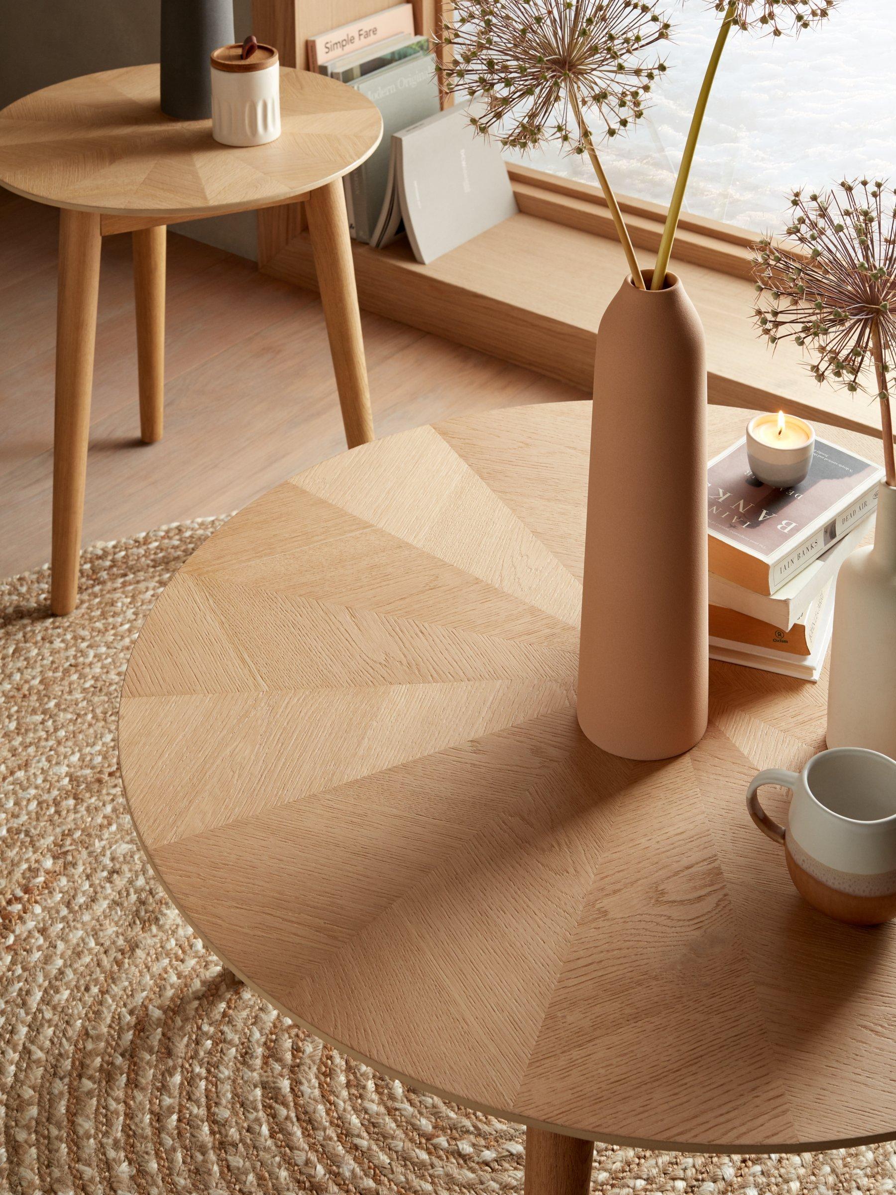 Made from European oak and rustic oak structured veneers, our Iona range of furniture highlights the beauty of natural materials. With grains and knots in the wood highlighted through a delicate inlaid chevron pattern, each piece is finished in a specialist matt lacquer and brushed out to keep the grain looking natural and dry.