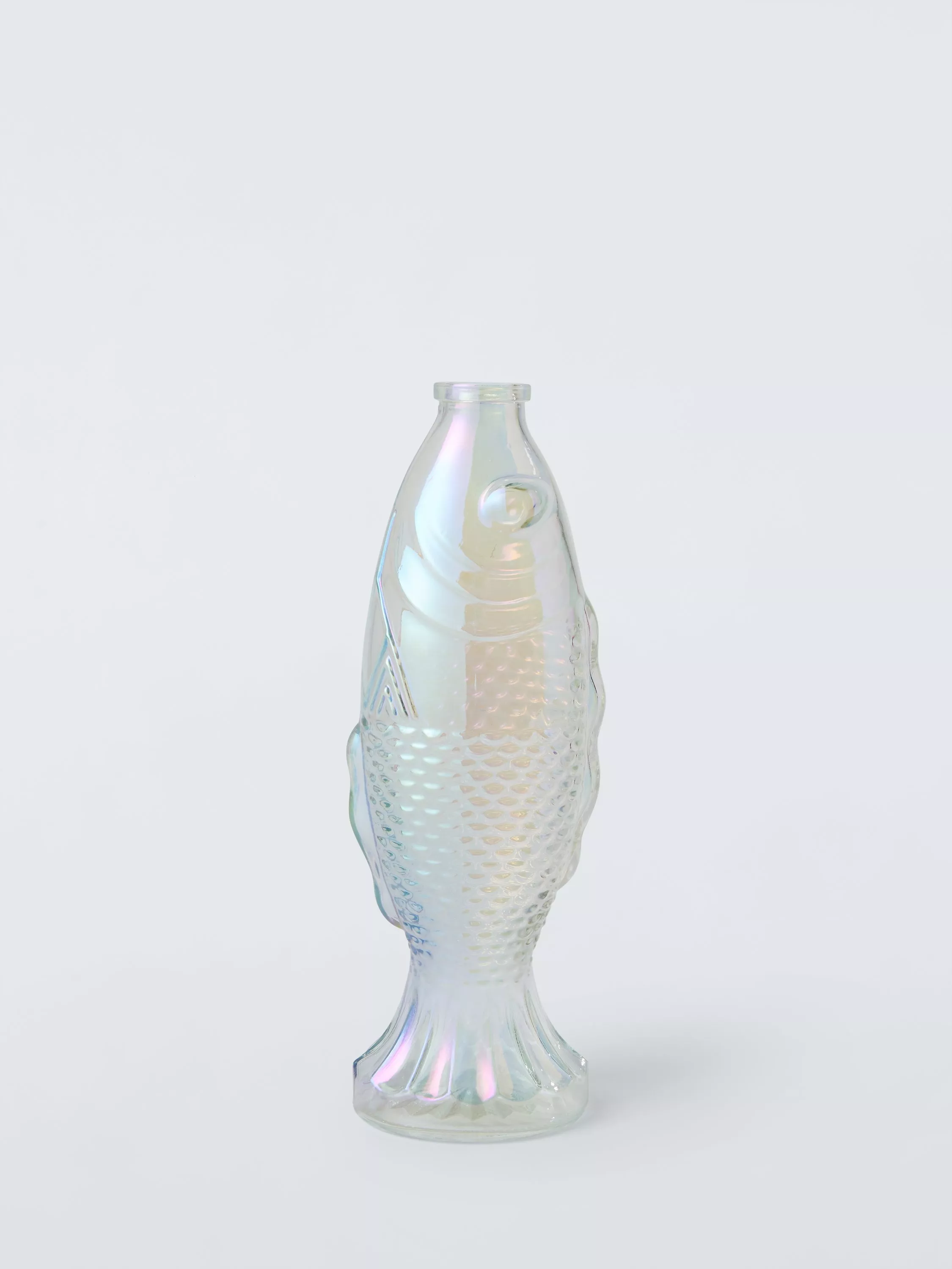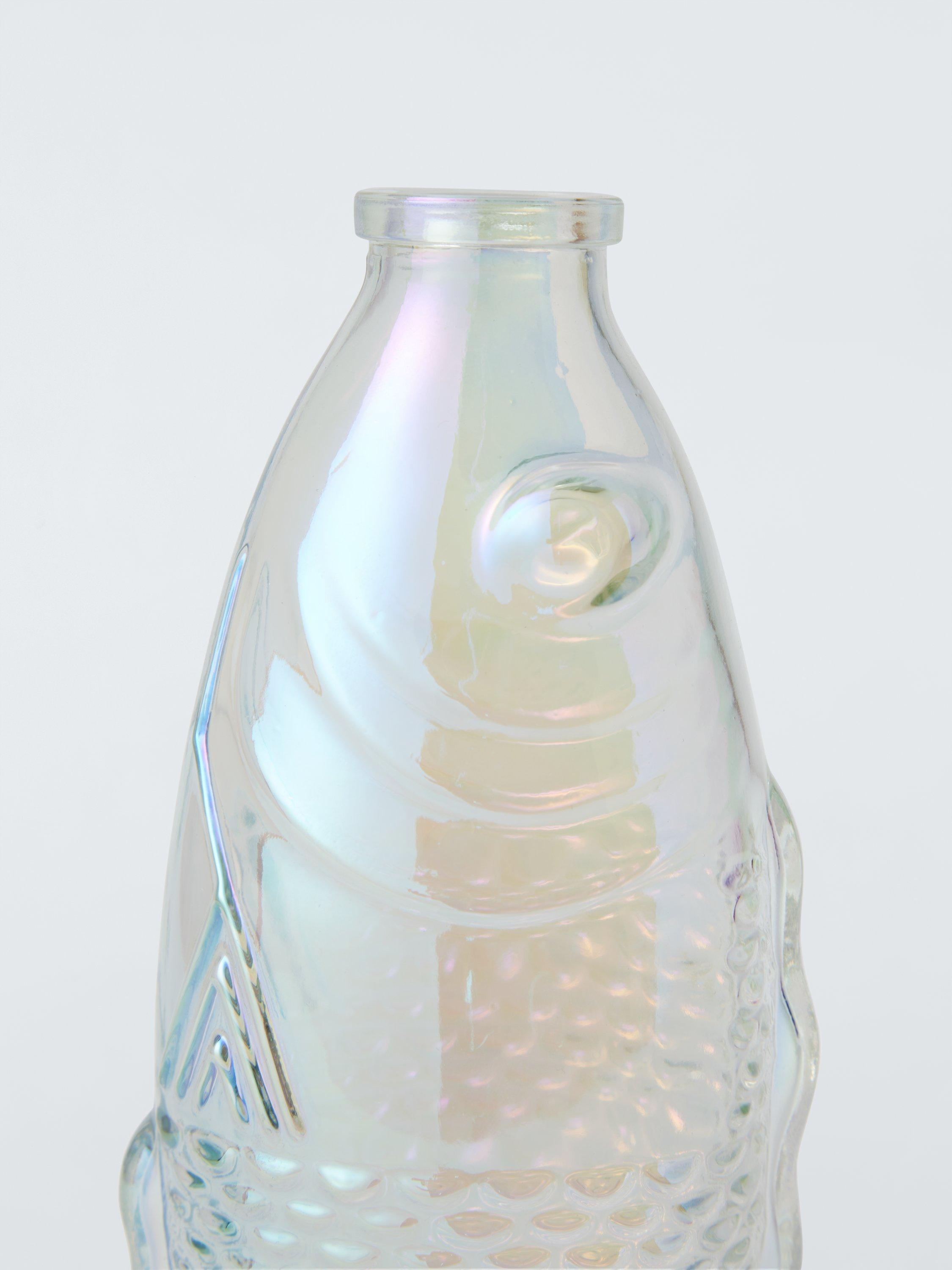 Fish-shaped glass jug with textured detail and an iridescent sheen.