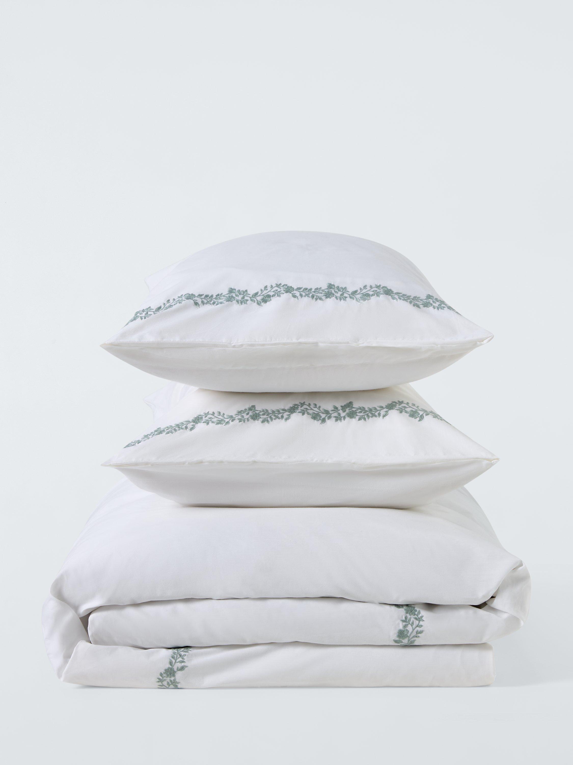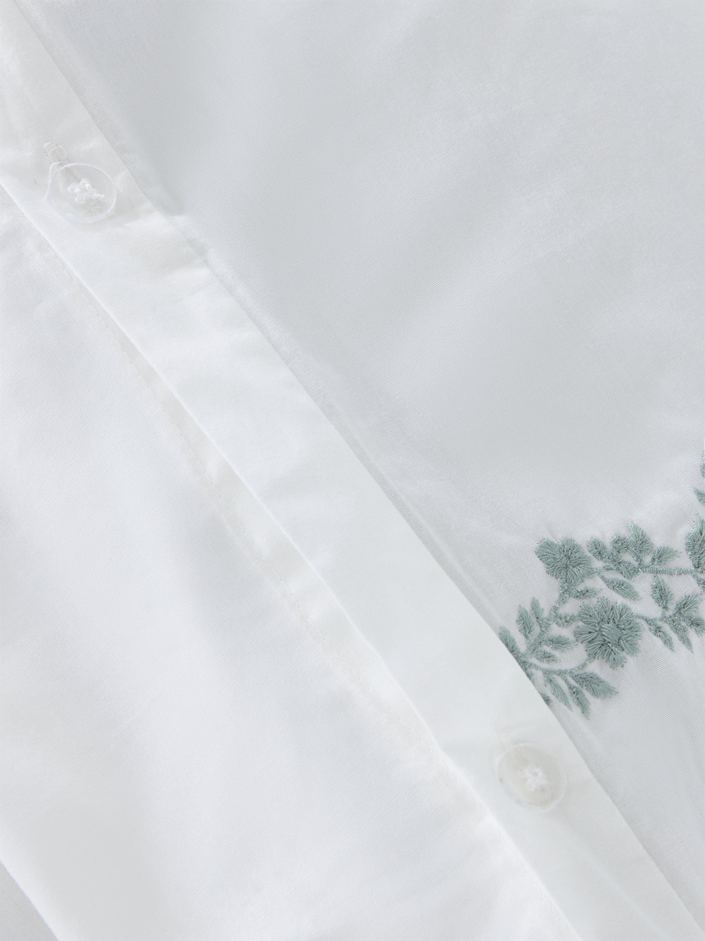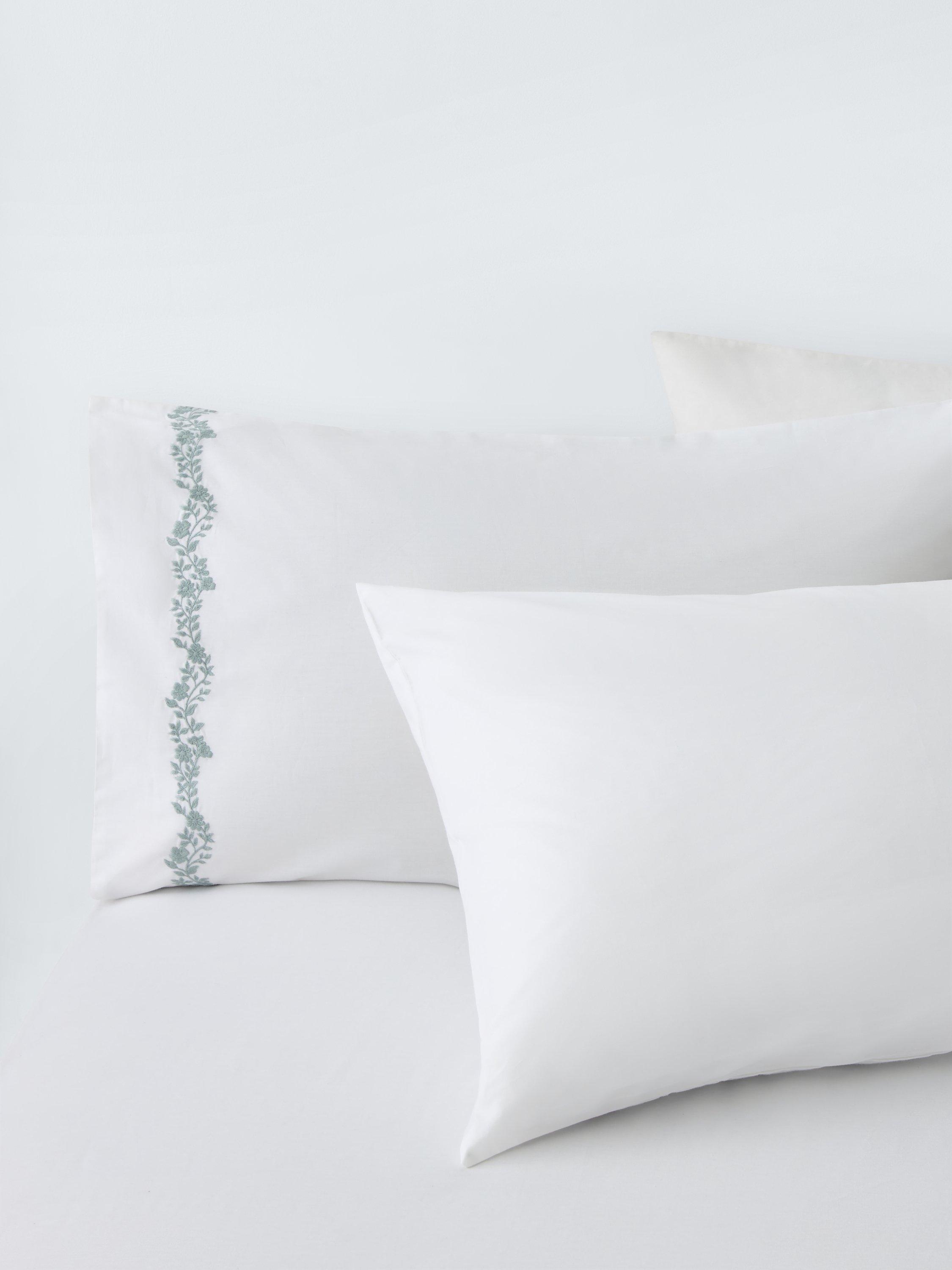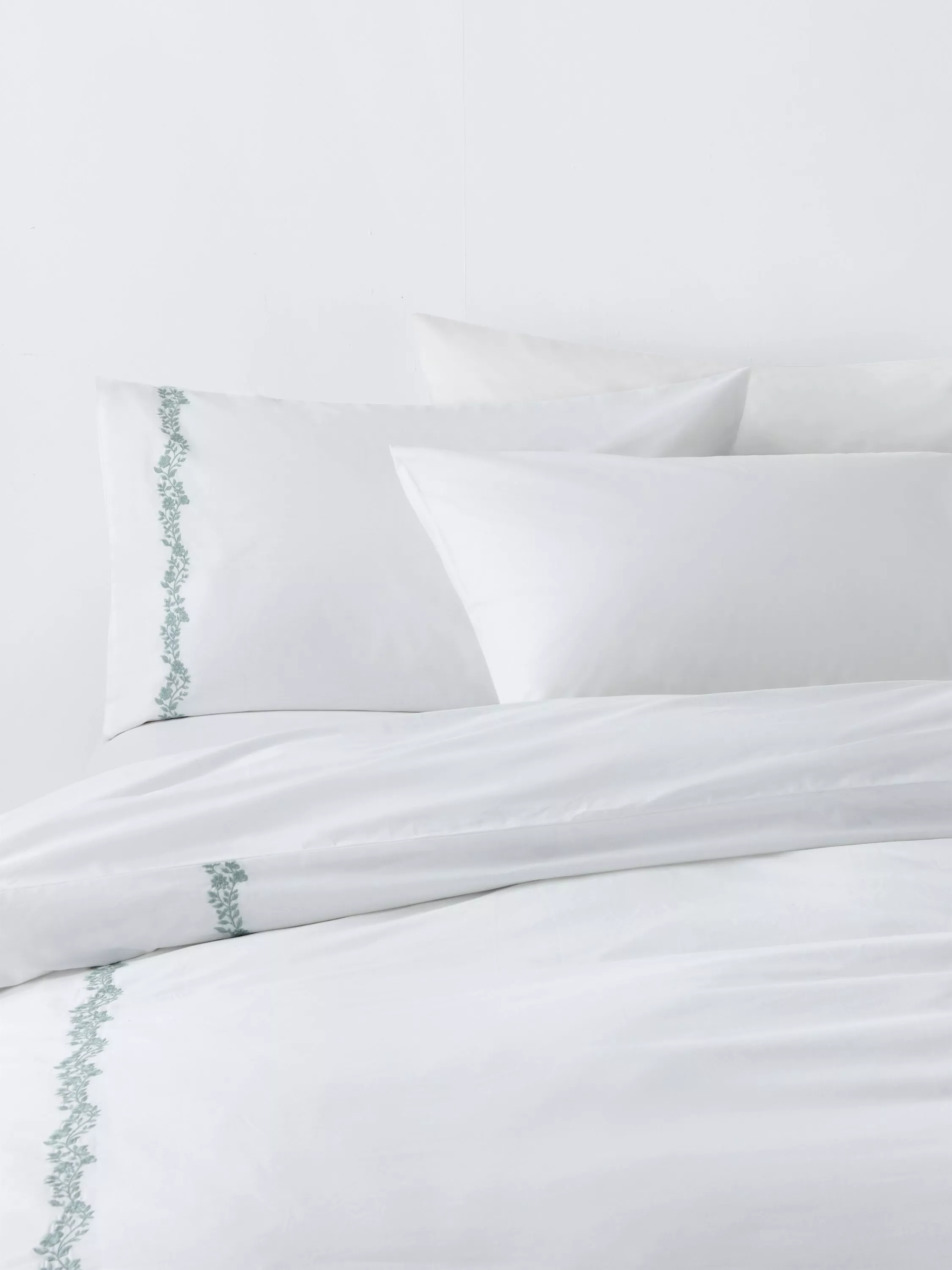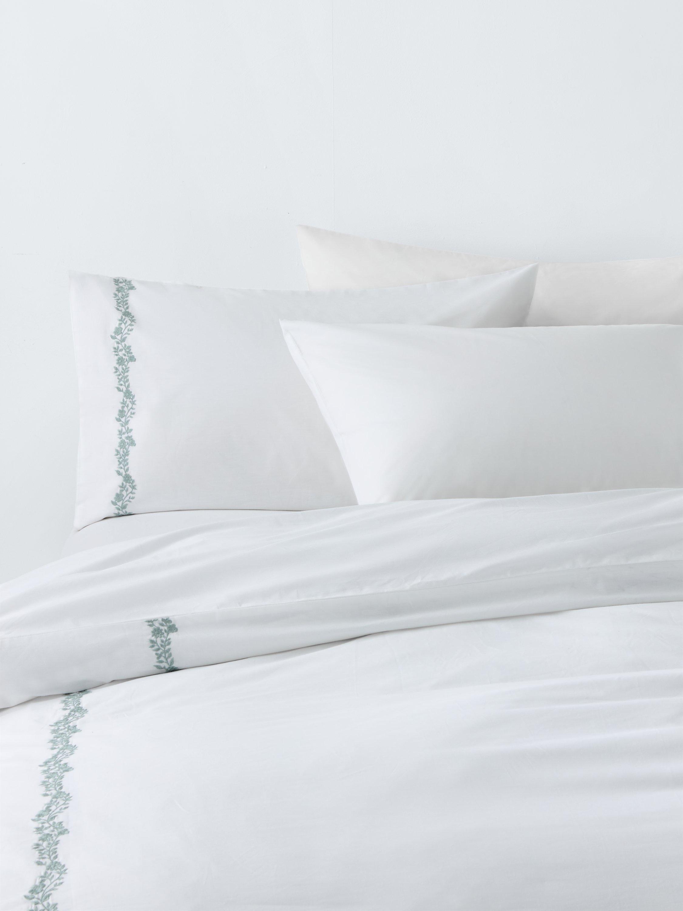 This breathable white cotton bedding features a beautifully embroidered leaf trail detailing for added interest and a whisper of colour.