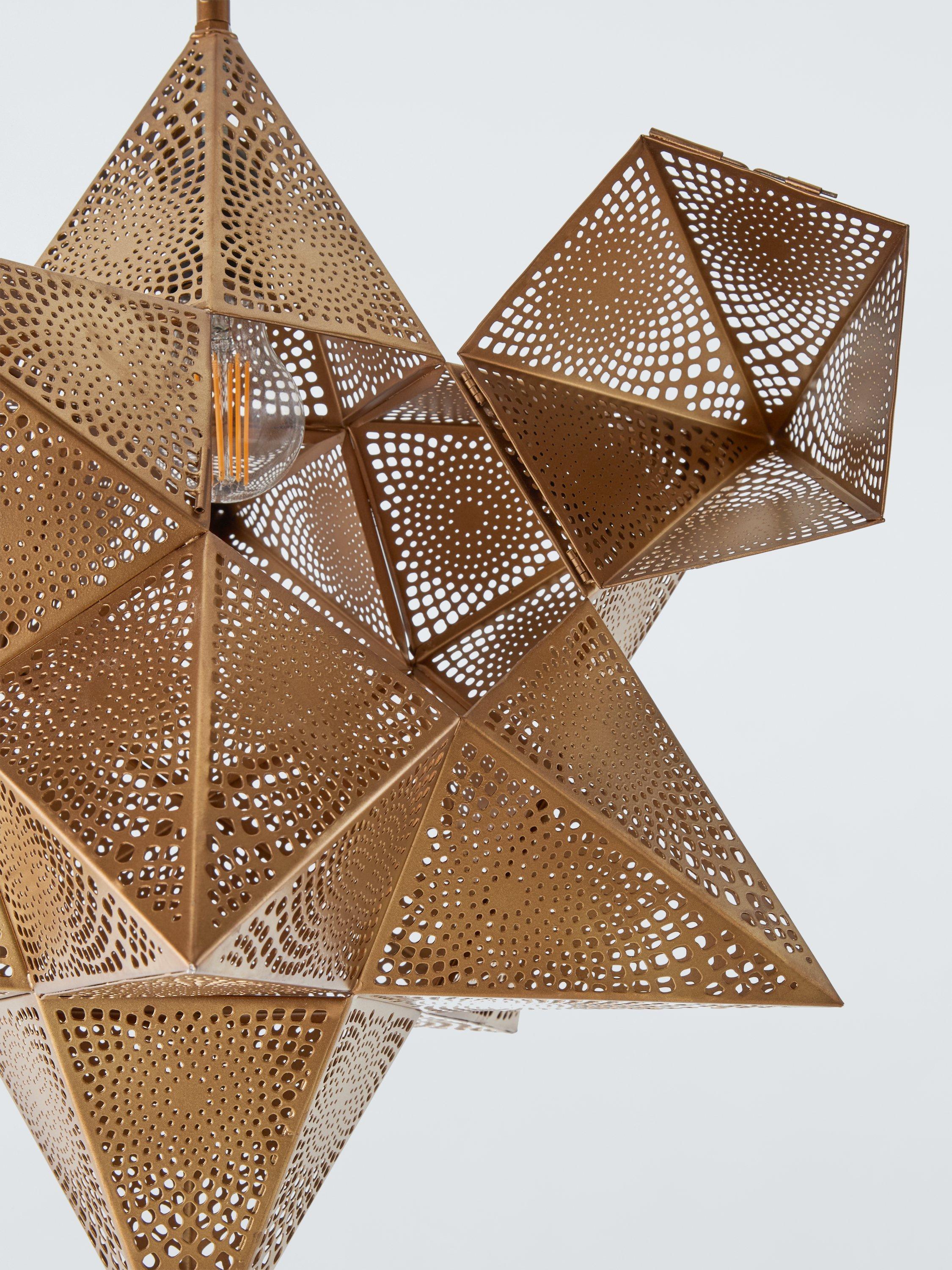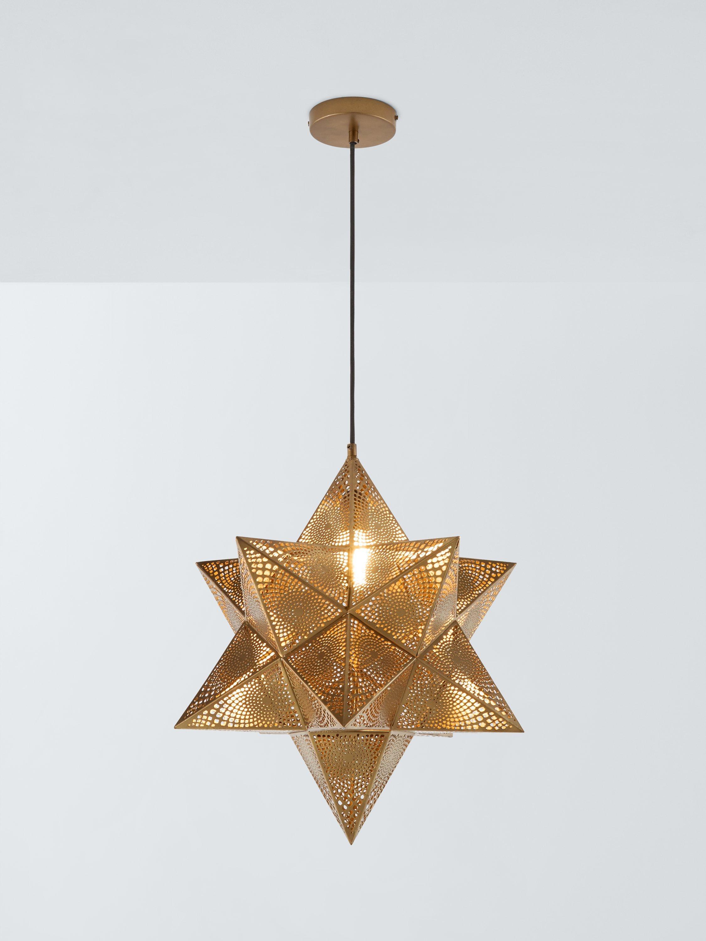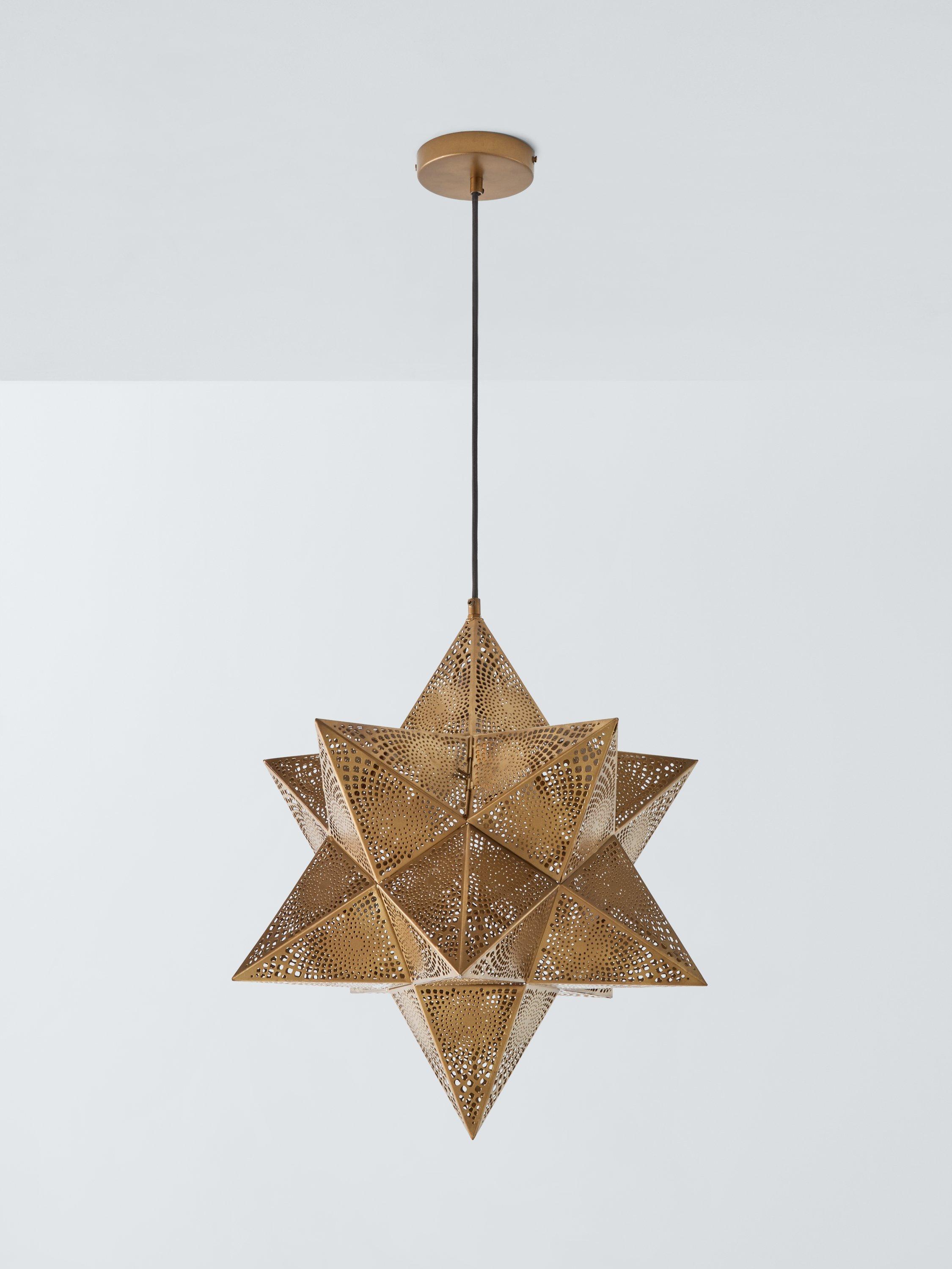 This star shaped pendant has an intricate design allowing the light to shine through and create patterns on the ceiling, a perfect addition to any room.