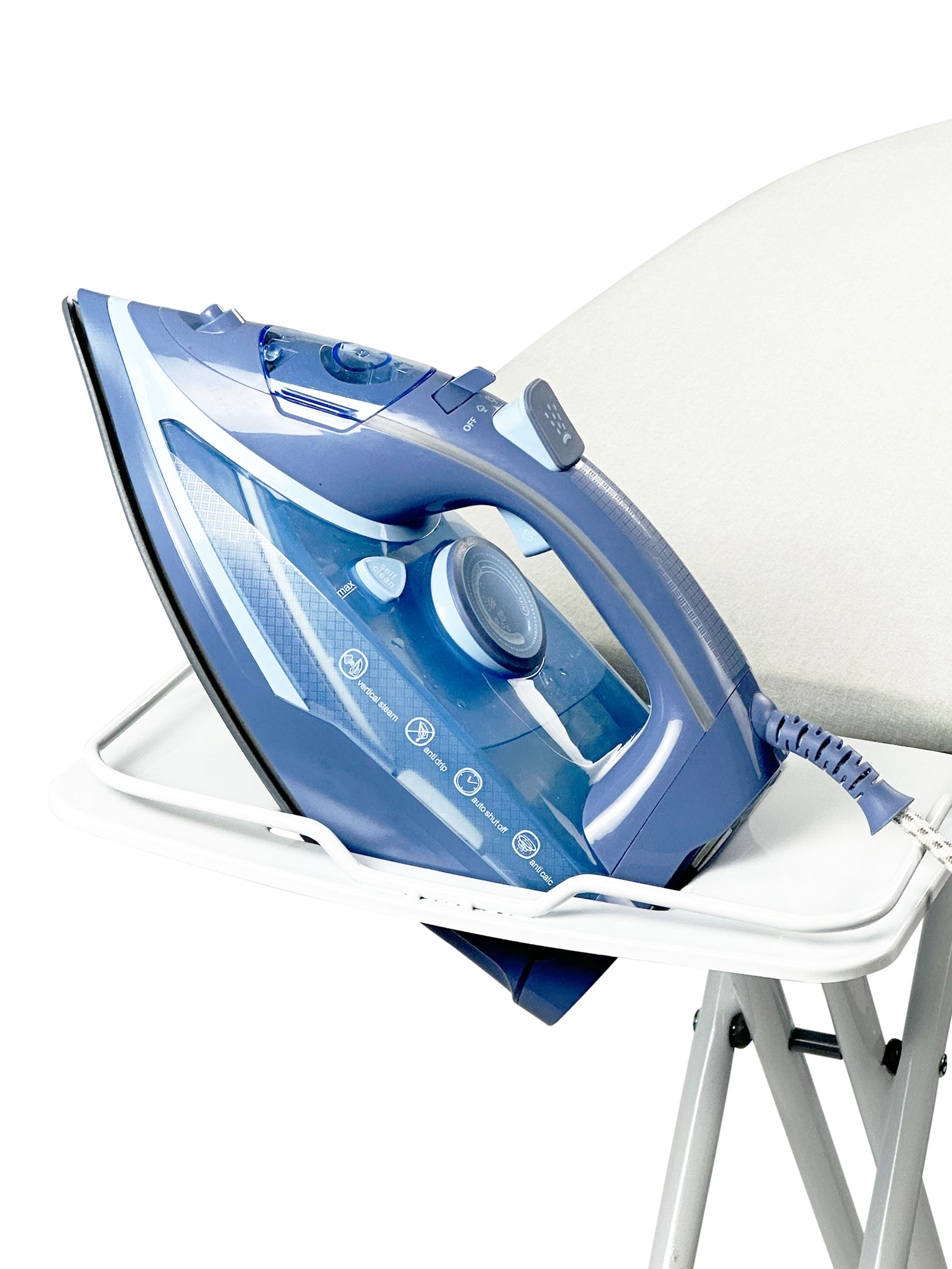 The iron rest is designed for an iron to sit at a 45-degree angle on the silicone pads. The silicone pads slow the rate of heat transfer protecting your ironing board and iron.