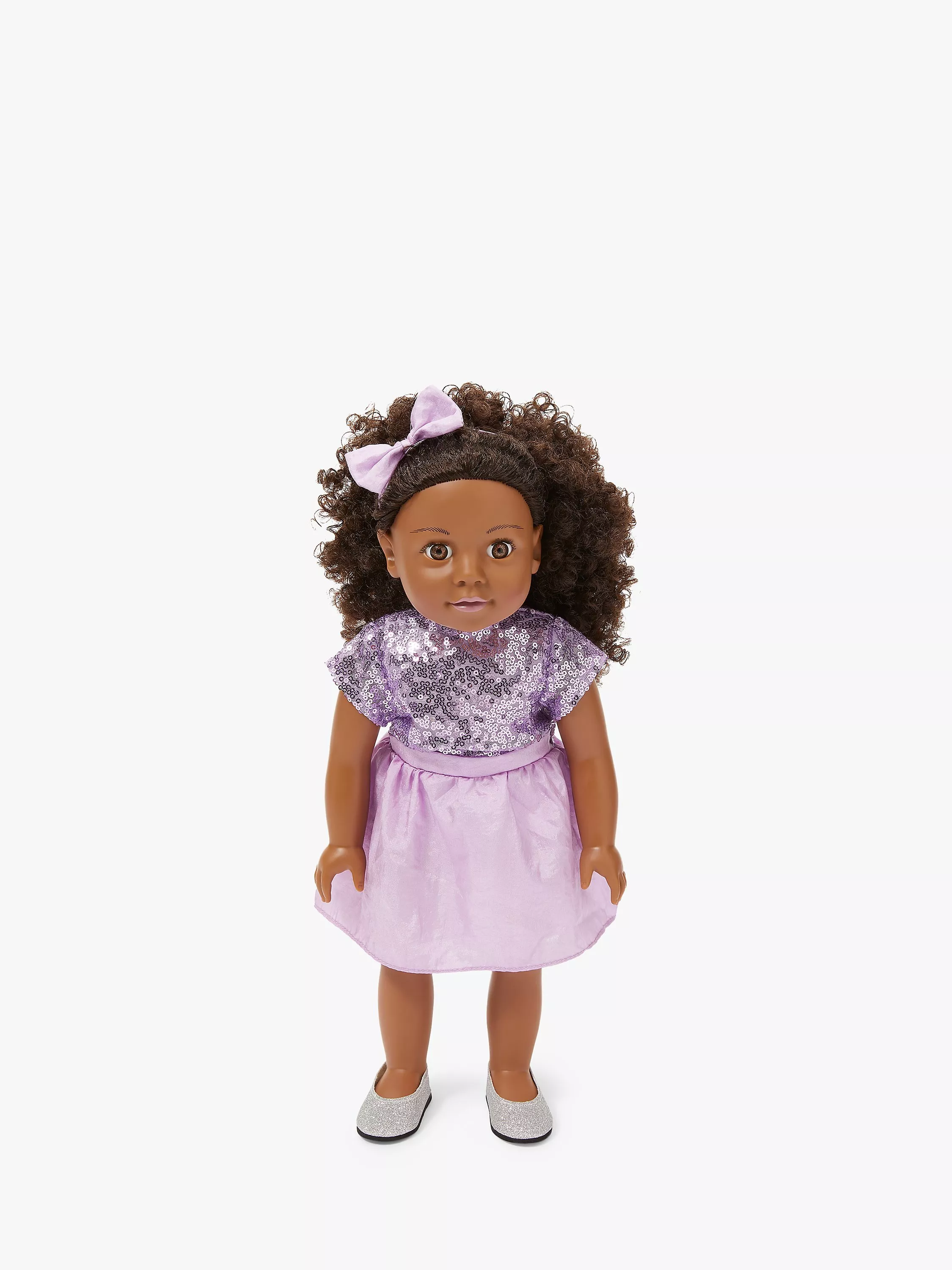 This pretty playmate looks extremely lifelike, with her eager-looking face and long curly brown hair. Standing 46cm/18” tall, Isabelle is wearing a pretty dress, with a sequinned top and bow at the front.