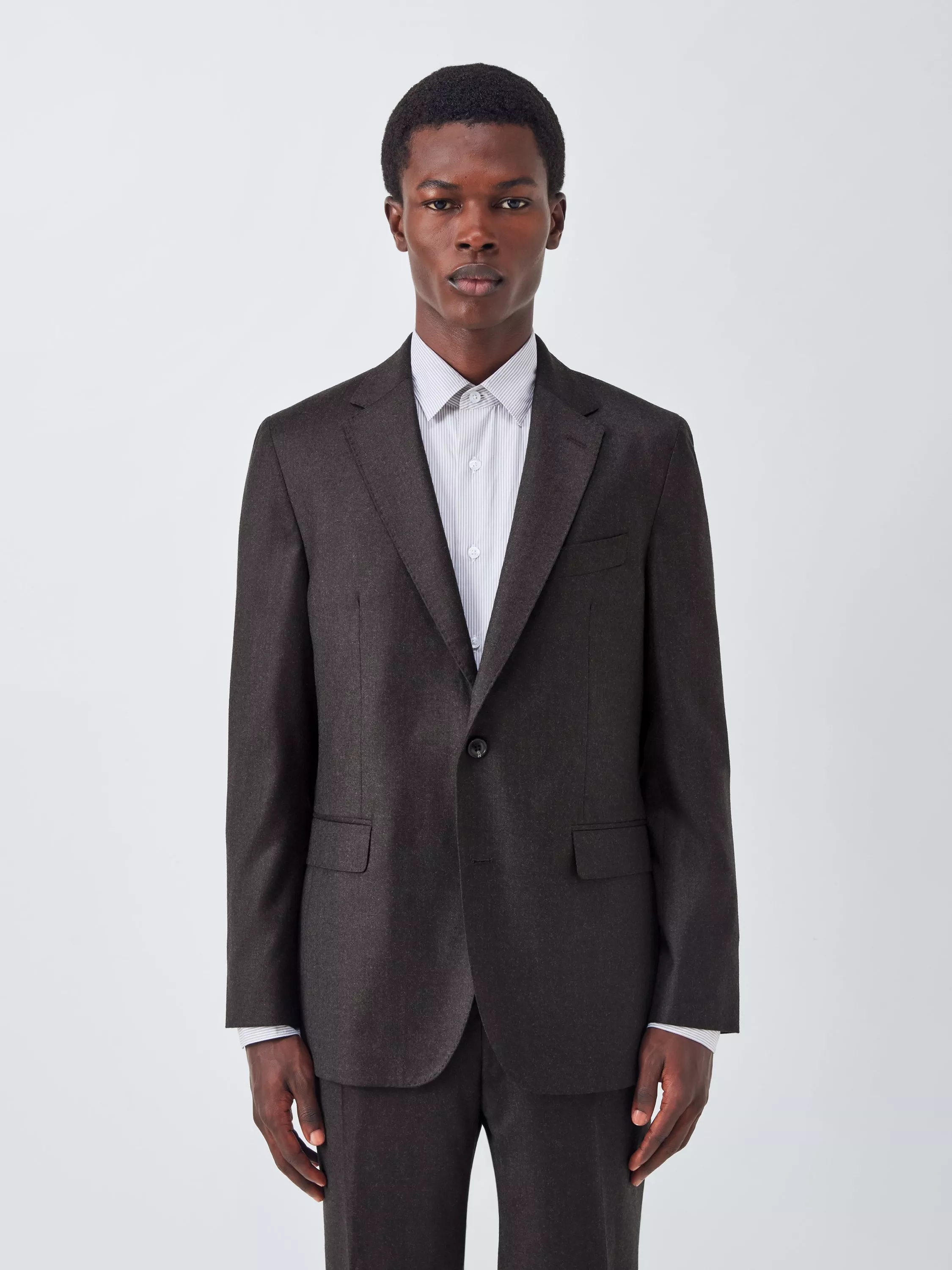 Flannel fabric suit jacket in a single-breasted style. Made with a notch lapel, button fastening and with buttons on the cuffs. Lined inside for comfort, this jacket has a double vent at the back, flap pockets at the hip, and a single welt pocket on the left chest.