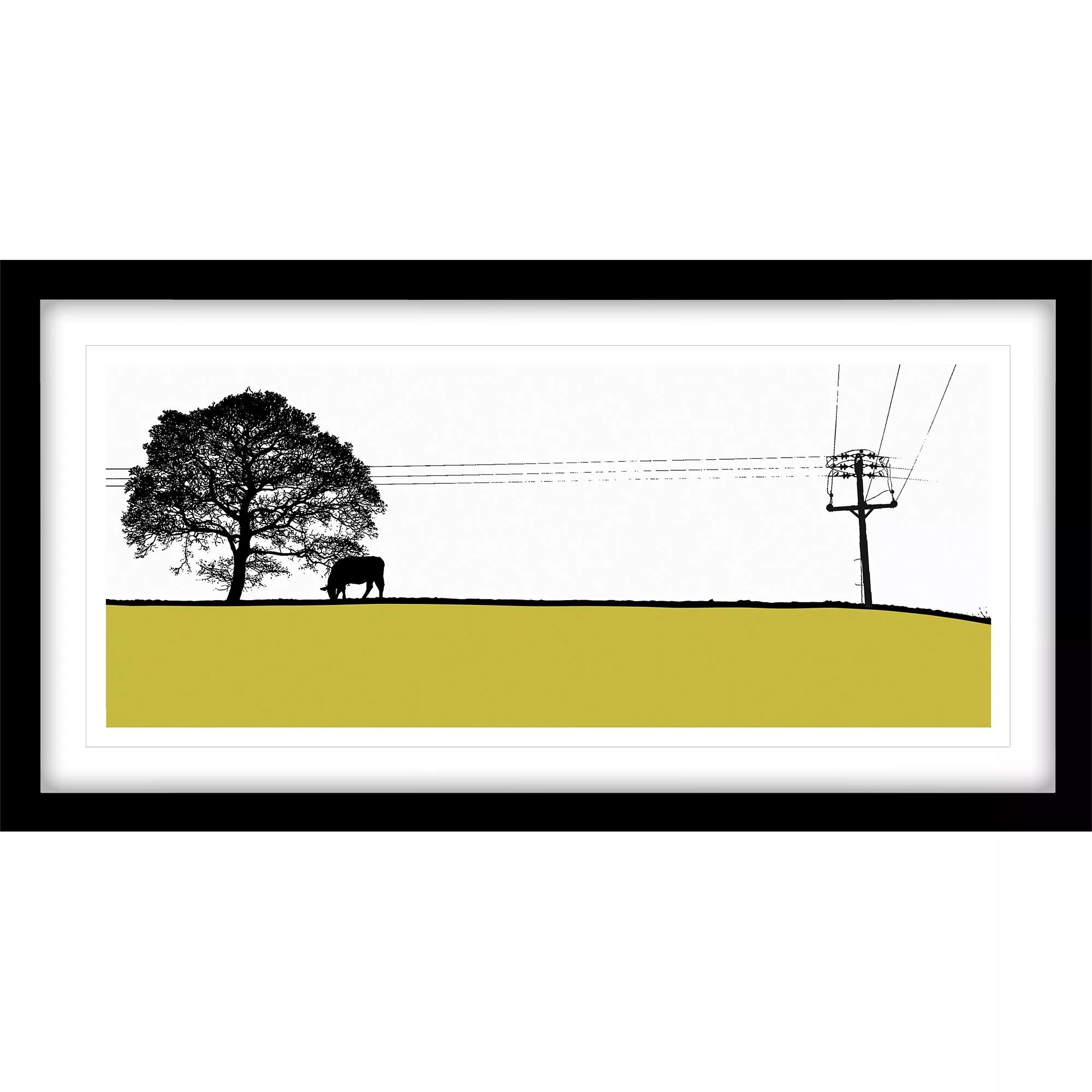 The juxtaposition of man and nature is highlighted by the simplicity of this technique. A tall pilone stands dominating the field with this lonesome cow. A bold black cut out is contrasted with the bright white background, drama is added with the citrus yellow block of colour.